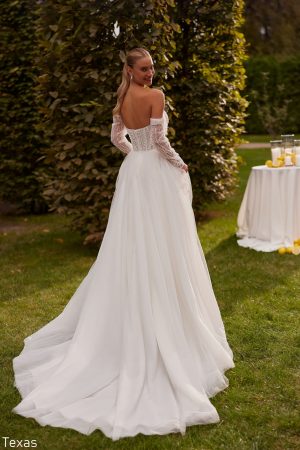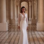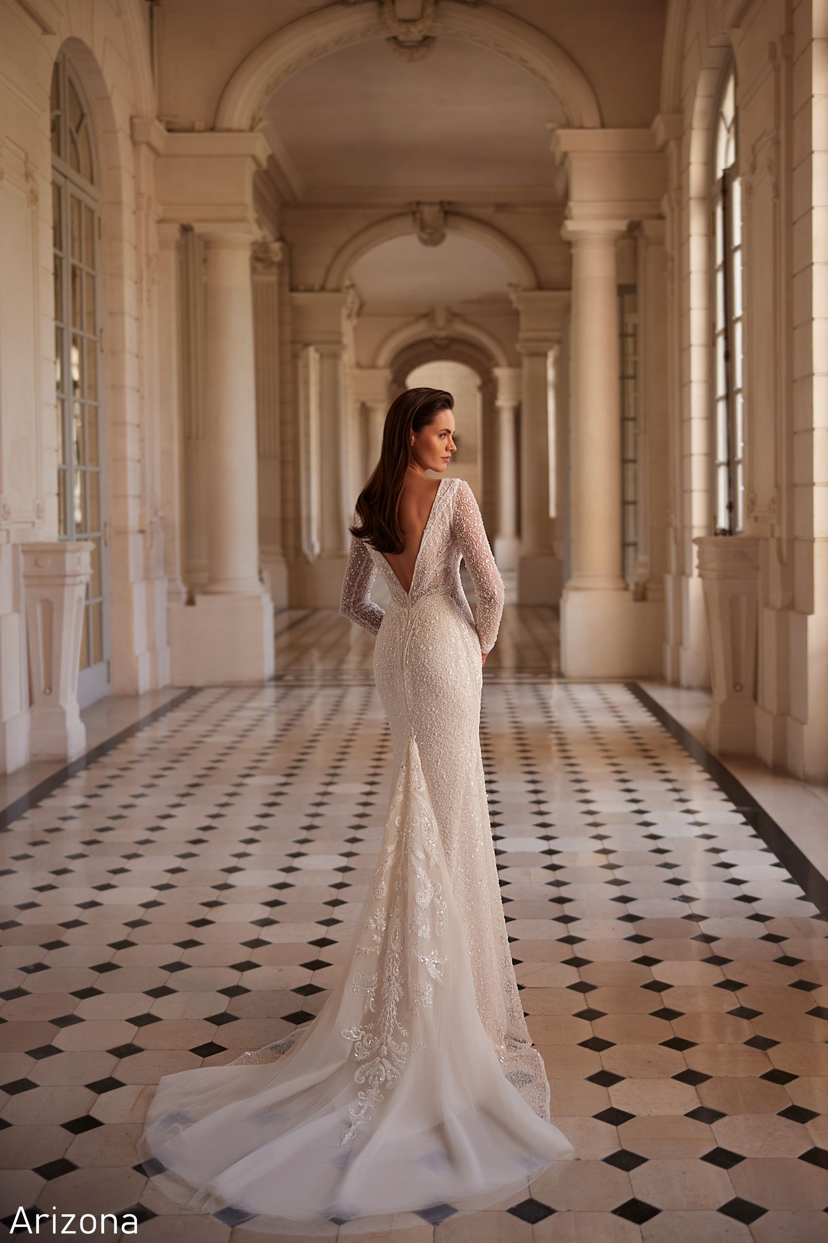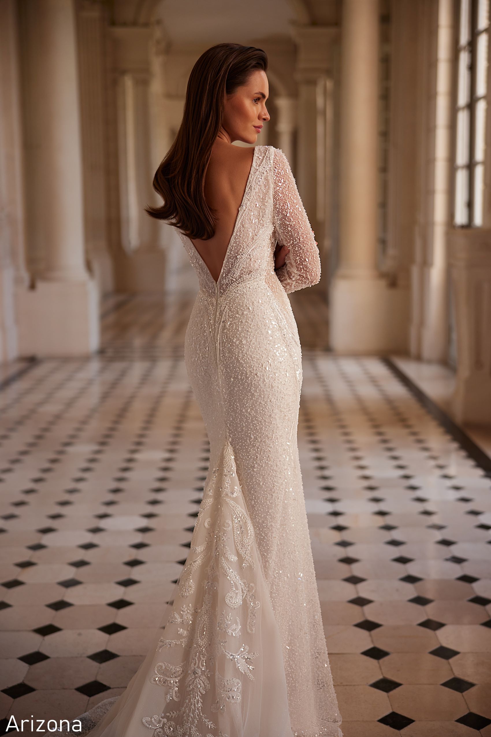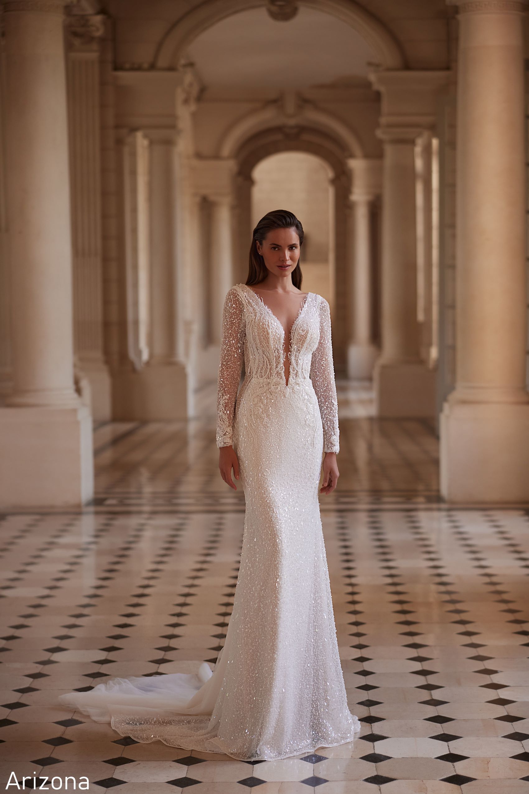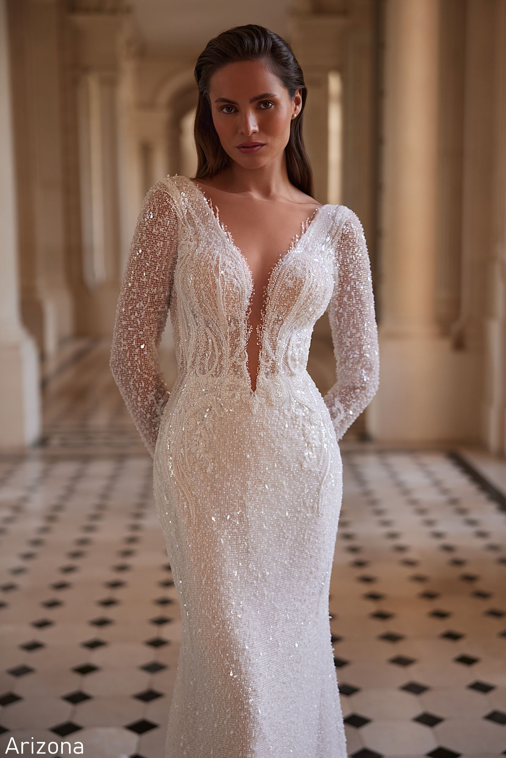 Arizona dress is an elegant long-sleeve wedding dress completely embellished with sequins. A deep V-neckline adds sophistication and fitted silhouette accentuates the bride’s figure. In this dress, your wedding is guaranteed to be royally beautiful and luxurious!