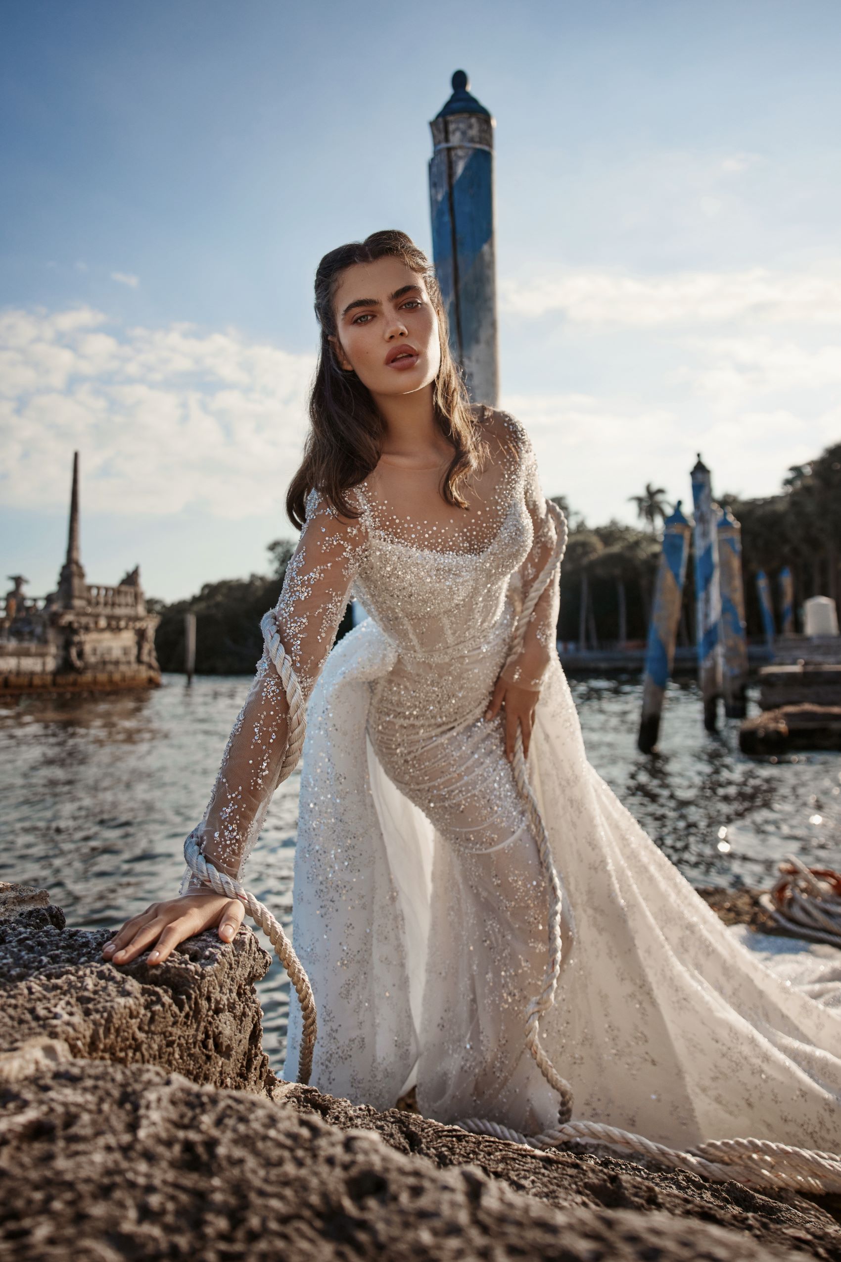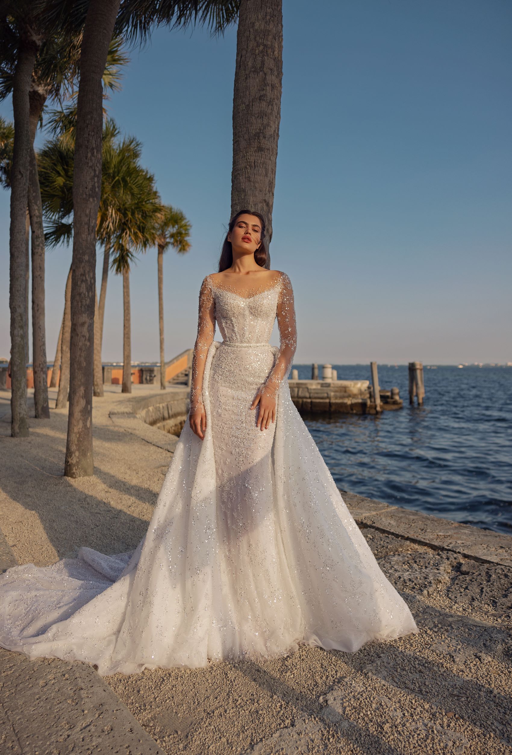 Arizona wedding dress is a vision of ethereal beauty. The fitted bodice and sweetheart neckline flow seamlessly into a stunning mermaid silhouette. The delicate lace and tulle skirt create a soft and feminine silhouette. The detachable overskirt adds versatility to the design, making it perfect for the modern bride who wants options on her special day. The delicate patterned floral applique adds a touch of elegance and sophistication, making this dress a true showstopper. Whether you choose to wear it with or without the overskirt, Arizona is sure to leave a lasting impression.