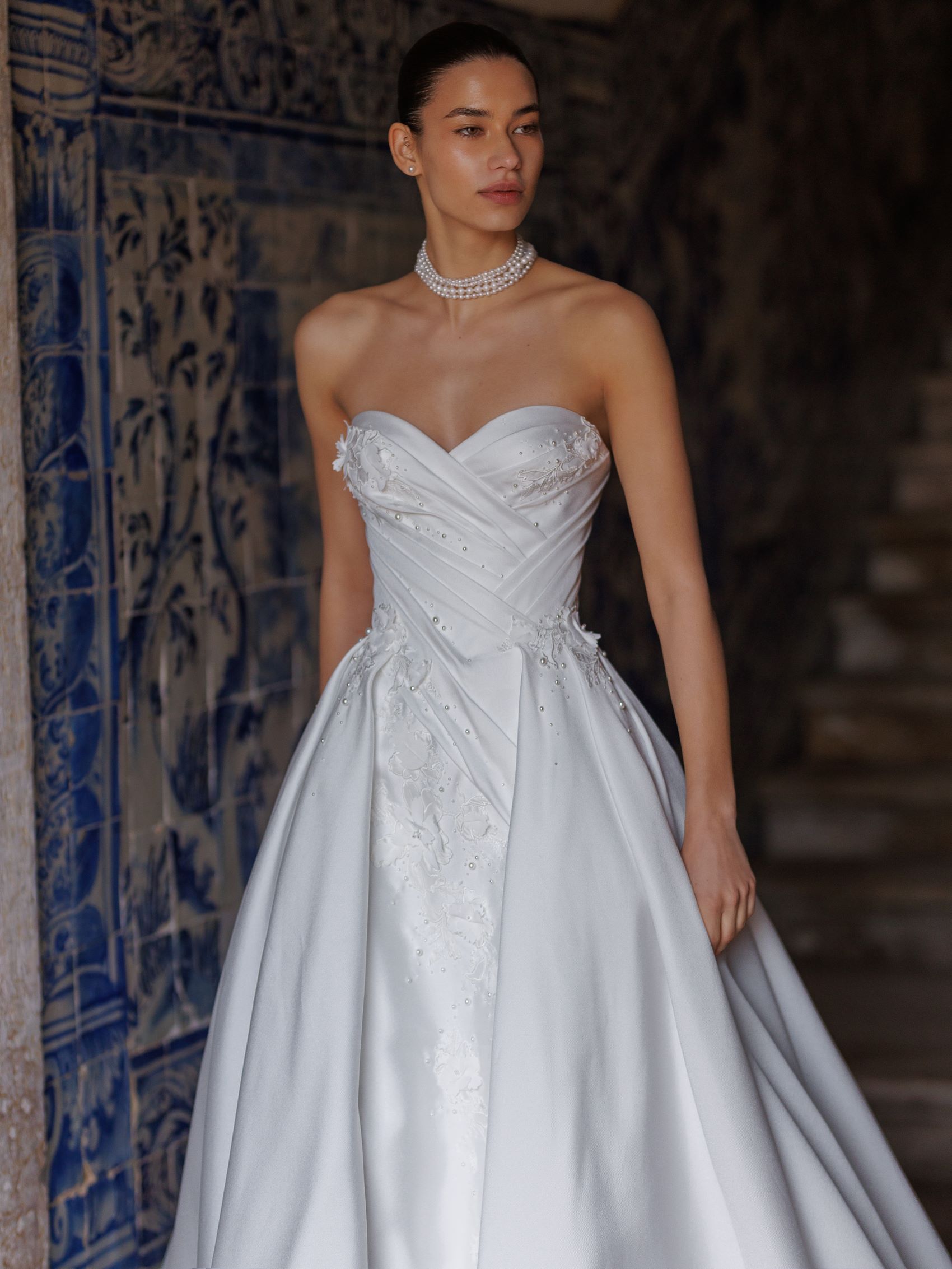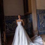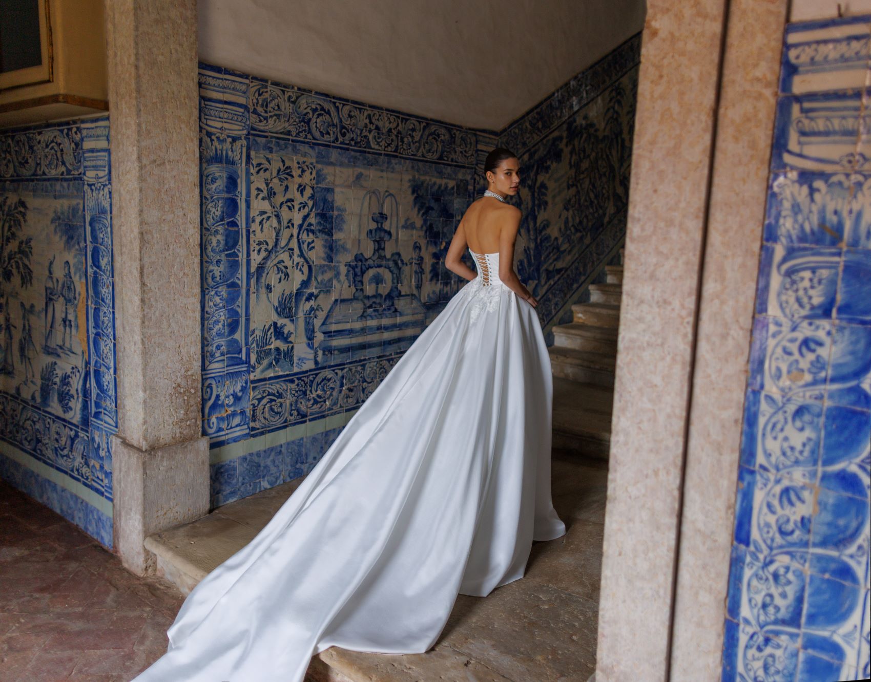 Fusta amplă din satin, completată de trena regală, transformă această rochie într-o apariție memorabilă, destinată mireselor care visează la un look impunător, dar rafinat. Birgit este despre feminitate, grație și puterea de a străluci într-o zi unică. ✨