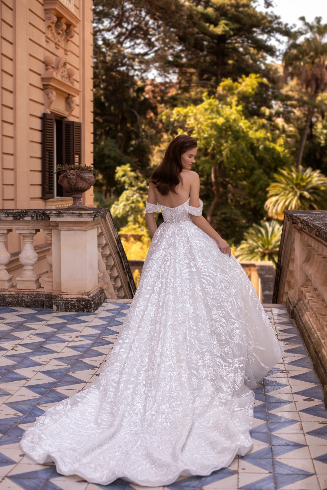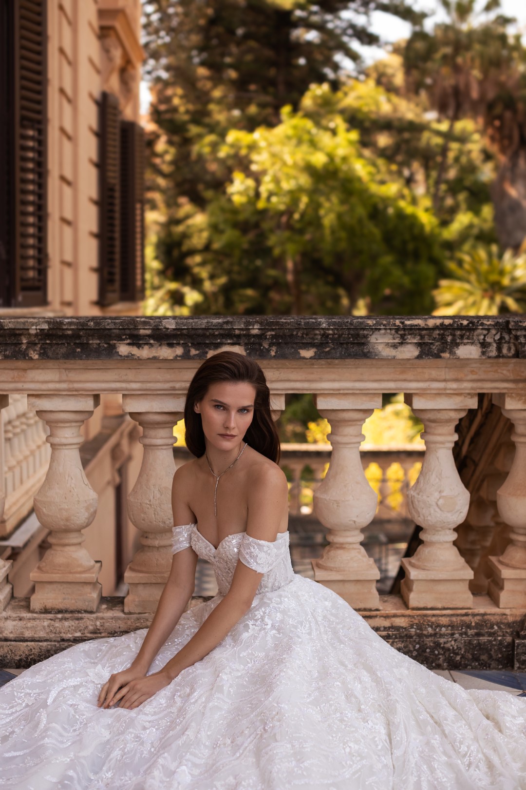 Bosco este o printesa croita din tiul si dantela pretioasa. Bretelele cazute usor pe umeri confera senzualitate. Trena fastuoasa adauga acestui model un farmec aparte.