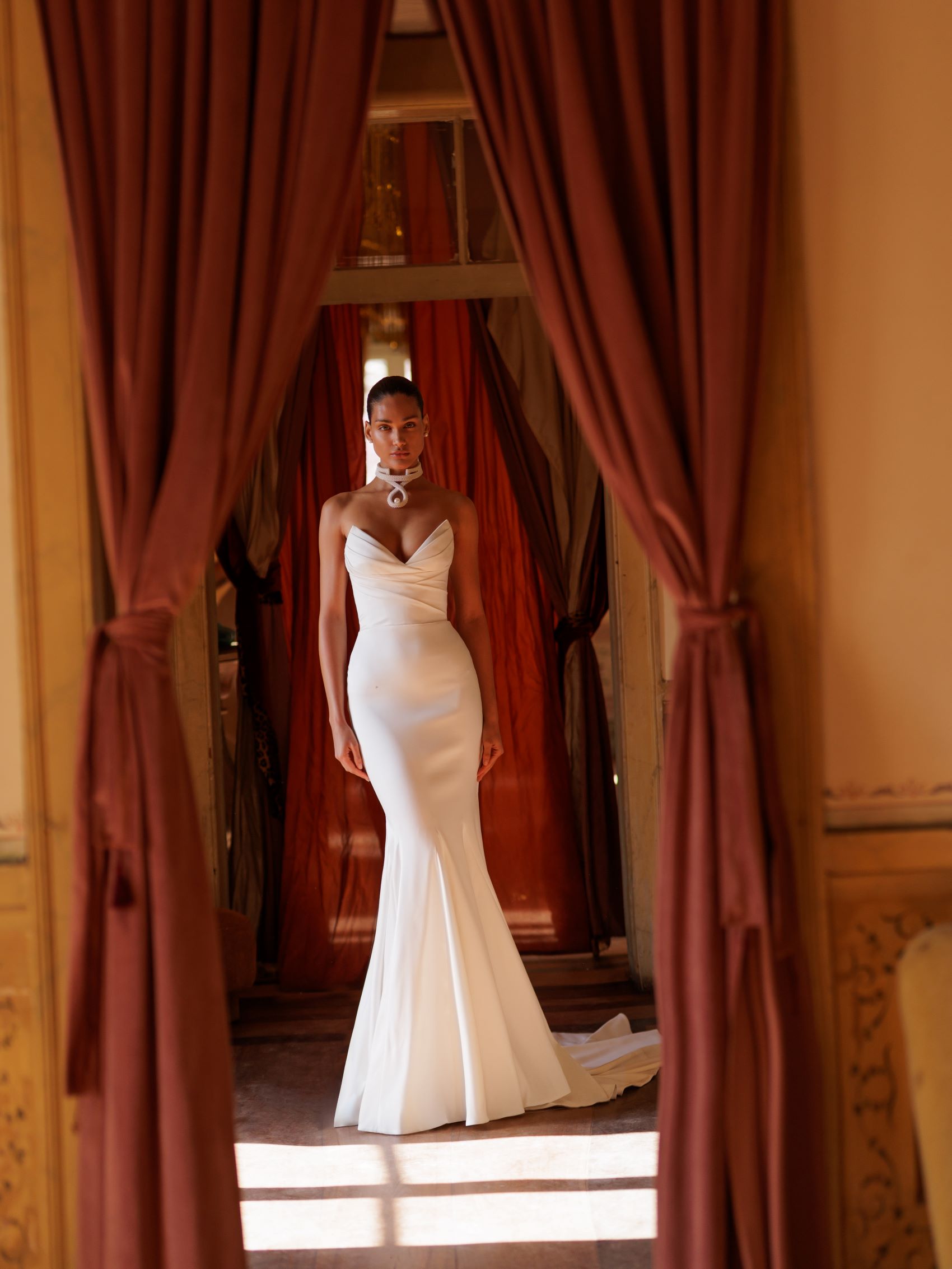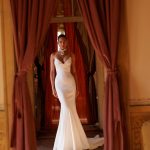 Bronze este rochia dedicată mireselor care își doresc un look senzual, dar rafinat. Silueta tip sirenă evidențiază formele feminine într-un mod elegant, iar decolteul adânc în formă de inimă aduce un aer seducător și sofisticat. Drapajele fine de pe corset completează armonios designul, creând o linie fluidă, plină de grație.