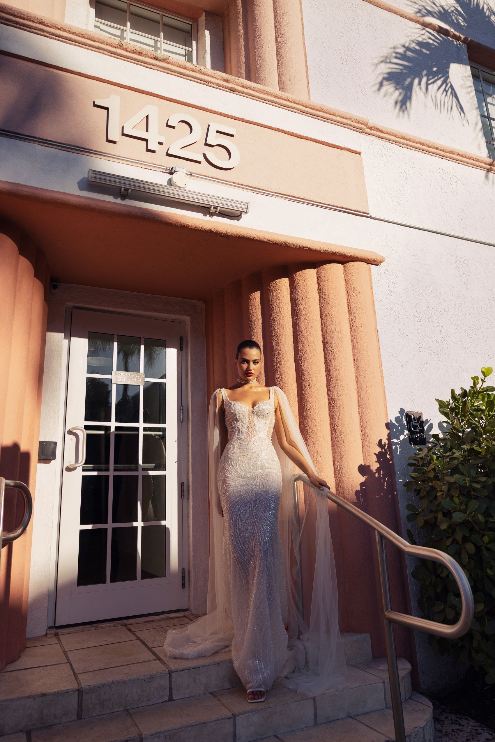 This stunning dress is a lace mermaid style that features delicate straps and a sweetheart neckline. The tulle detachable elements on the shoulders resemble wings, adding a touch of whimsy and romance. The fitted bodice is adorned with intricate beading and embroidery with sheer nude side panels adding sexiness, while the femininely structured mermaid skirt creates a soft silhouette. Sparkly illusion low-back passes into a neat chapel train that together with the wings creates a fantastic train.