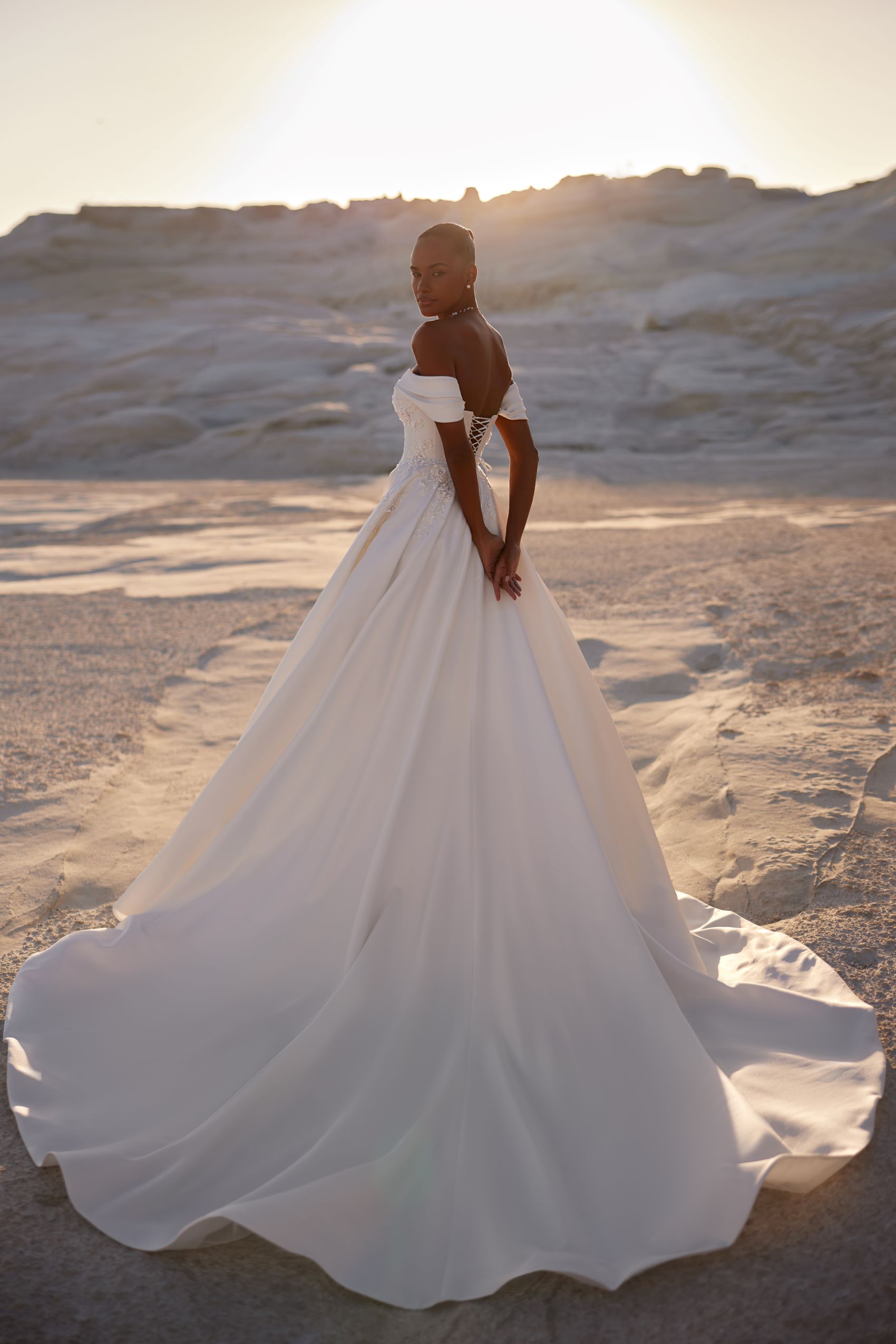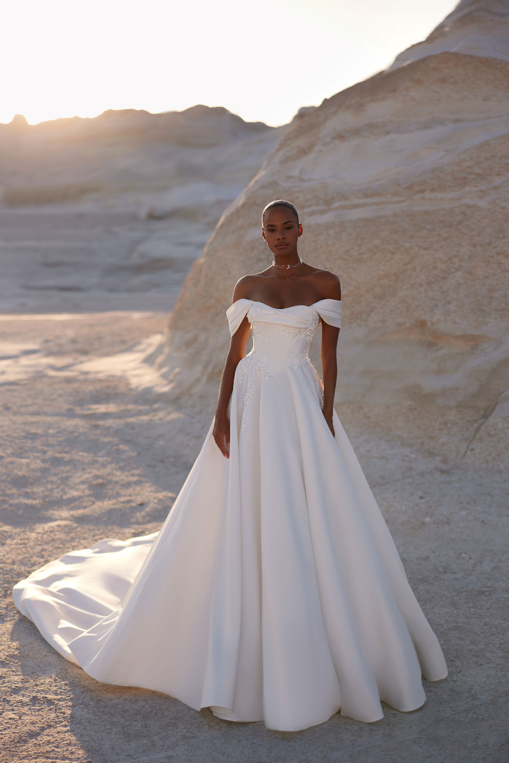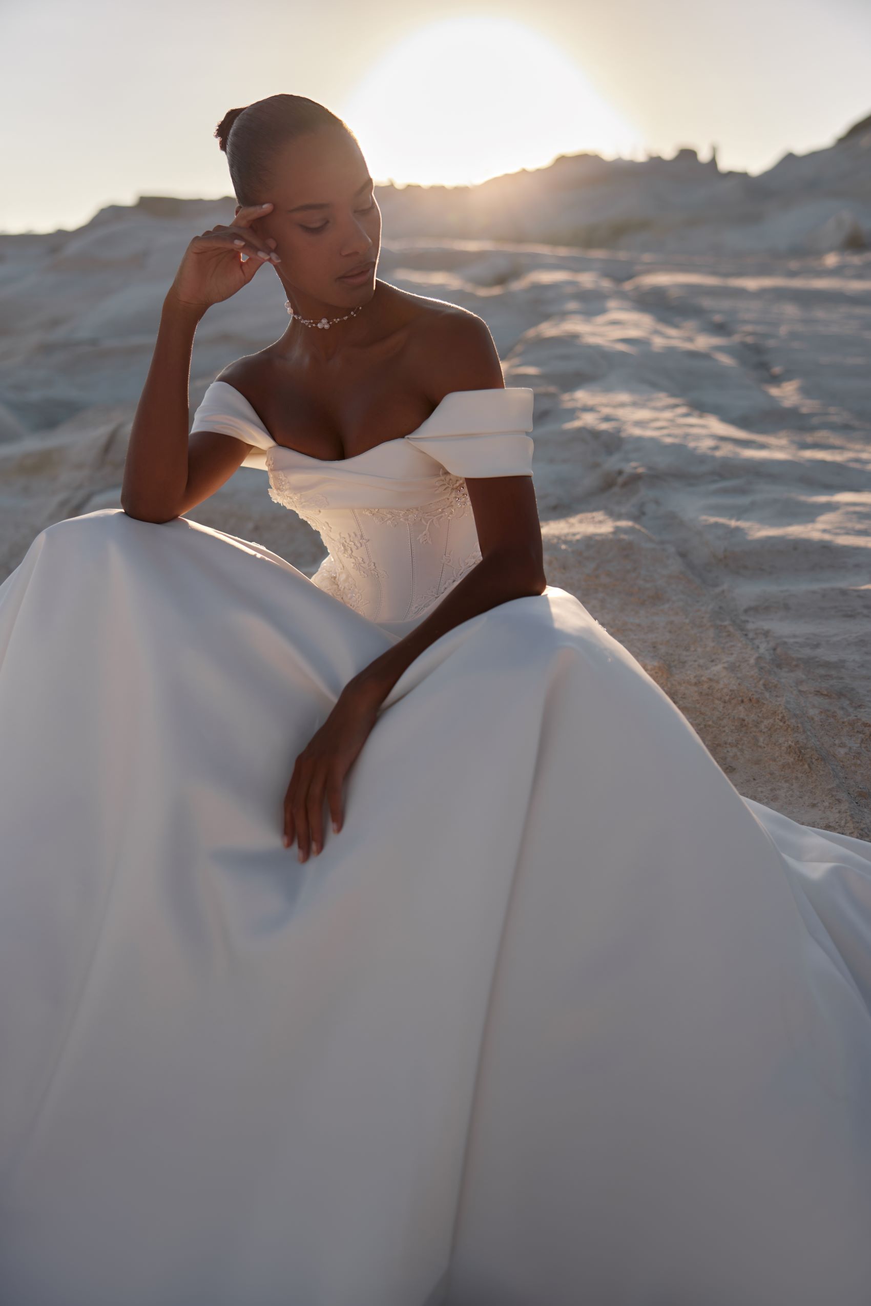 Delicate bridal gown with off-the-shoulders neckline and soft drapery overlaying the top of the corset. The basque waistline creates a flawless silhouette and the floral embroidery adorning the corset on the sides and descending to the skirt adds a touch of natural femininity.