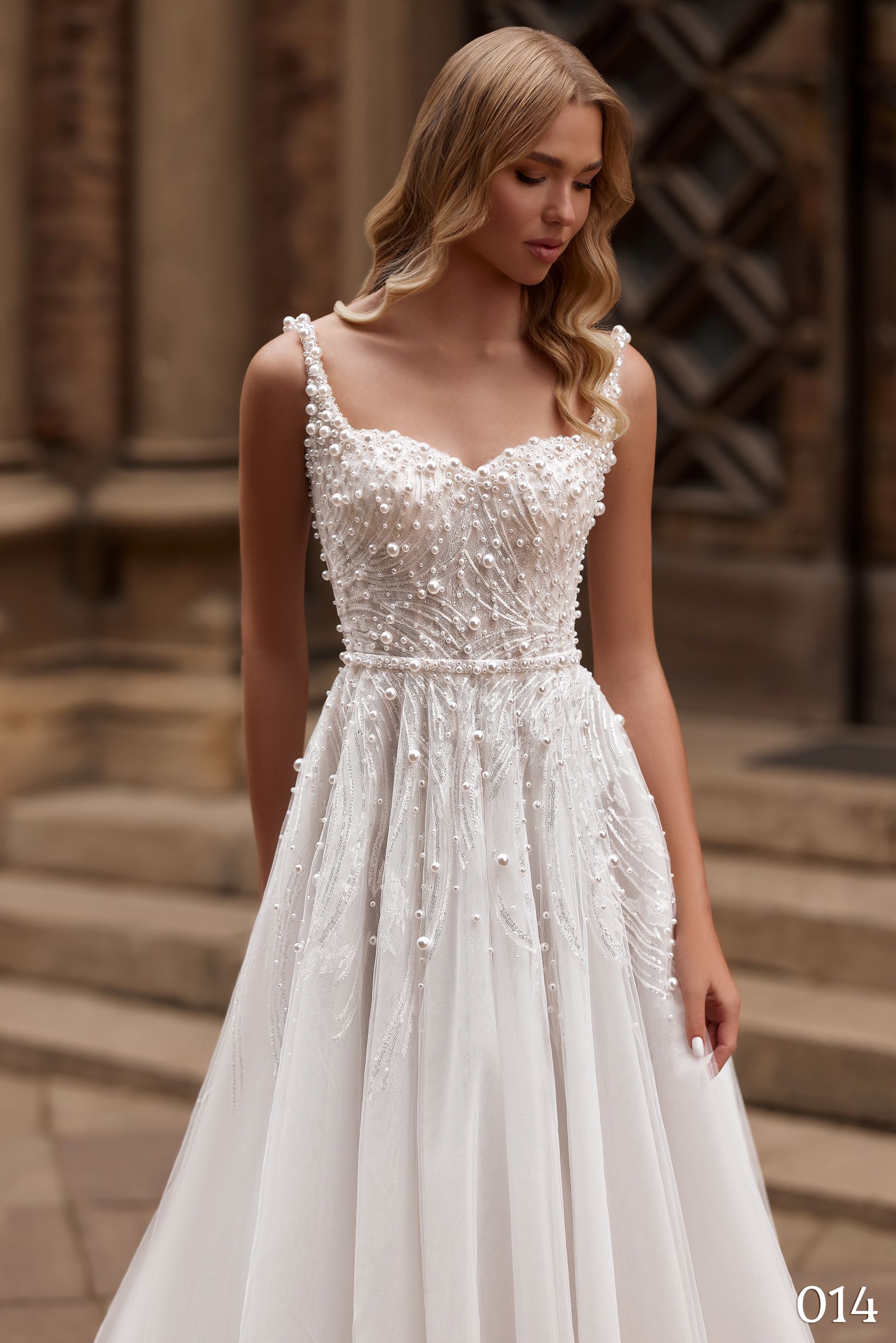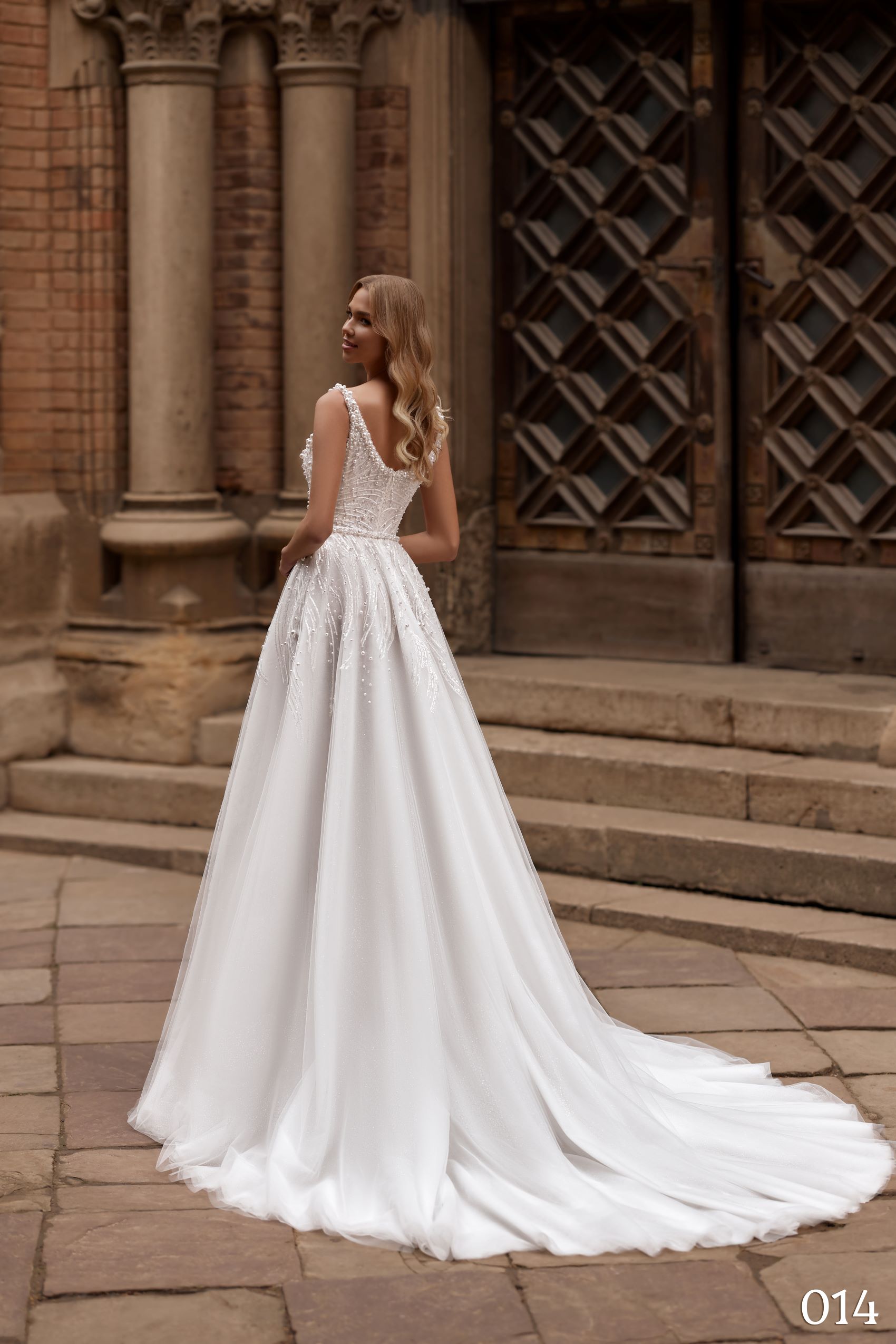 Model 014 este o rochie de mireasă A-line fluidă, ce combină un design modern cu detalii sofisticate, perfecte pentru o mireasă care își dorește o apariție rafinată.