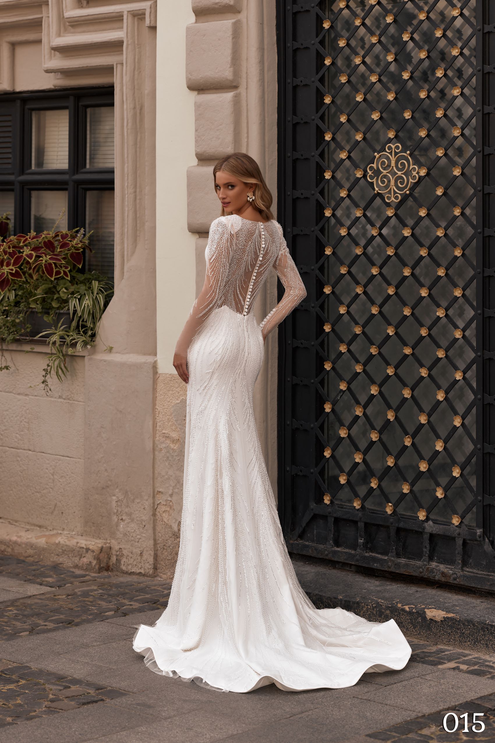 Model 015 este o rochie de mireasă sirenă sofisticată, ideală pentru miresele care își doresc un look sculptural, elegant și rafinat.