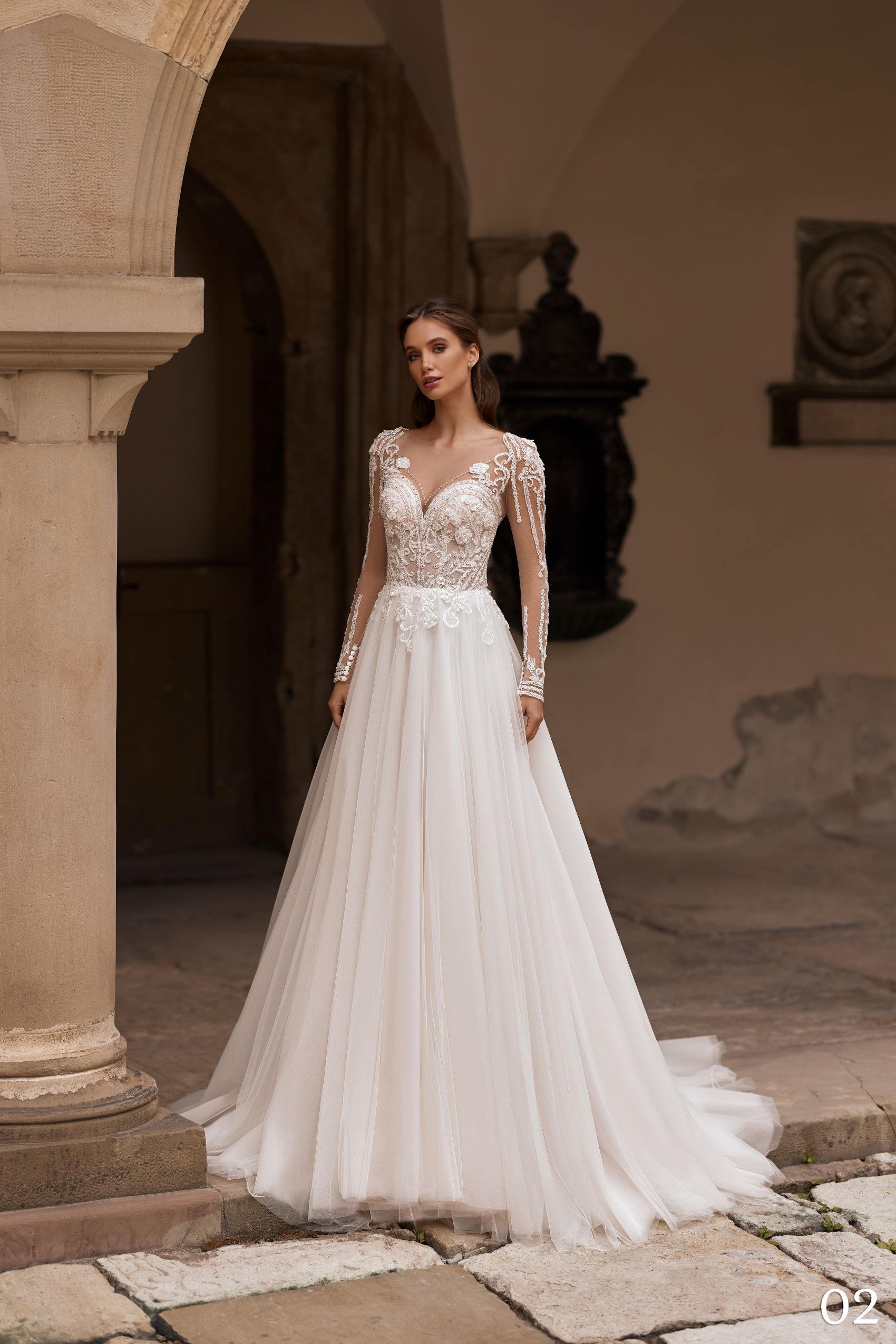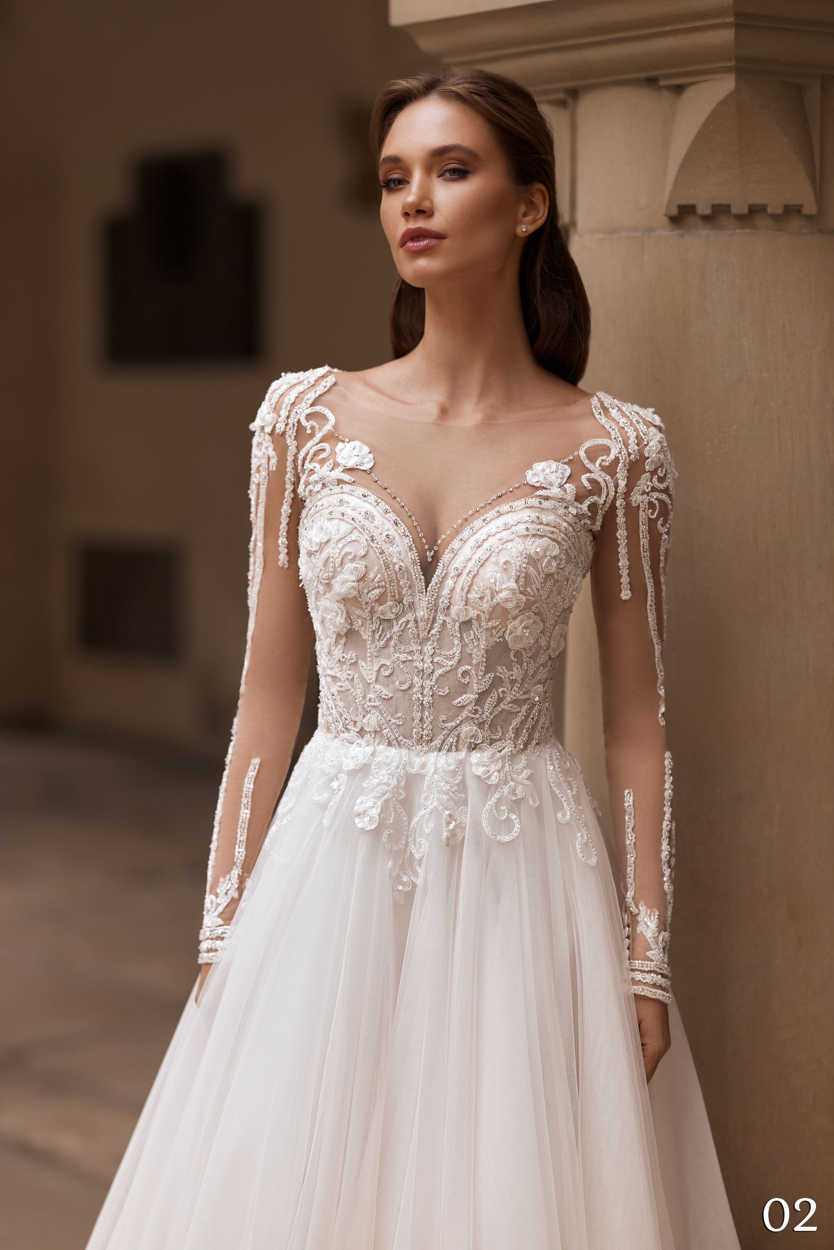 Această rochie de mireasă A-line îmbină rafinamentul dantelei cusute manual cu delicatețea fustei vaporoase din tul. Corsetul detaliat și mânecile lungi oferă un aer nobil, perfect pentru o apariție memorabilă.