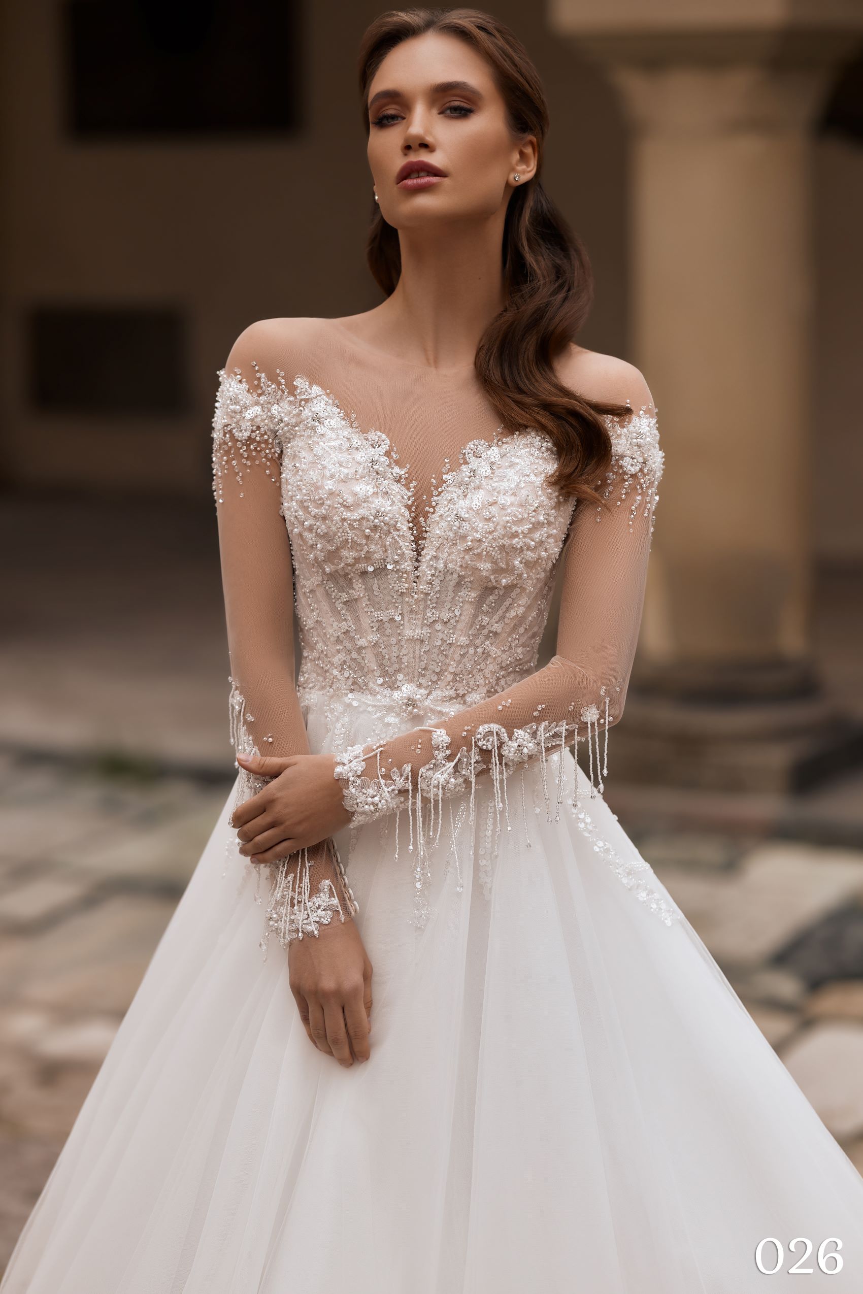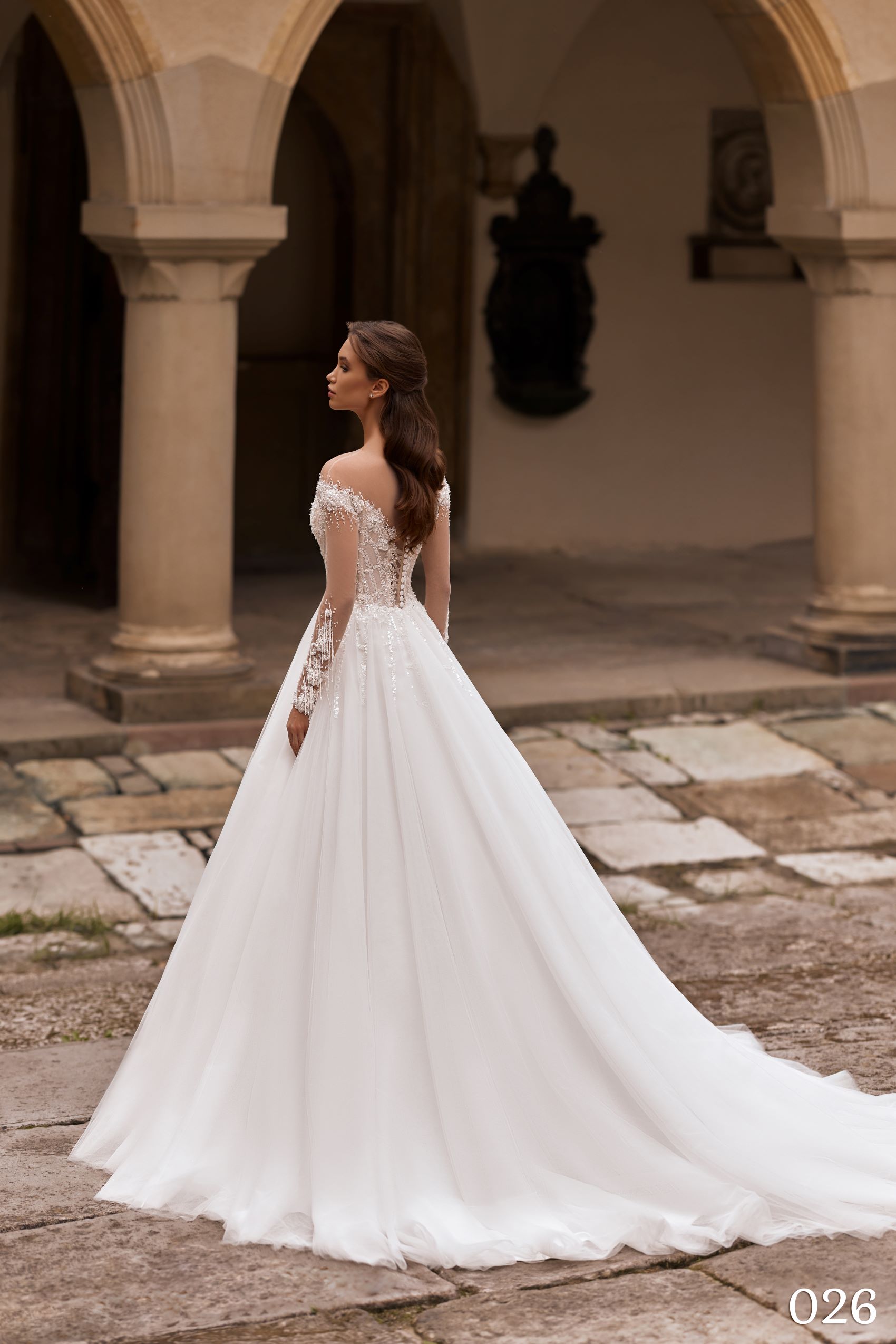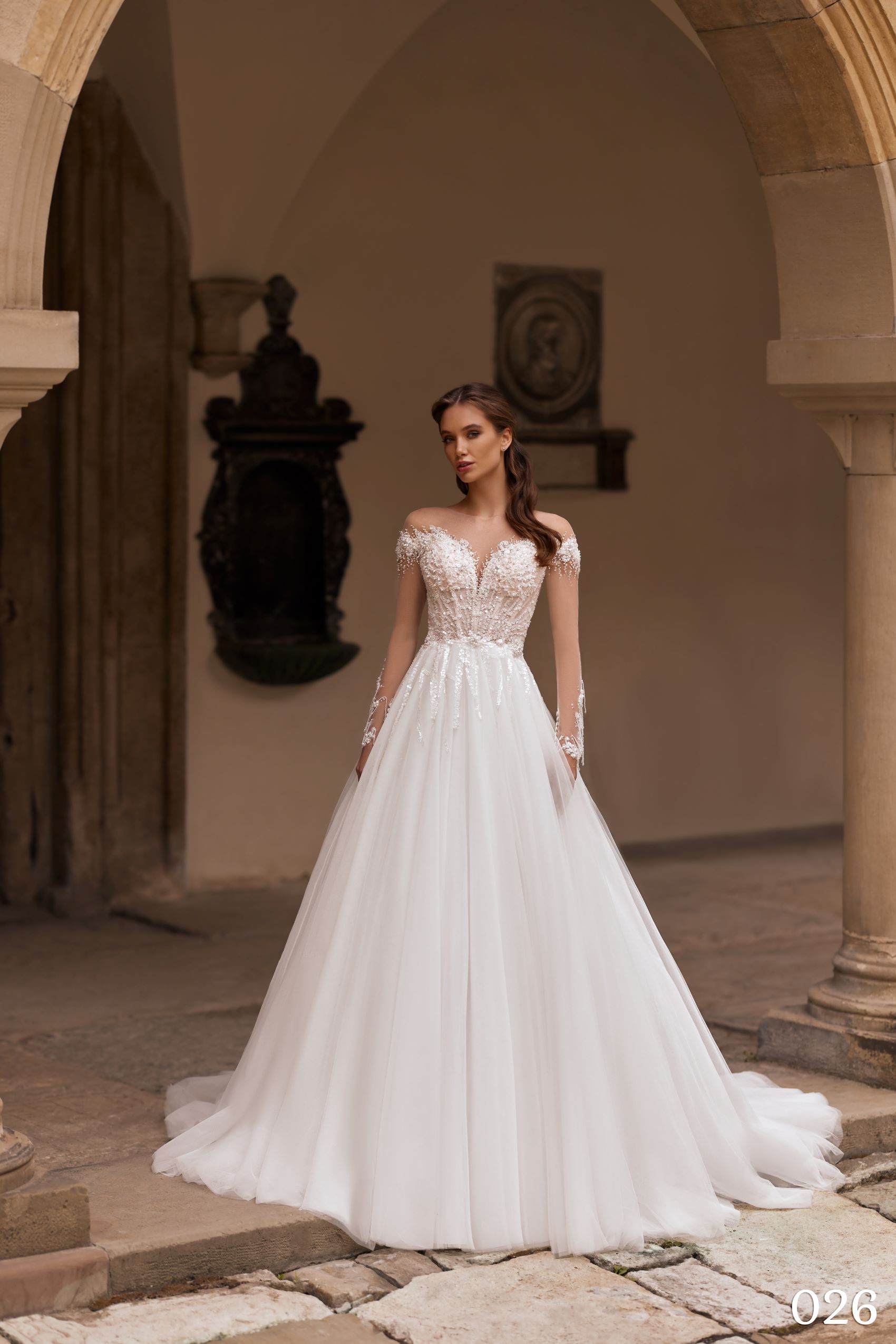 Modelul 026 este o rochie de mireasă romantică și sofisticată, perfectă pentru miresele care își doresc un look angelic și diafan, cu detalii lucrate manual.