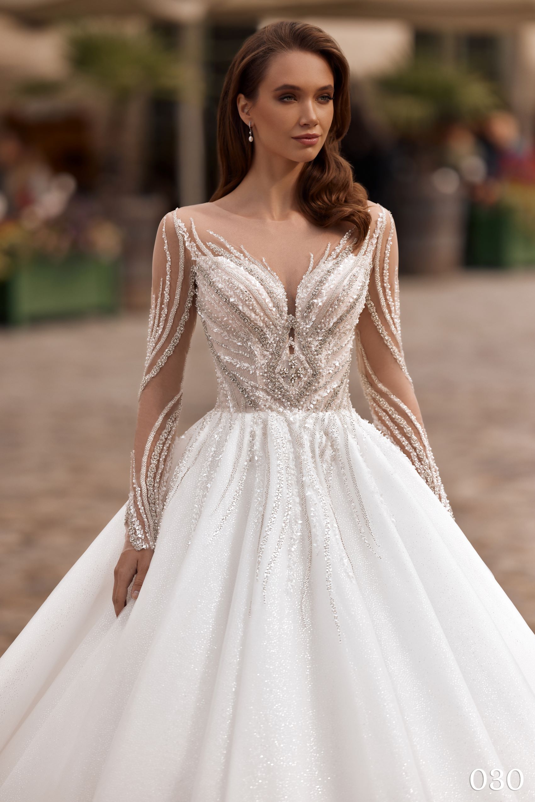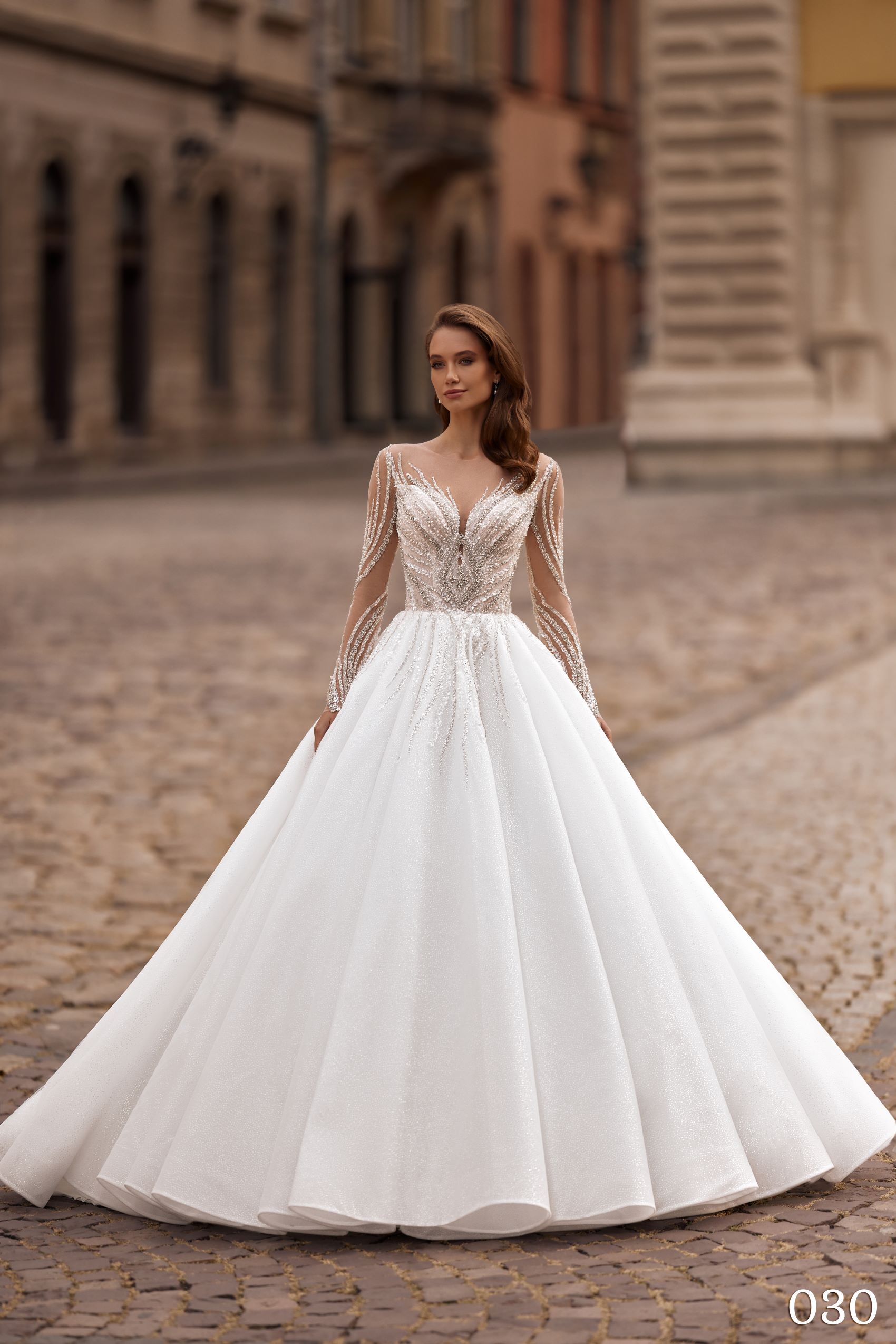 Modelul 030 este o rochie de mireasă tip prințesă, cu un design sofisticat, ideală pentru miresele care visează la o apariție regală. Fusta voluminoasă, realizată din material premium, se așază spectaculos în valuri fluide, oferind un efect impresionant chiar și fără pliuri adânci în talie. La baza acesteia, rijelina conferă structură și stabilitate, menținând un volum armonios.