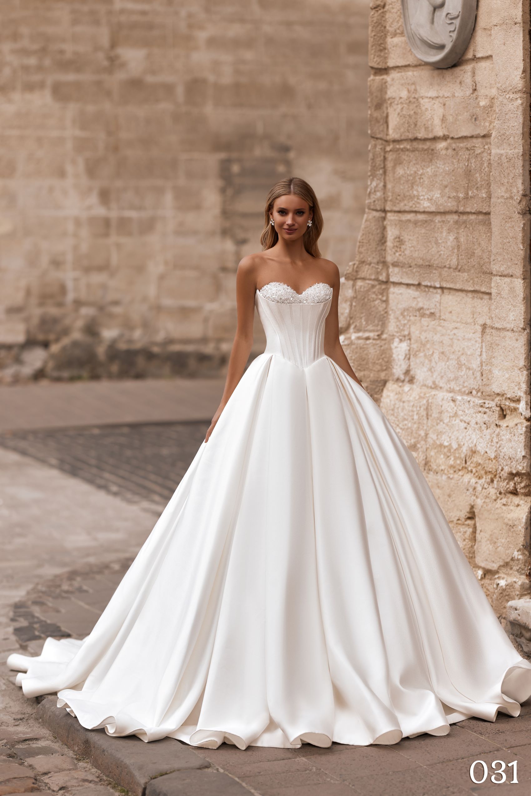 Această rochie este alegerea perfectă pentru miresele care își doresc o apariție regală, cu un design ce îmbină clasicul și modernul într-un mod absolut fermecător.
