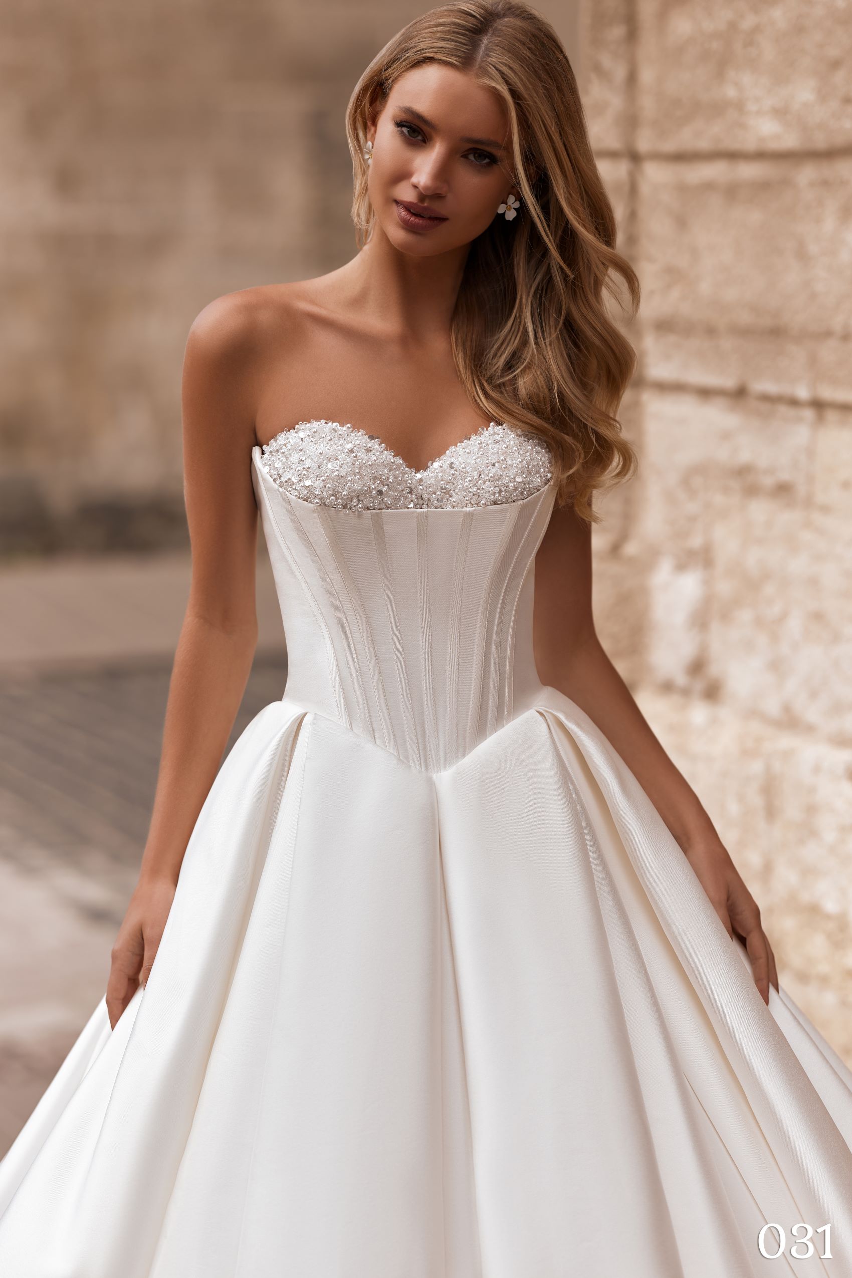 Corsetul în stil Sweetheart, inspirat de rochiile clasice de prințesă, este piesa centrală a acestui model și redefinește eleganța prin linia sa impecabilă și structura sofisticată. Realizat din micado de înaltă calitate, acest corset este construit cu balene multiple, ce nu doar oferă o susținere excelentă, ci și sculptează talia într-un mod spectaculos, creând efectul de clepsidră. Tăietura în V în zona taliei este un detaliu esențial, deoarece alungește trunchiul, subțiază optic mijlocul și conferă o postură grațioasă și feminină.