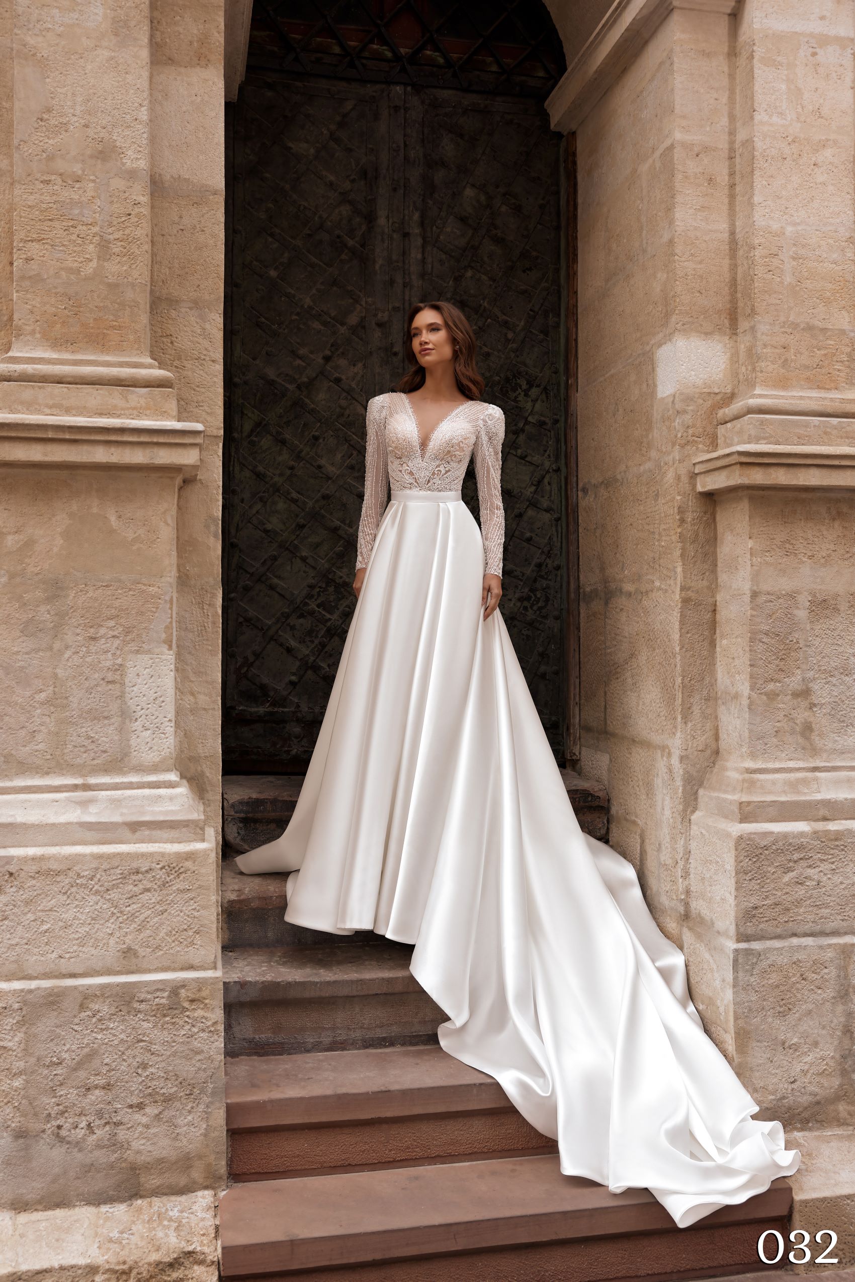 Modelul 032 este o rochie de mireasă sirenă 2 în 1, creată pentru miresele care își doresc o siluetă senzuală, dar și un plus de dramatism printr-o trena voluminoasă. Rochia este realizată dintr-o dantelă rafinată, unde fiecare cusătură este împodobită cu mărgele și paiete, adăugând o strălucire subtilă.
