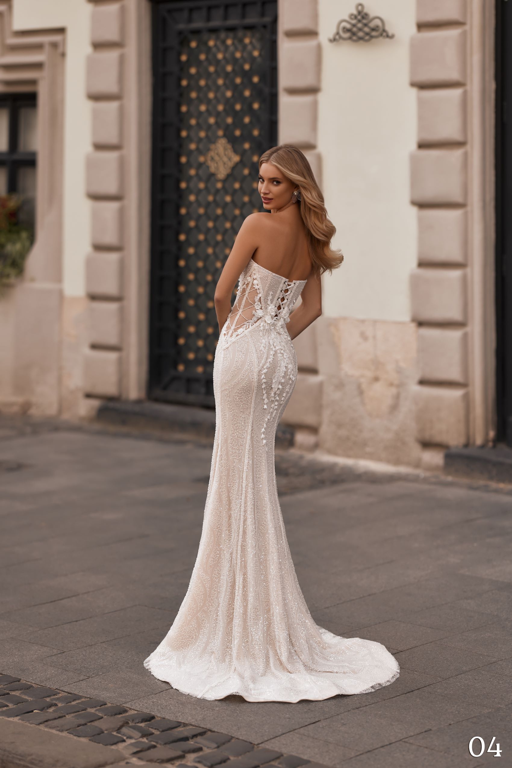 Designul său sirenă este accentuat de decupaje laterale spectaculoase, decorate manual cu șiraguri de mărgele, adăugând un detaliu prețios și rafinat. Fusta brodată cu mărgele, peste care au fost aplicate linii verticale create special pentru a alungi vizual silueta, conferă un efect elegant și rafinat.