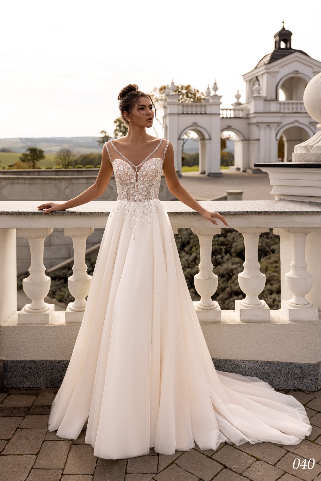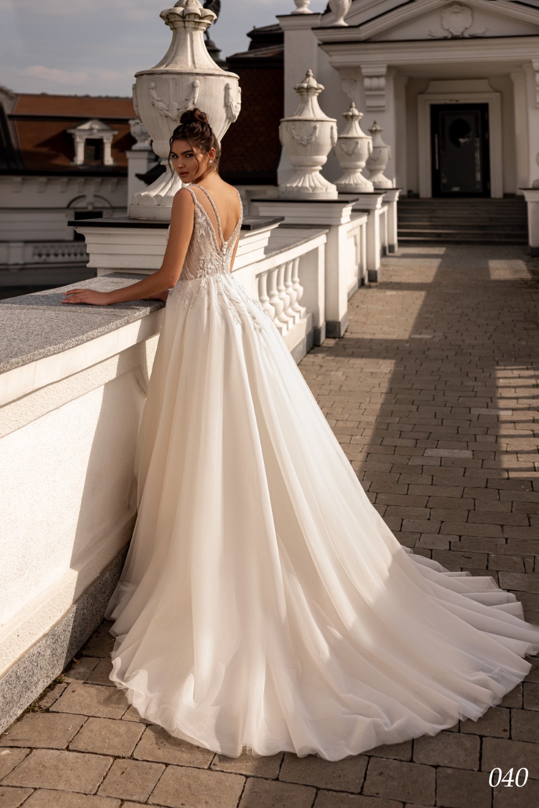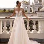 Aceasta este o rochie de mireasa tandra si delicata ce confera un look vintage. Decolteul in V este marcat de siraguri stralucitoare.