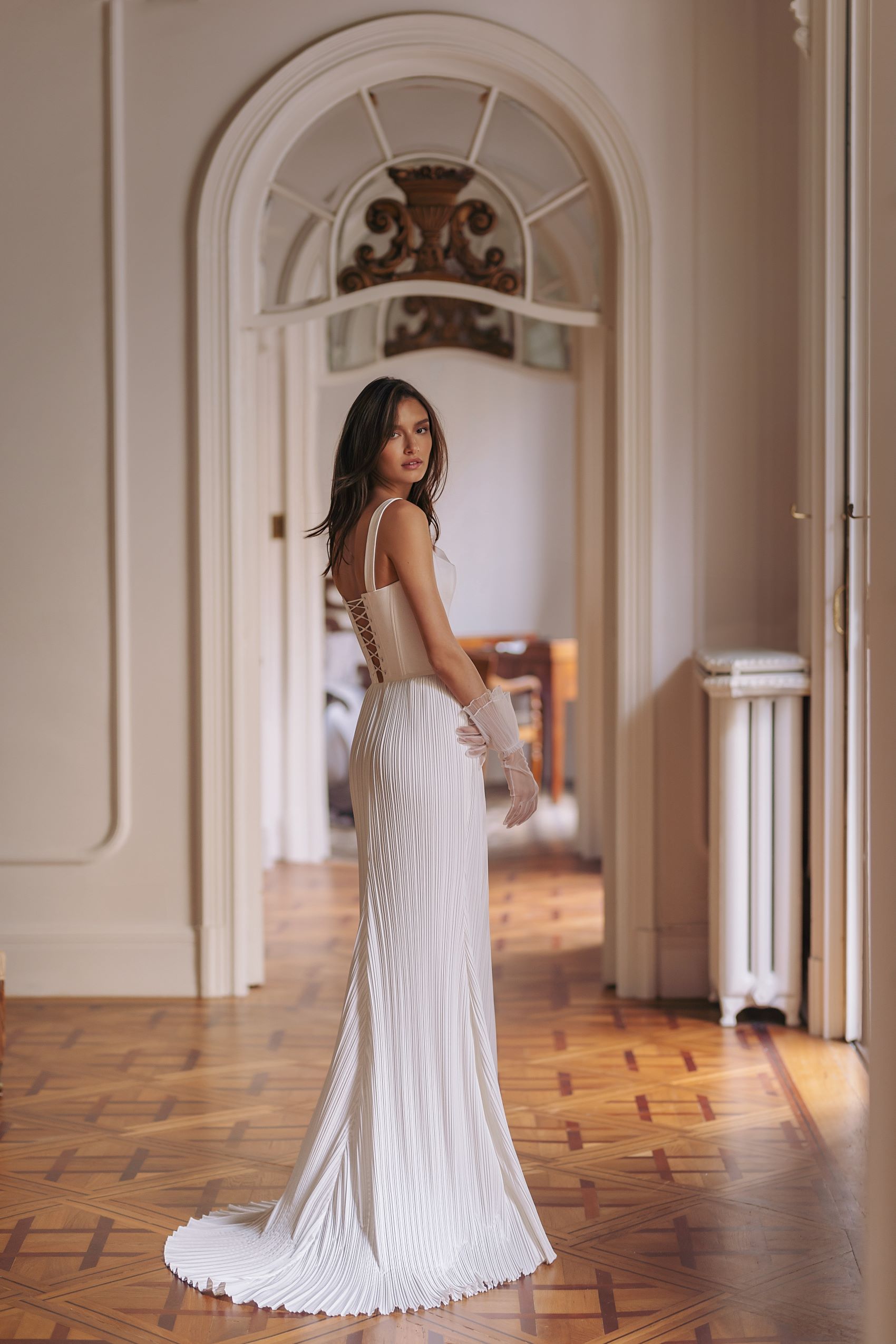 Columbia — firm corset-based plisse dress with wide straps and heart-shaped neckline. Complemented with tulle medium length gloves.