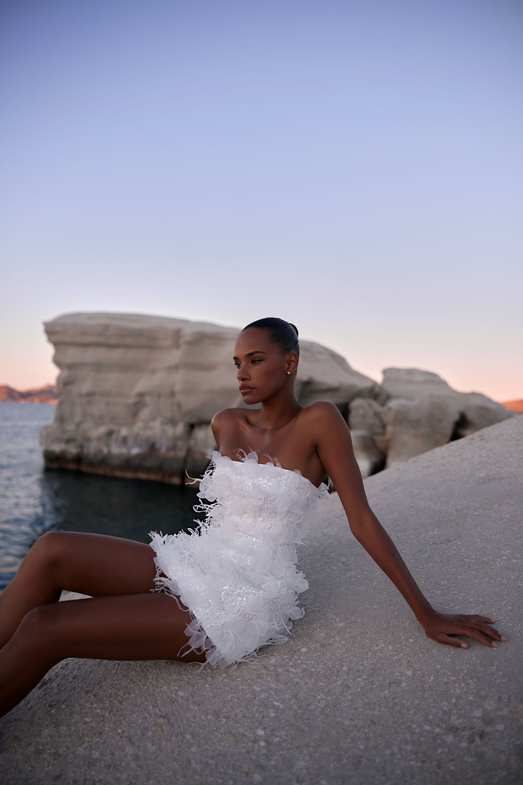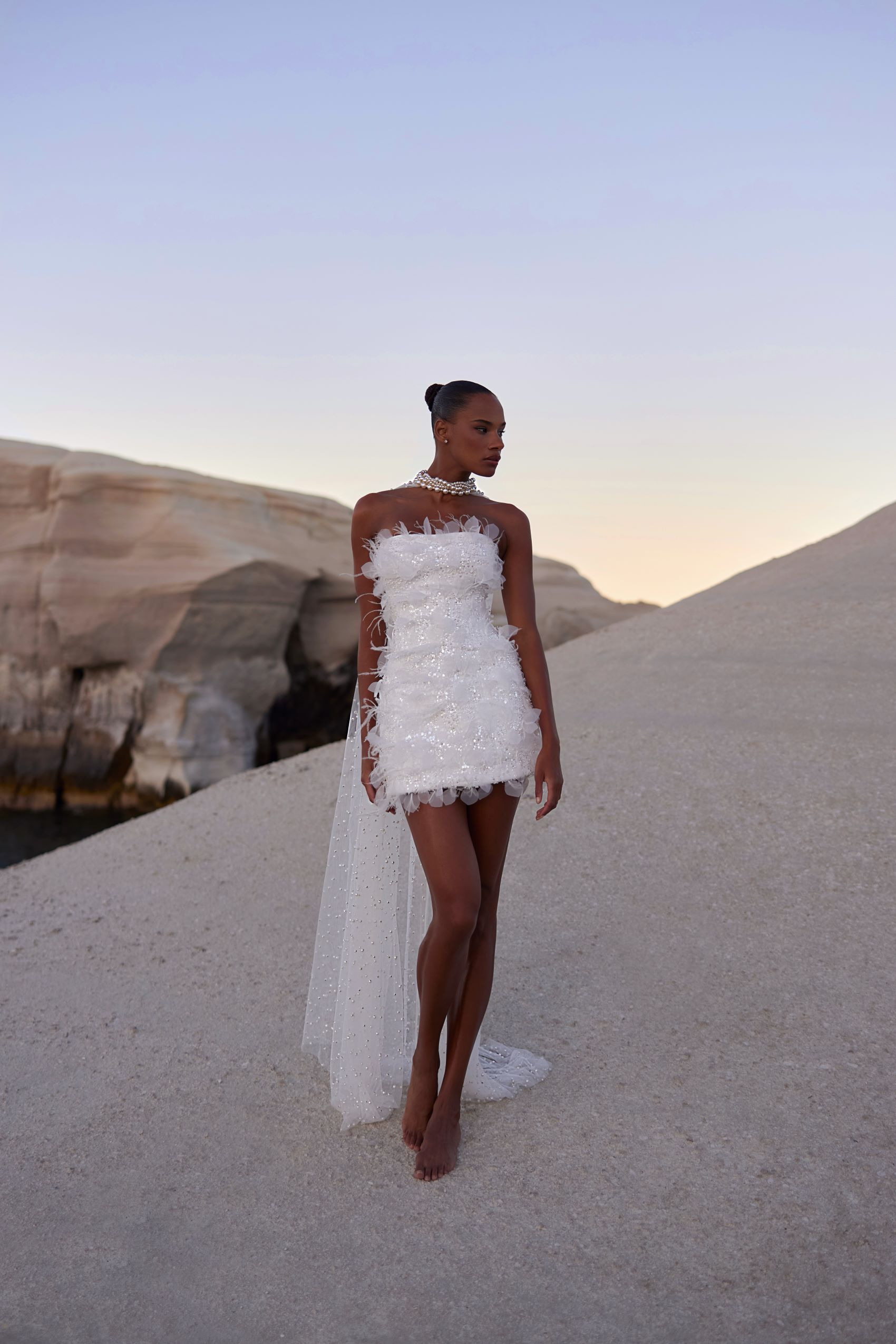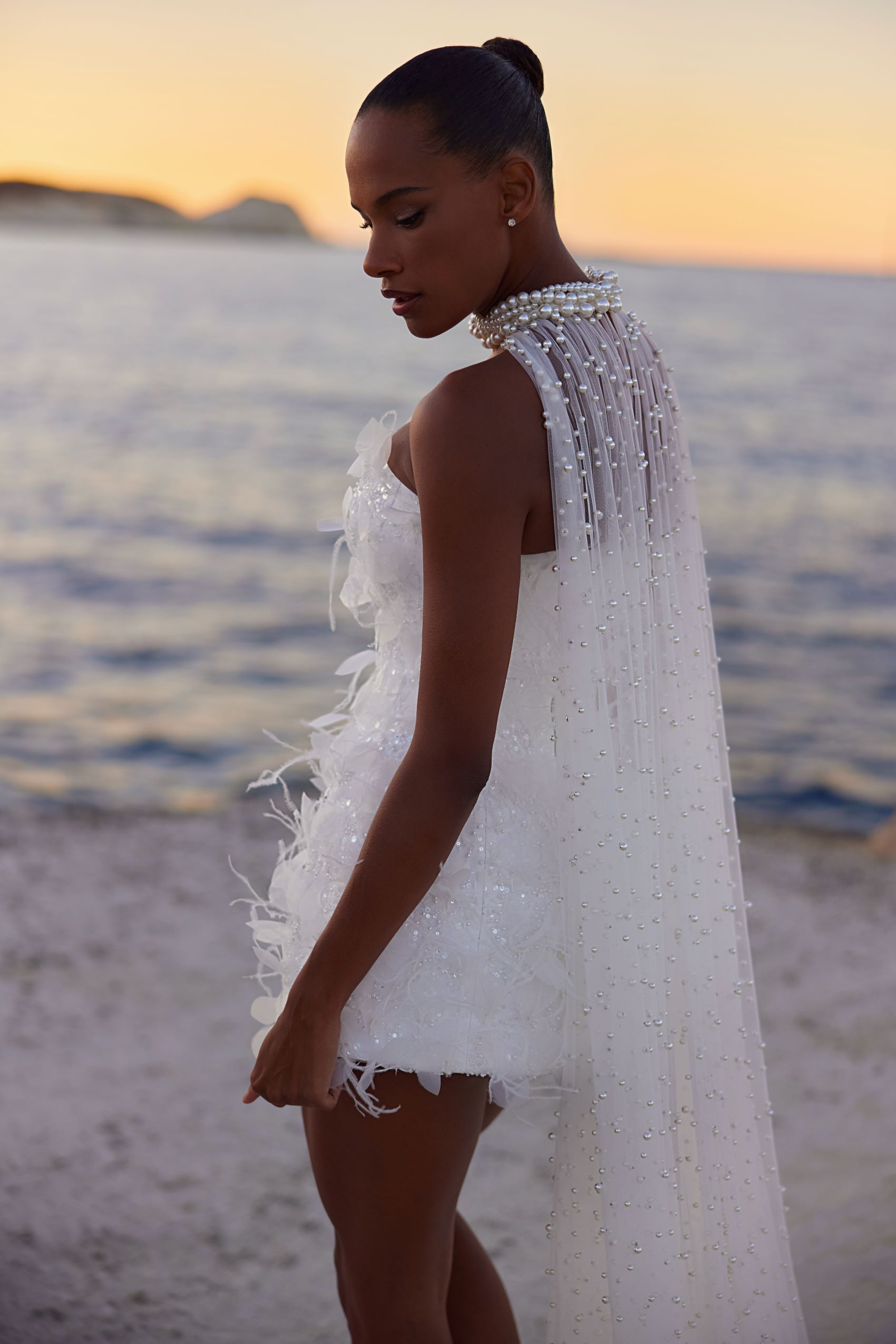 Eye-catching mini dress with lightweight feather and tulle applications over the beaded base. The complementing details are a pearl embroidered cape attached to the layered pearl choker, which add elegance and grace to the outfit.