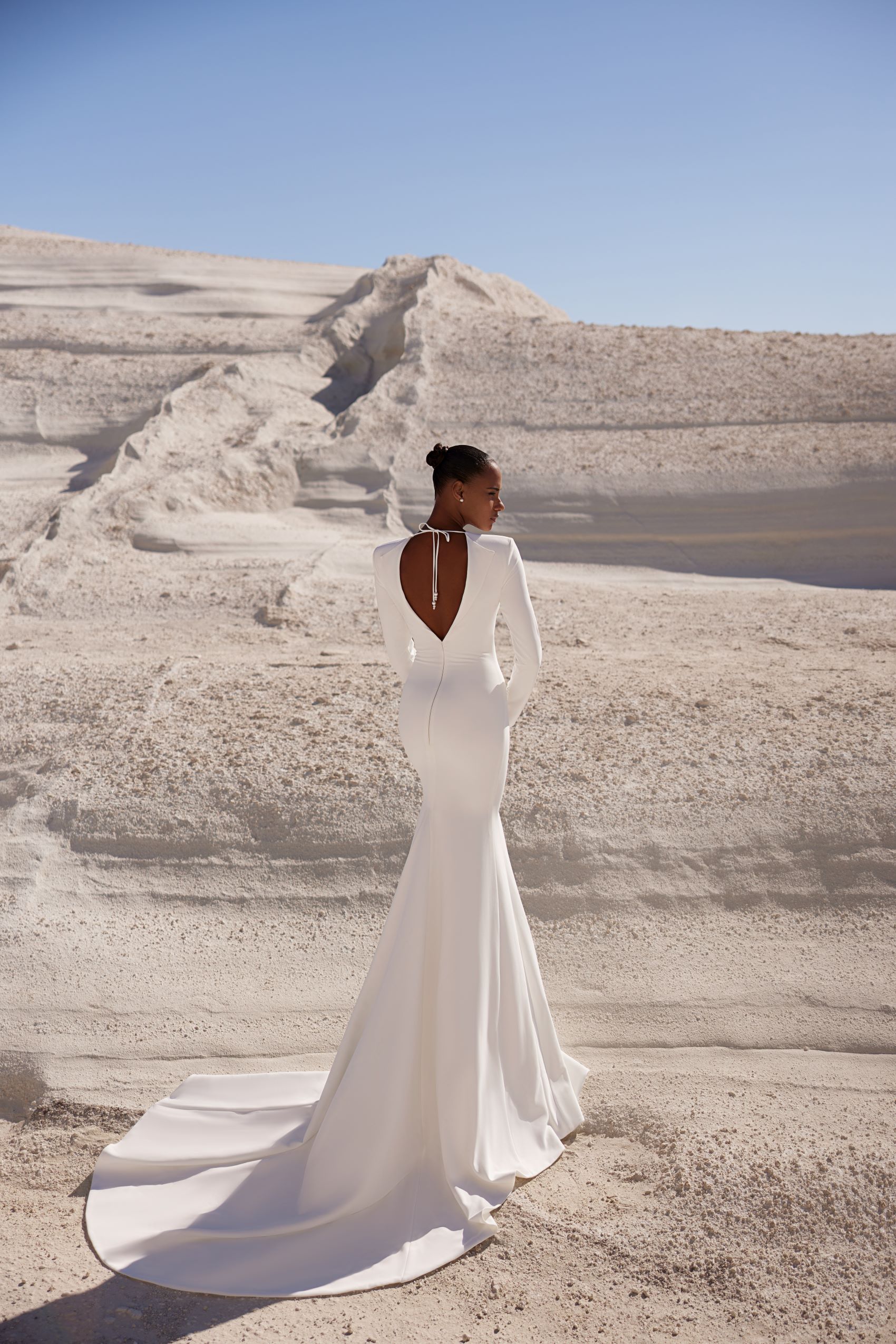 Sleek minimalist mermaid dress featuring a deep plunging neckline decorated with edge-embroidered mesh and delicate pearl buttons on the inner side of the cuffs. The dress remains a classic while reflecting the modern character of the bride.