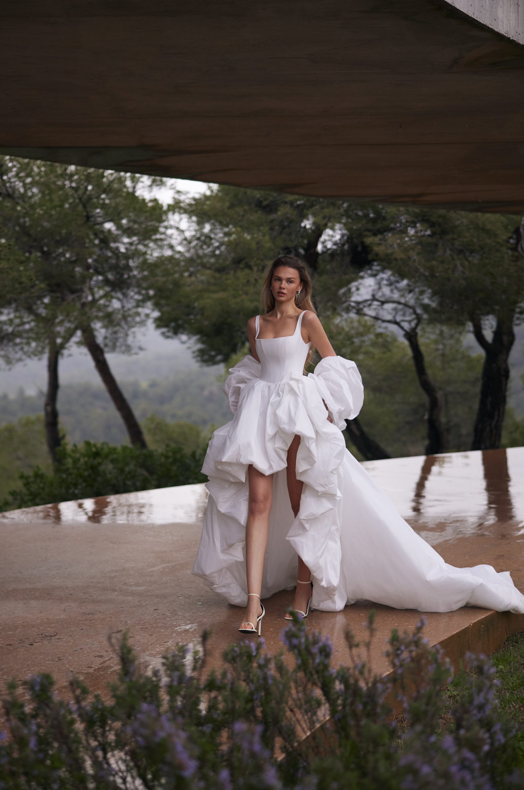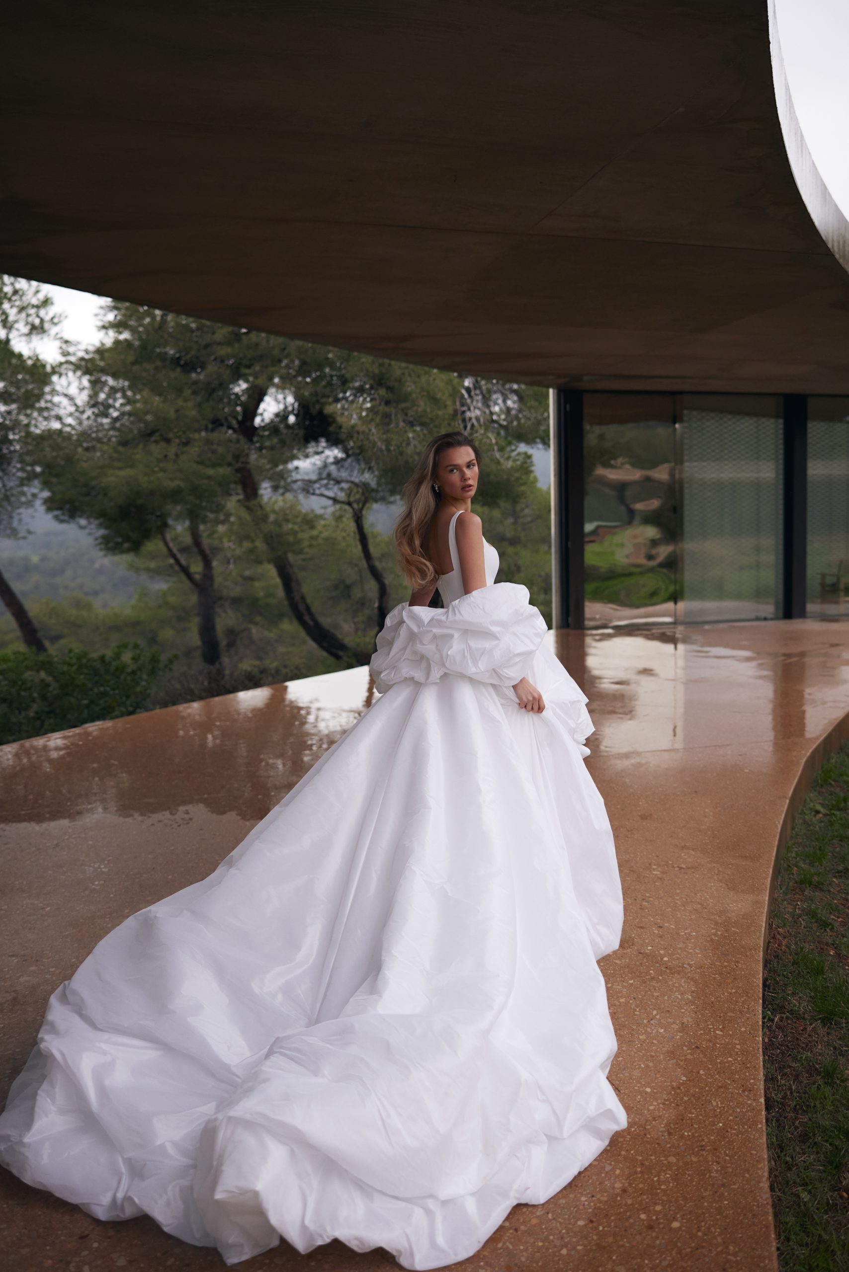 Silueuta sa high-low reinventată aduce acel efect WOW pe care puține rochii îl pot oferi. Partea scurtă din față scoate în evidență picioarele și creează o mișcare plină de energie, în timp ce trena lungă și voluminoasă conferă eleganță și prestanță de podium. Volumul sculptural al fustei, creat din falduri bogate, adaugă impact vizual fără a pierde finețea specifică brandului.