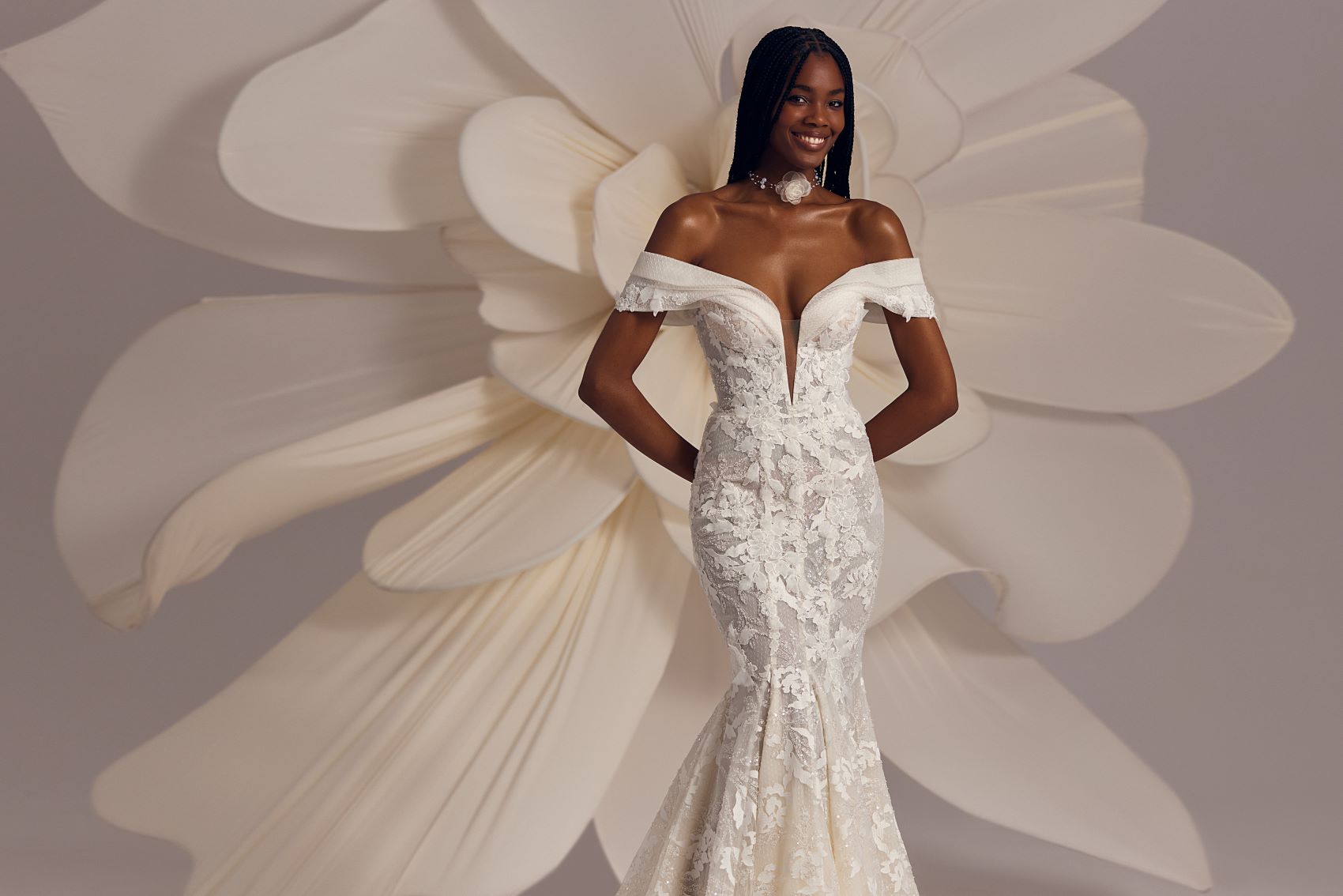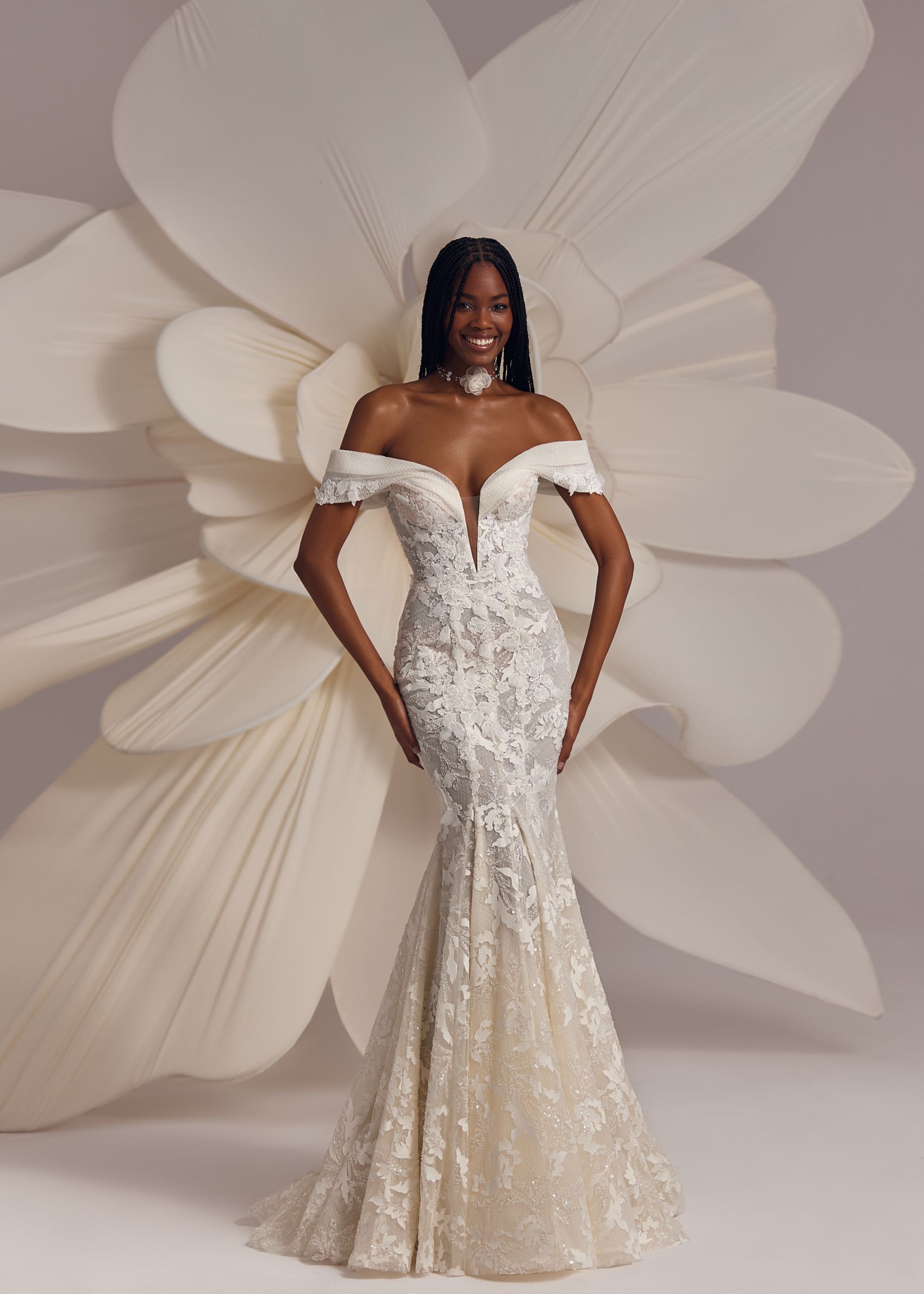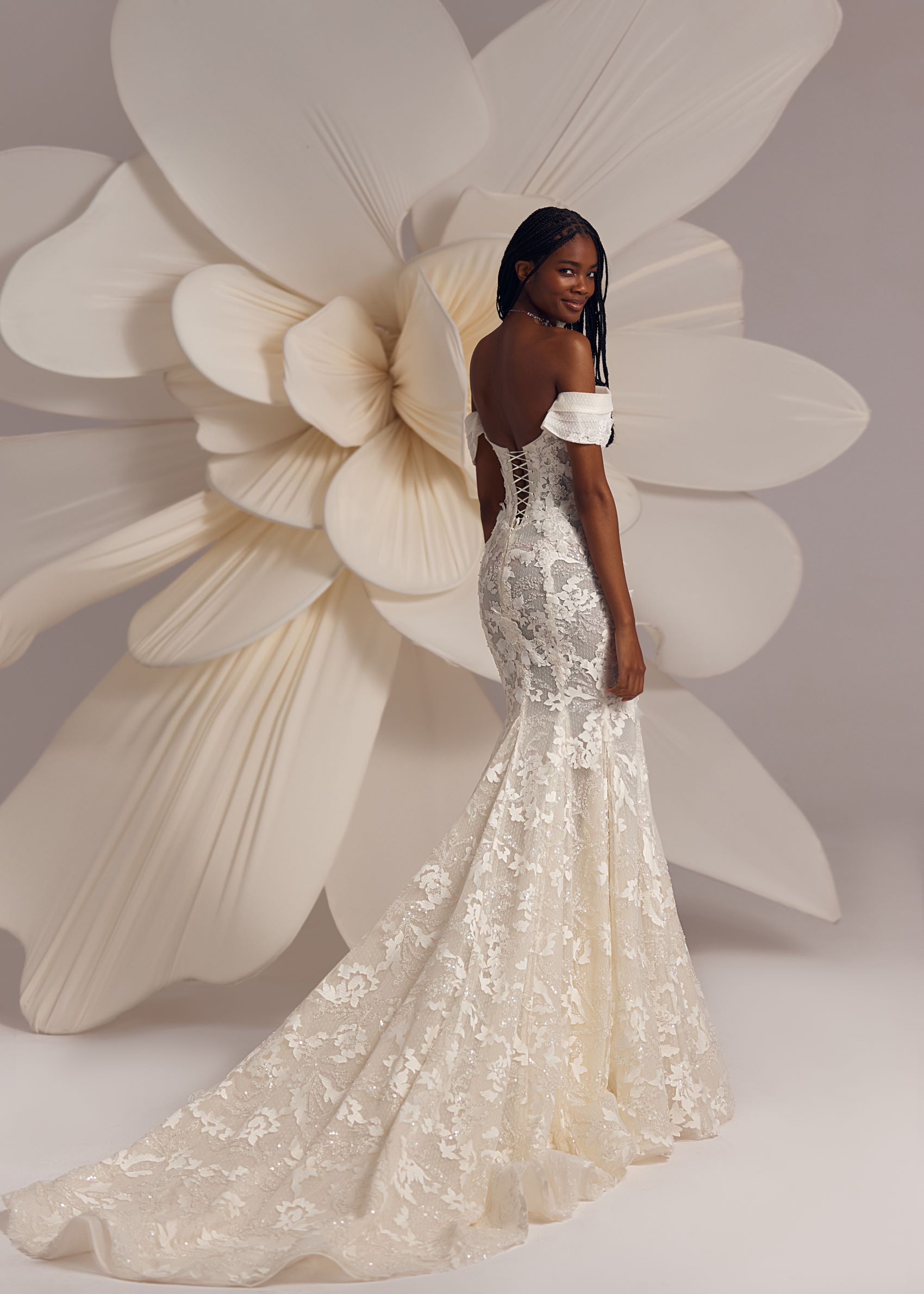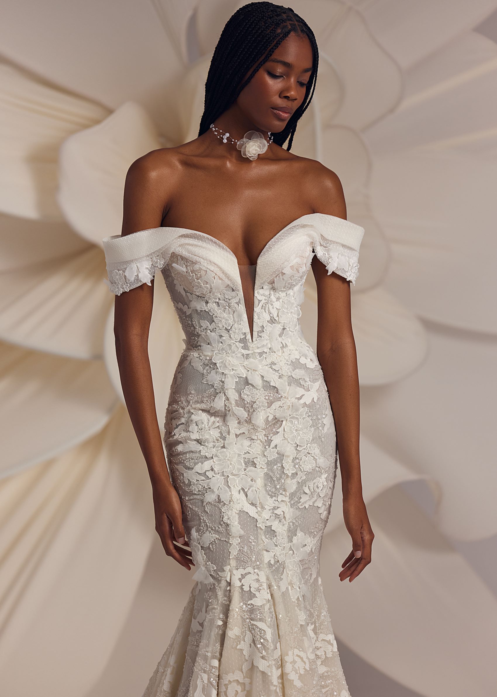 Gravity – plunging neckline cold-shoulder lace-up dress with rich floral embroideries.