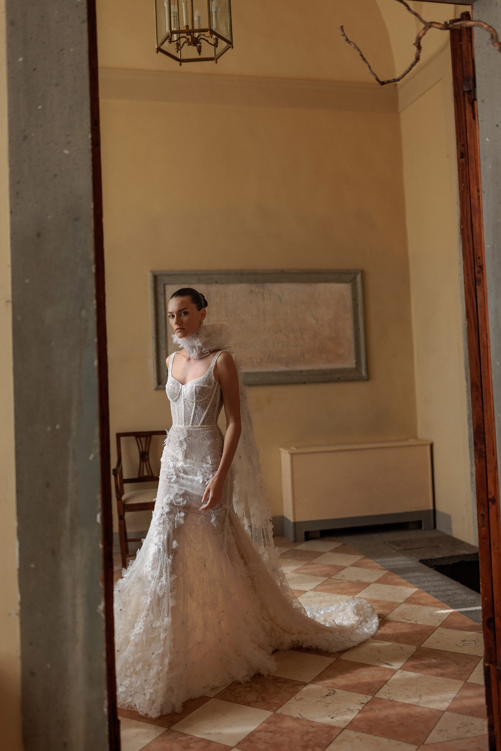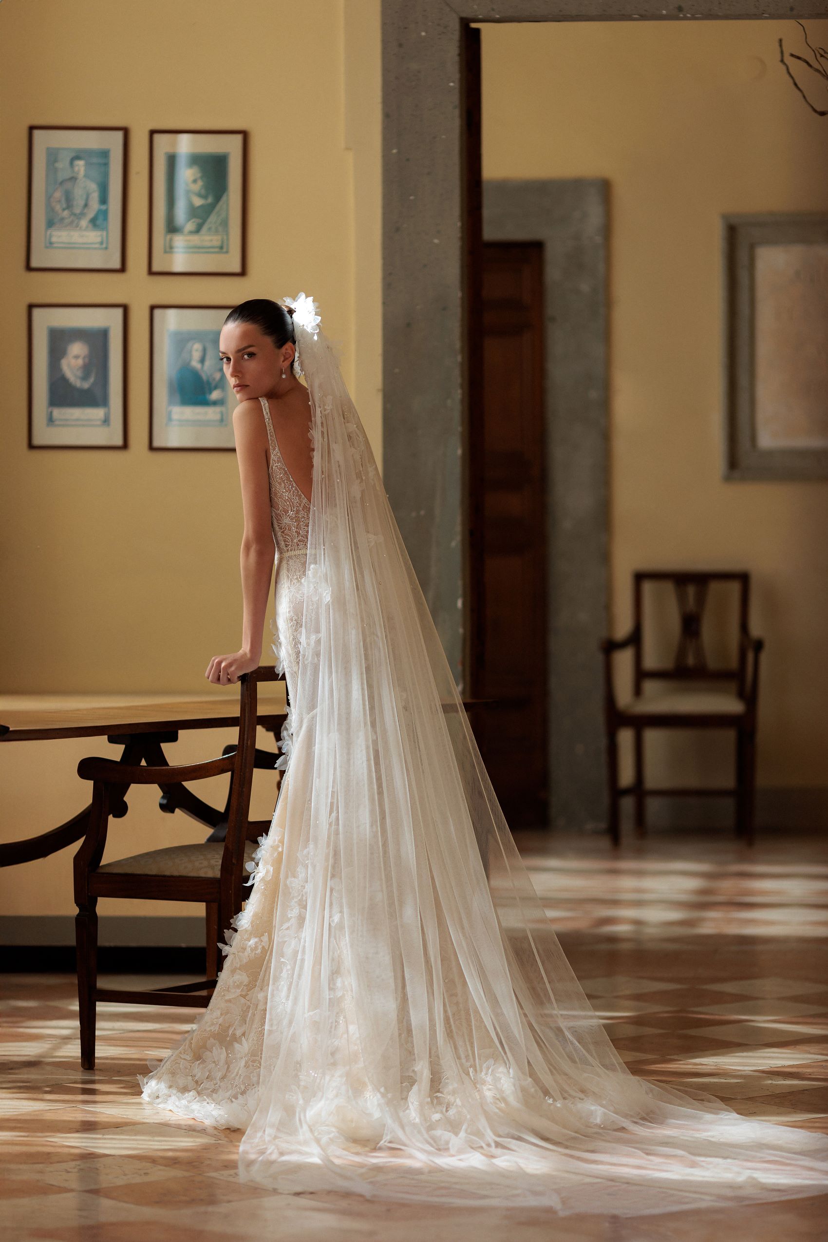 Modern classics: detailed strapped corset with highlighted waistline and smooth skirt, featuring handcrafted embroideries all over the dress and complemented with a veil decorated with floral elements.