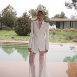 Illusion vine cu un sacou couture, alb-ivory, cu linii curate și o structură modernă. Împreună, cele două piese creează un contrast superb între delicatețe și forță, transformând rochia într-un look versatil: romantică la ceremonie, îndrăzneață și fashion-forward la petrecere.