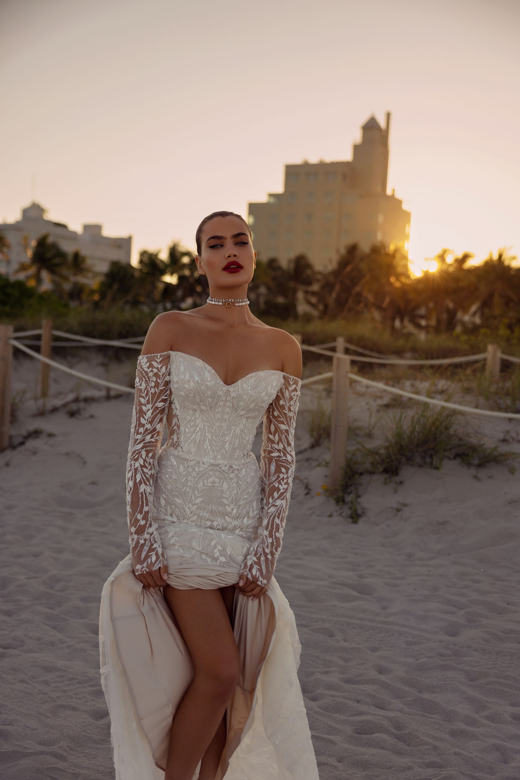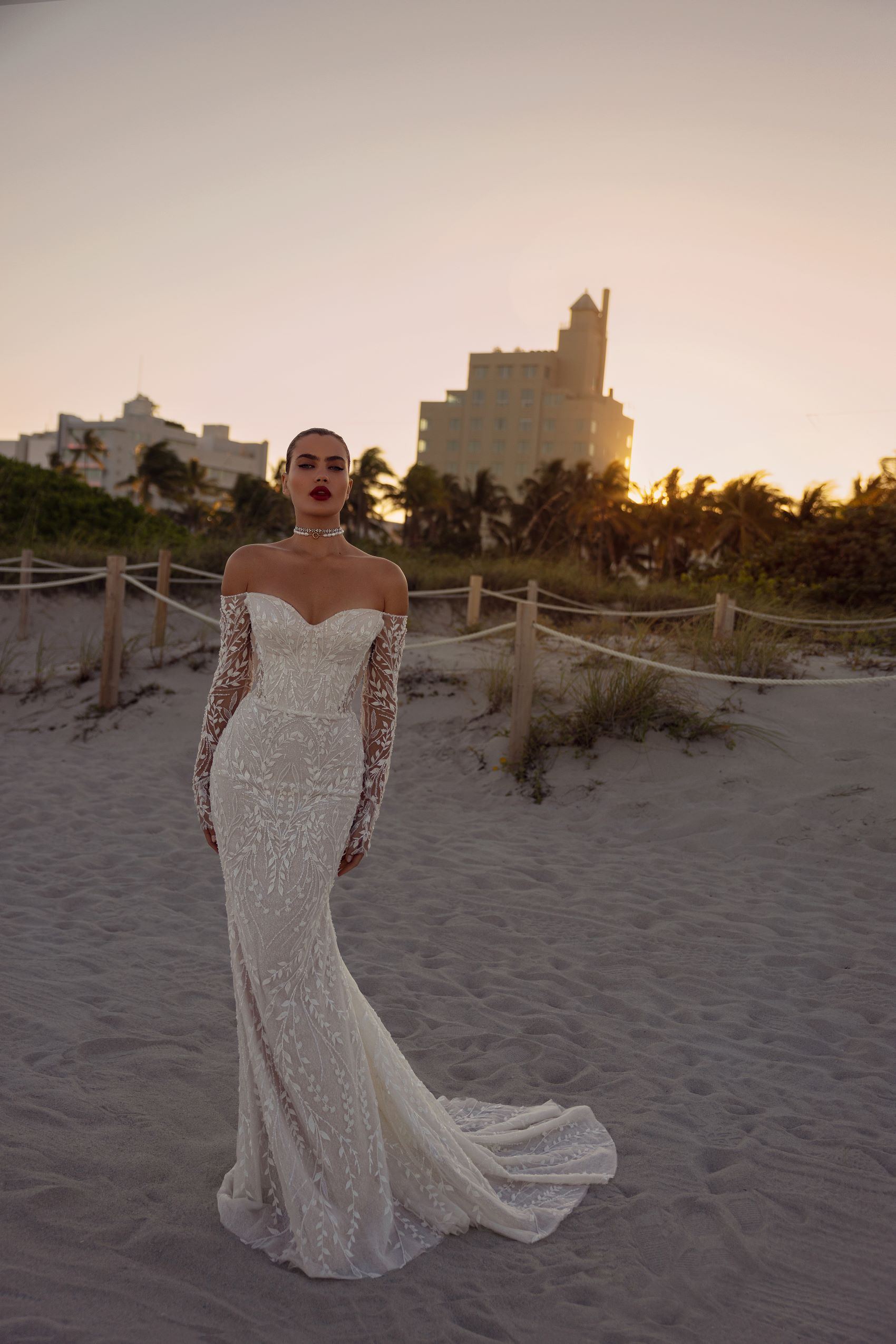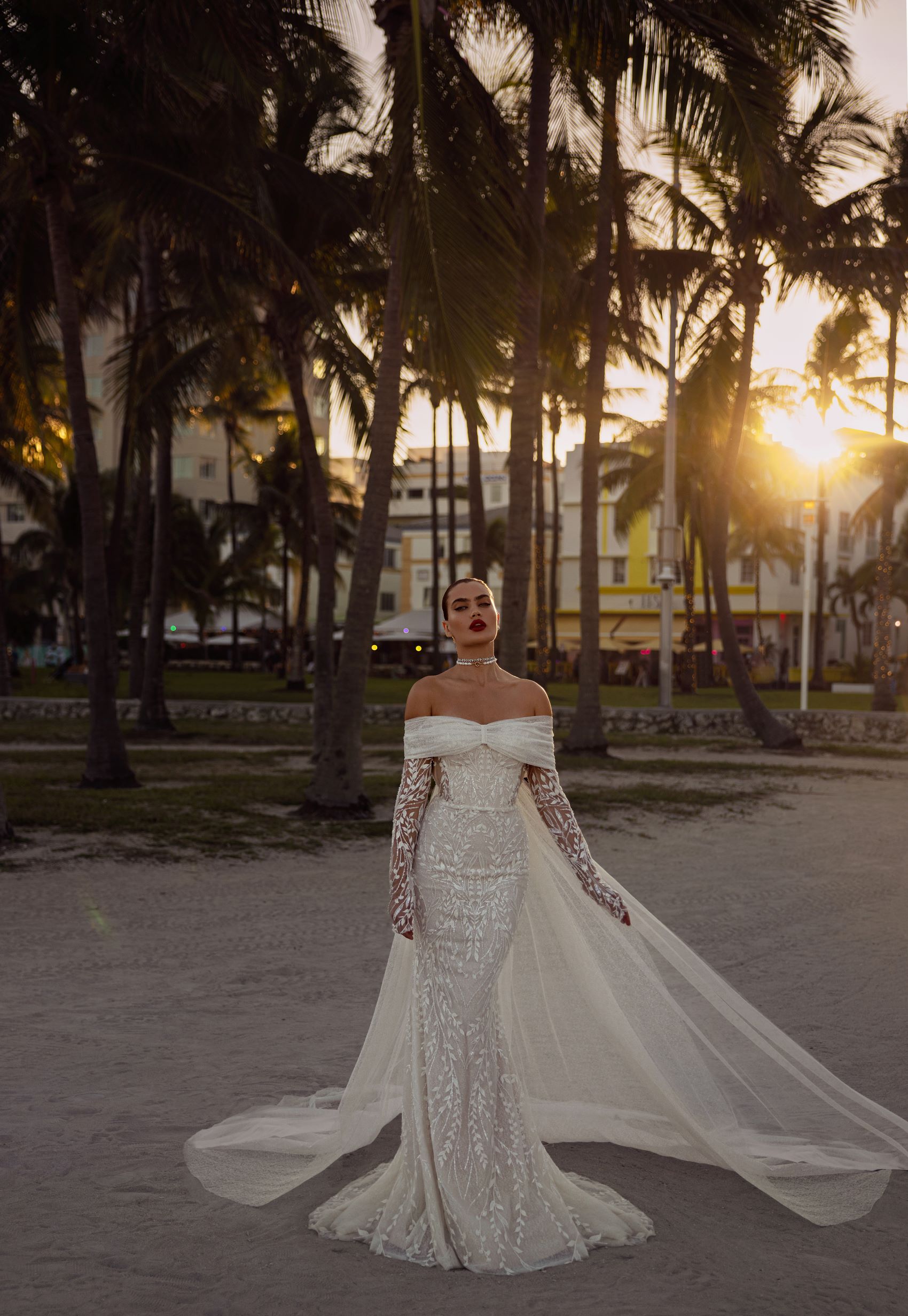 Experience the epitome of romance in this stunning floral lace mermaid wedding dress. The delicate off-shoulder neckline frames your shoulders and highlights your collarbones, adding a touch of femininity. The figure-hugging silhouette flares out into a breathtaking mermaid skirt, while the detachable tulle cape adds an ethereal touch. The intricate lace detailing creates a timeless and elegant look that will leave a lasting impression on your special day. This dress is perfect for the bride who wants to feel both romantic and glamorous, and make a statement that will be remembered for years to come.