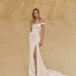 Fusta lungă, cu deschidere frontală discretă și trenă delicată, completează designul cu un accent modern și senzual, fără a pierde din simplitatea care definește colecția. Rochia JASPER este alegerea ideală pentru miresele care își doresc un look minimalist, sofisticat și actual, potrivit atât pentru ceremonii elegante, cât și pentru locații naturale sau moderne.