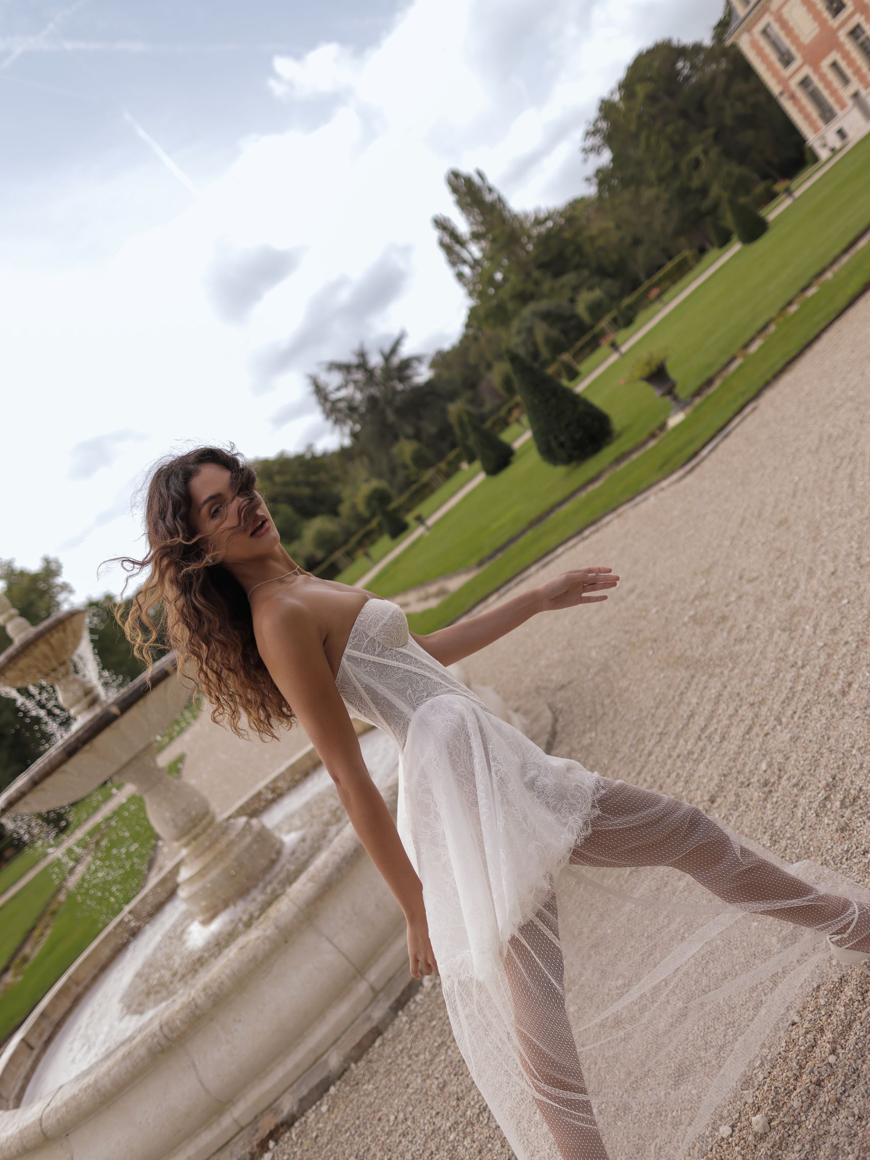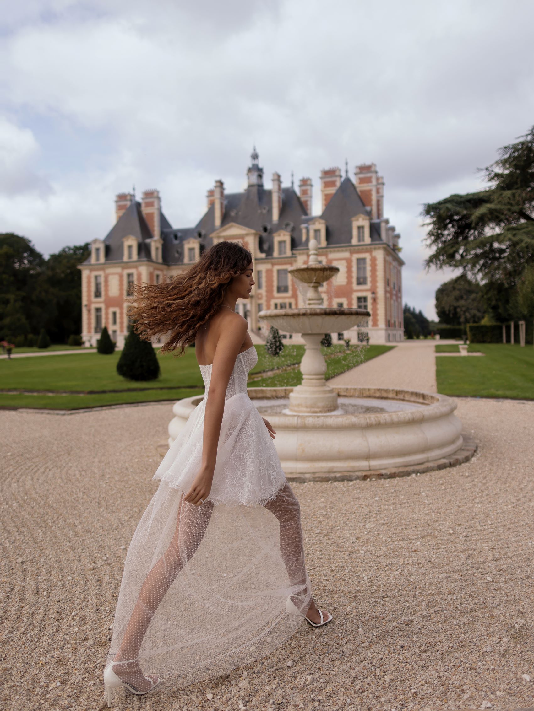 Delicate mini dress with an additional mesh maxi under-skirt. The bodice features a plunging neckline and is adorned with layered lace fabric. The voluminous skirt, slightly pleated on the sides, gives the design a playful air.