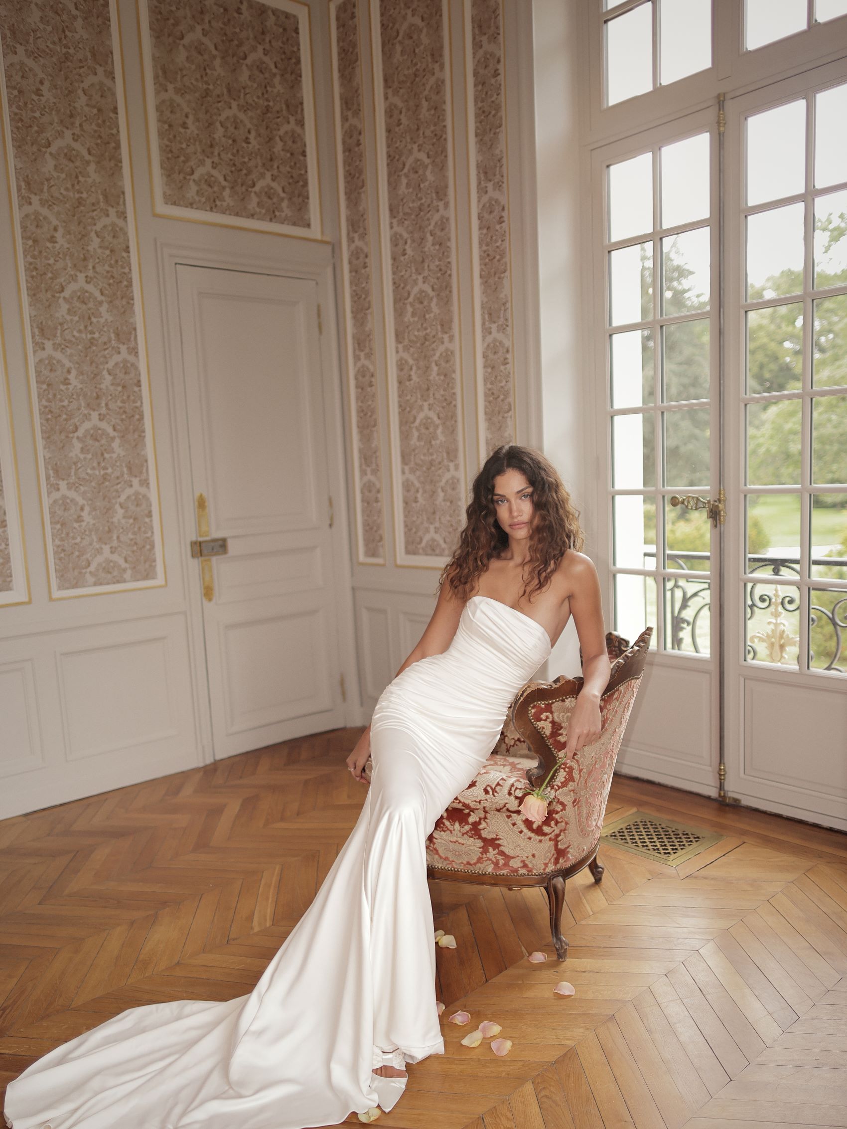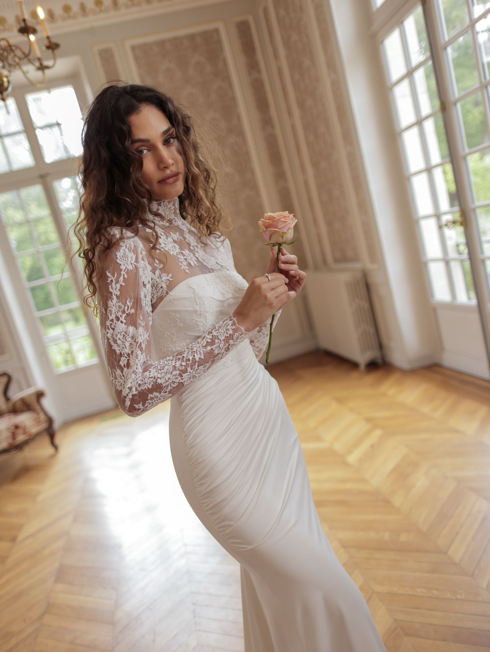 Silky trumpet gown with a wrapped mesh overlay creating soft drapes around the bodice and waist and texturising the silhouette. adds a touch of timeless sophistication.