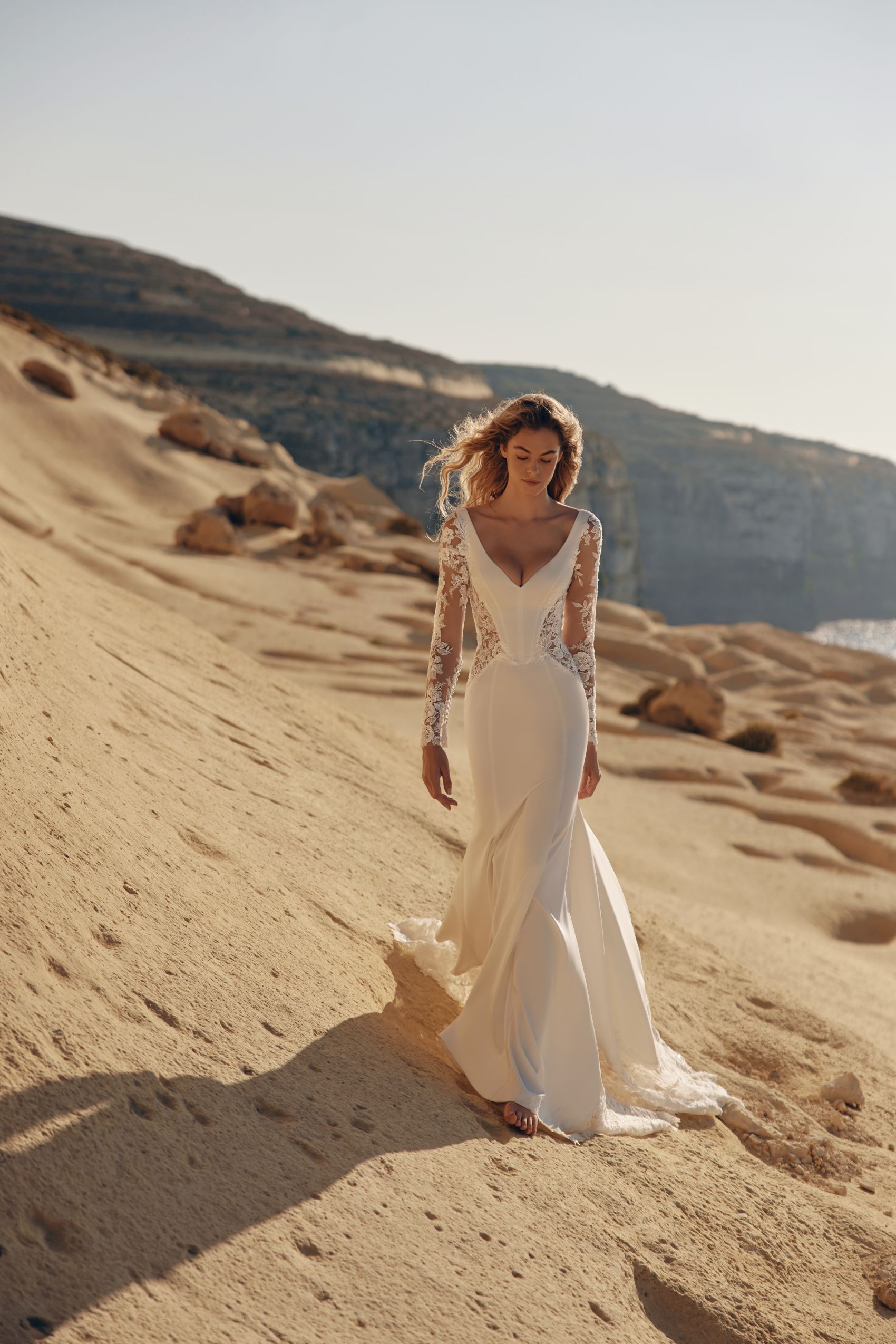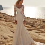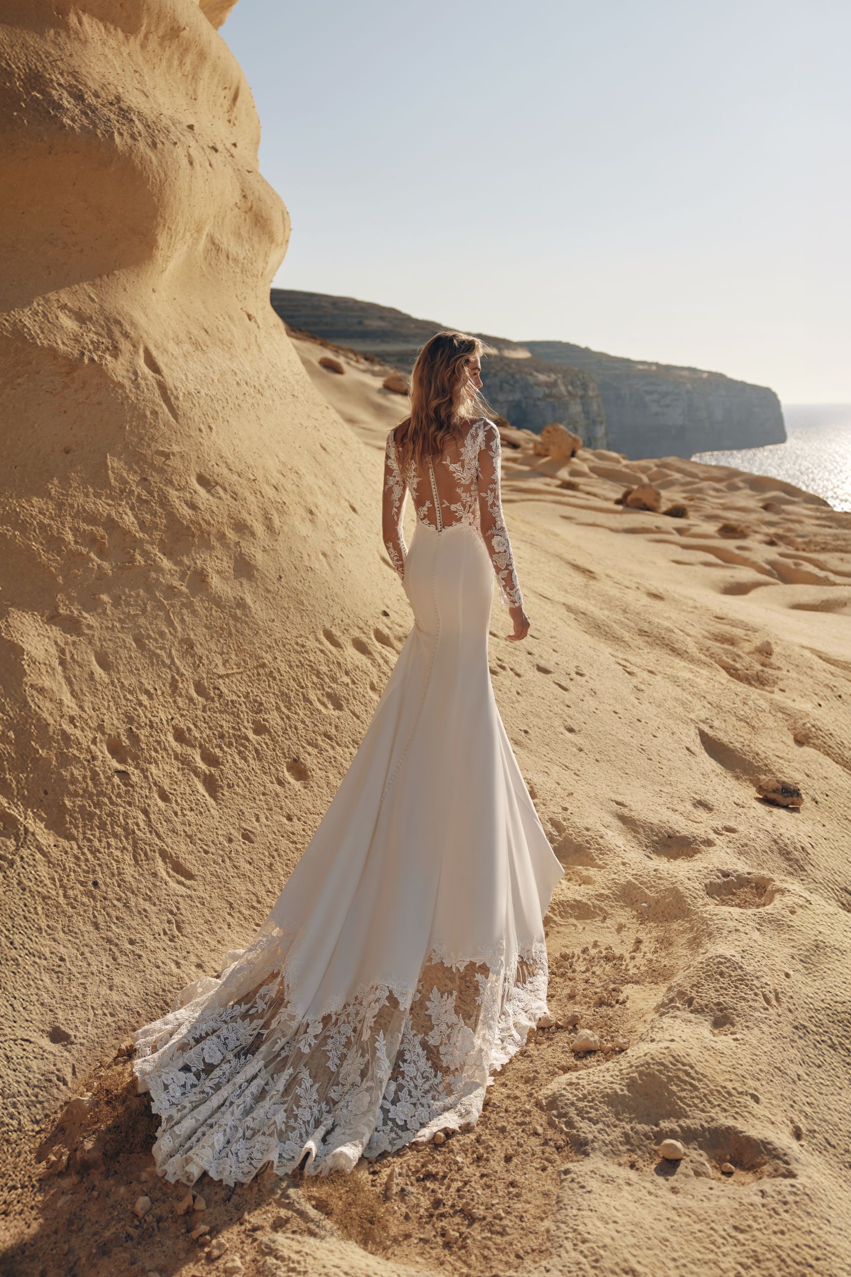 Fusta lungă, cu trenă delicată finisată cu dantelă, cade lejer și creează o mișcare naturală, perfect integrată în spiritul colecției. Rochia KHALI este alegerea ideală pentru miresele care își doresc un look elegant, echilibrat și atemporal, potrivit atât pentru ceremonii în aer liber, cât și pentru locații cu un decor natural sau minimalist.