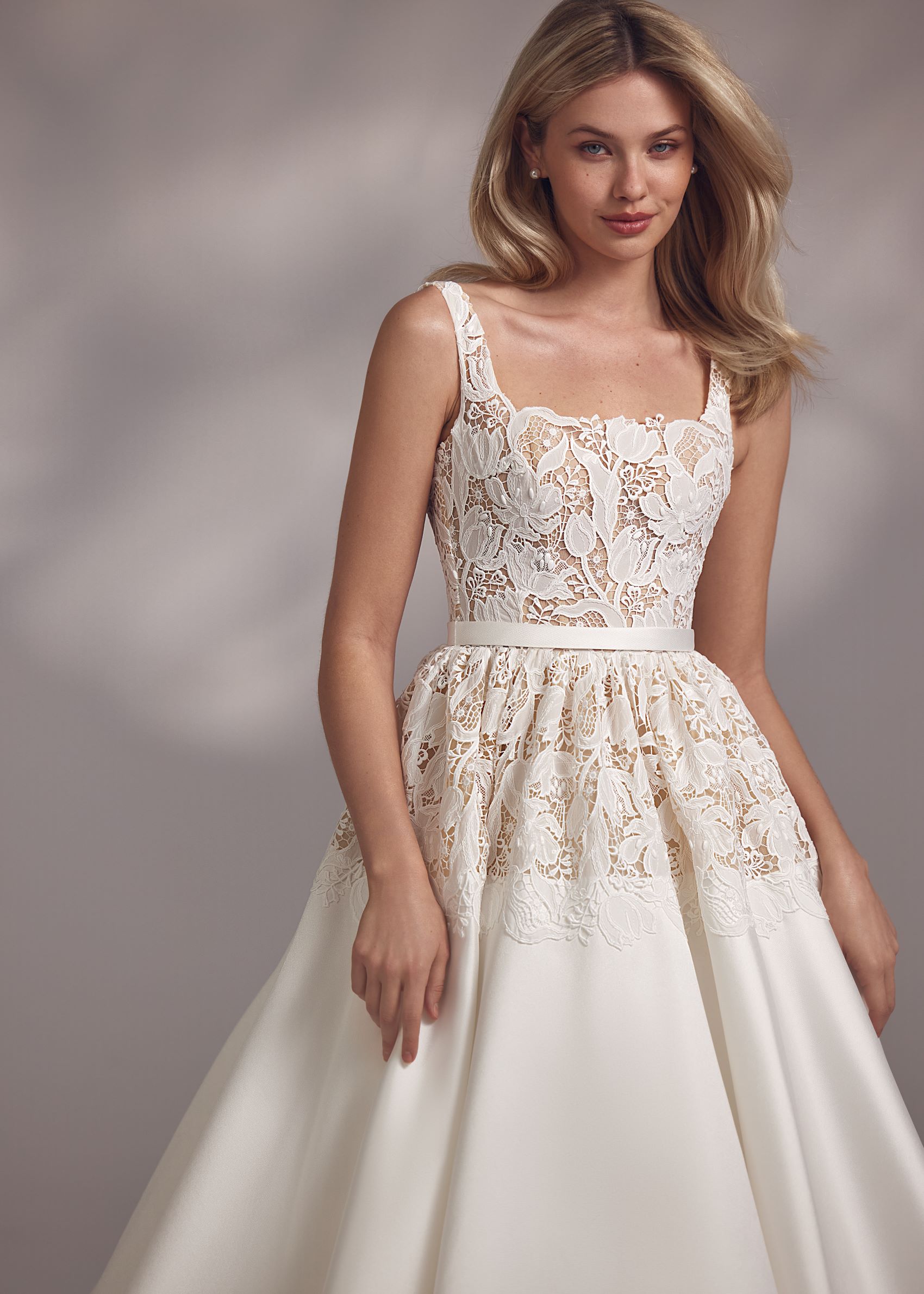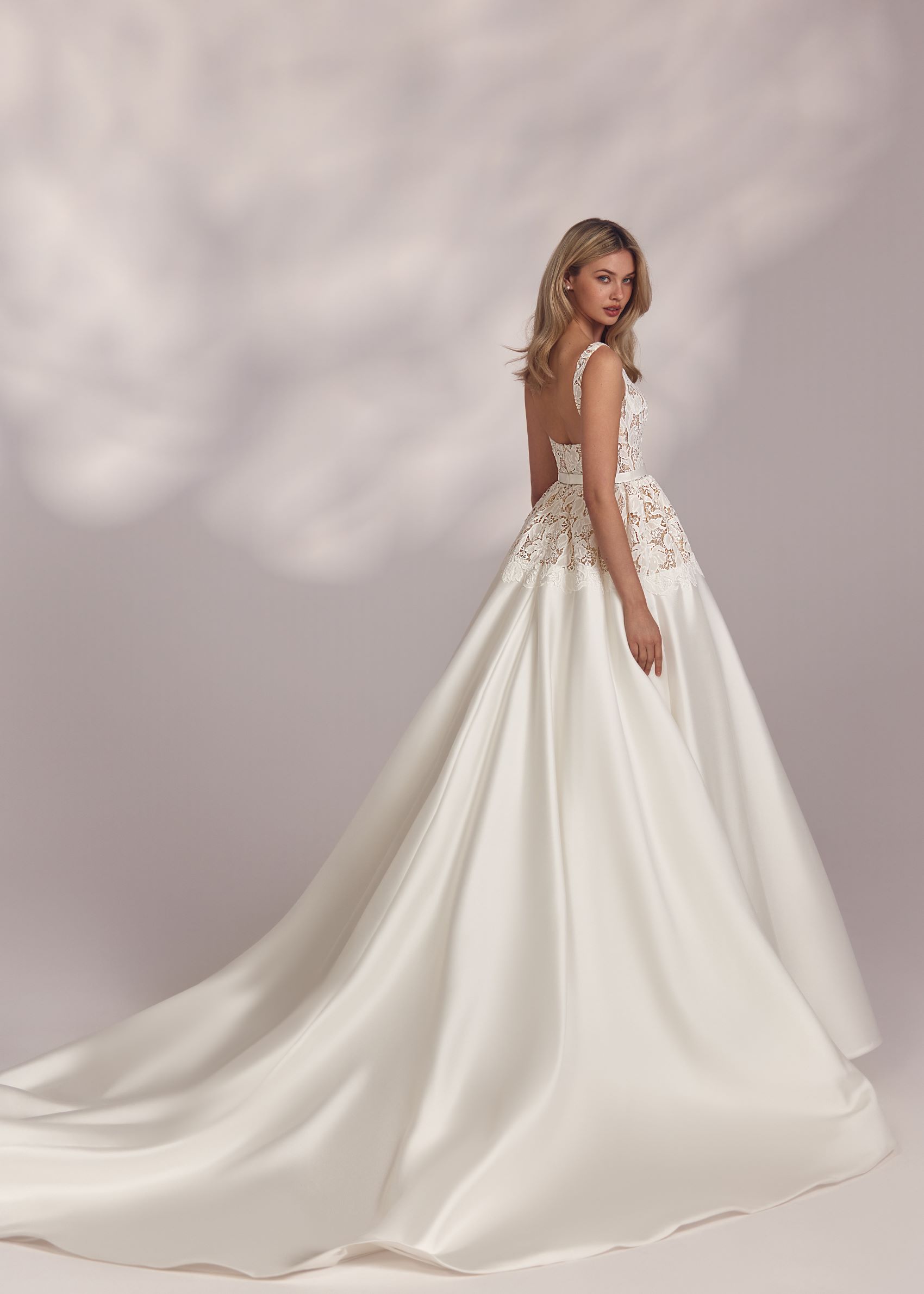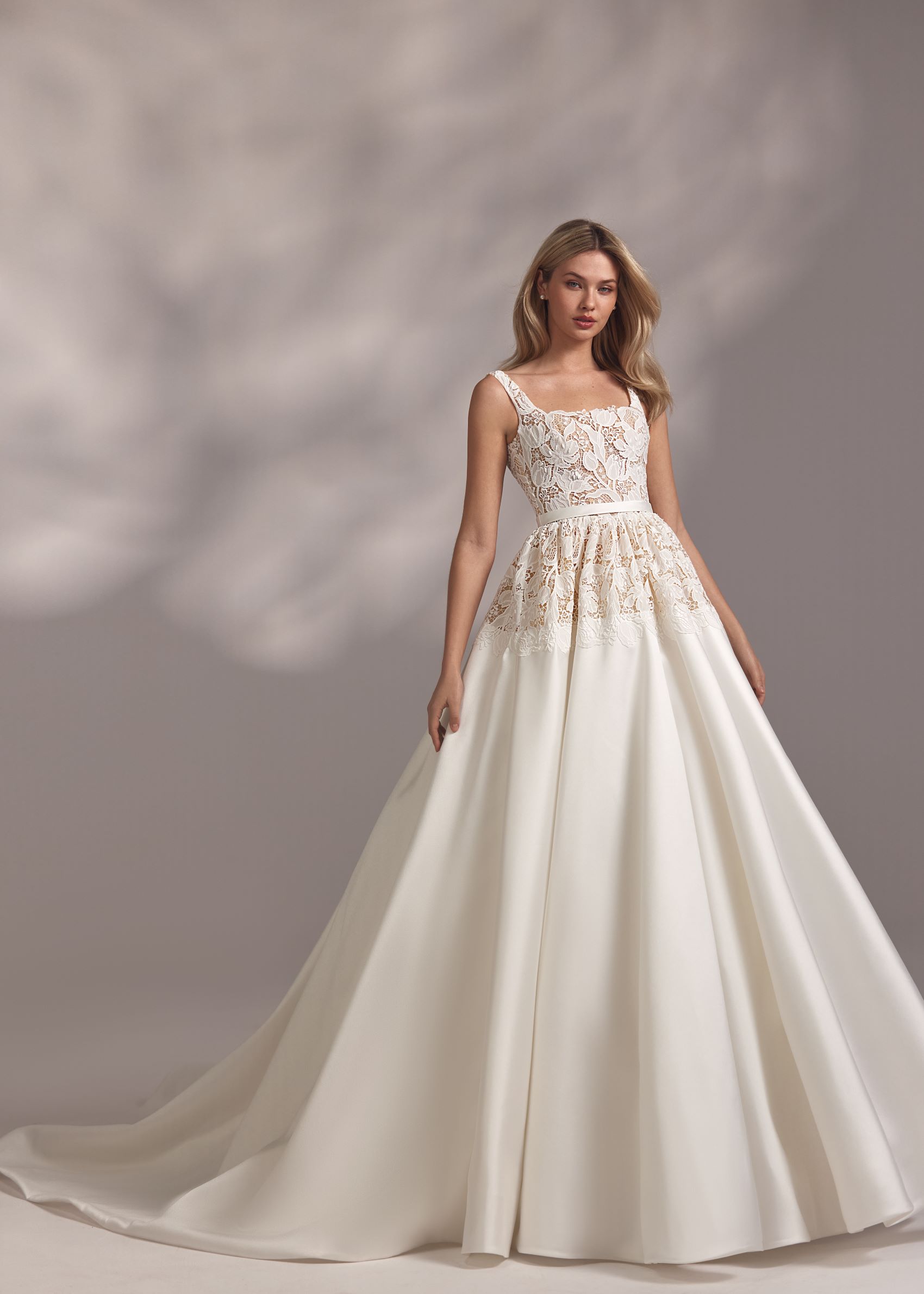 Kirsti – florentine neckline dress with guipure top highlighted by natural waistline and descending guipure basque followed by the smooth voluminous skirt. The cut out mid-depth back adds lightness to the outfit.
