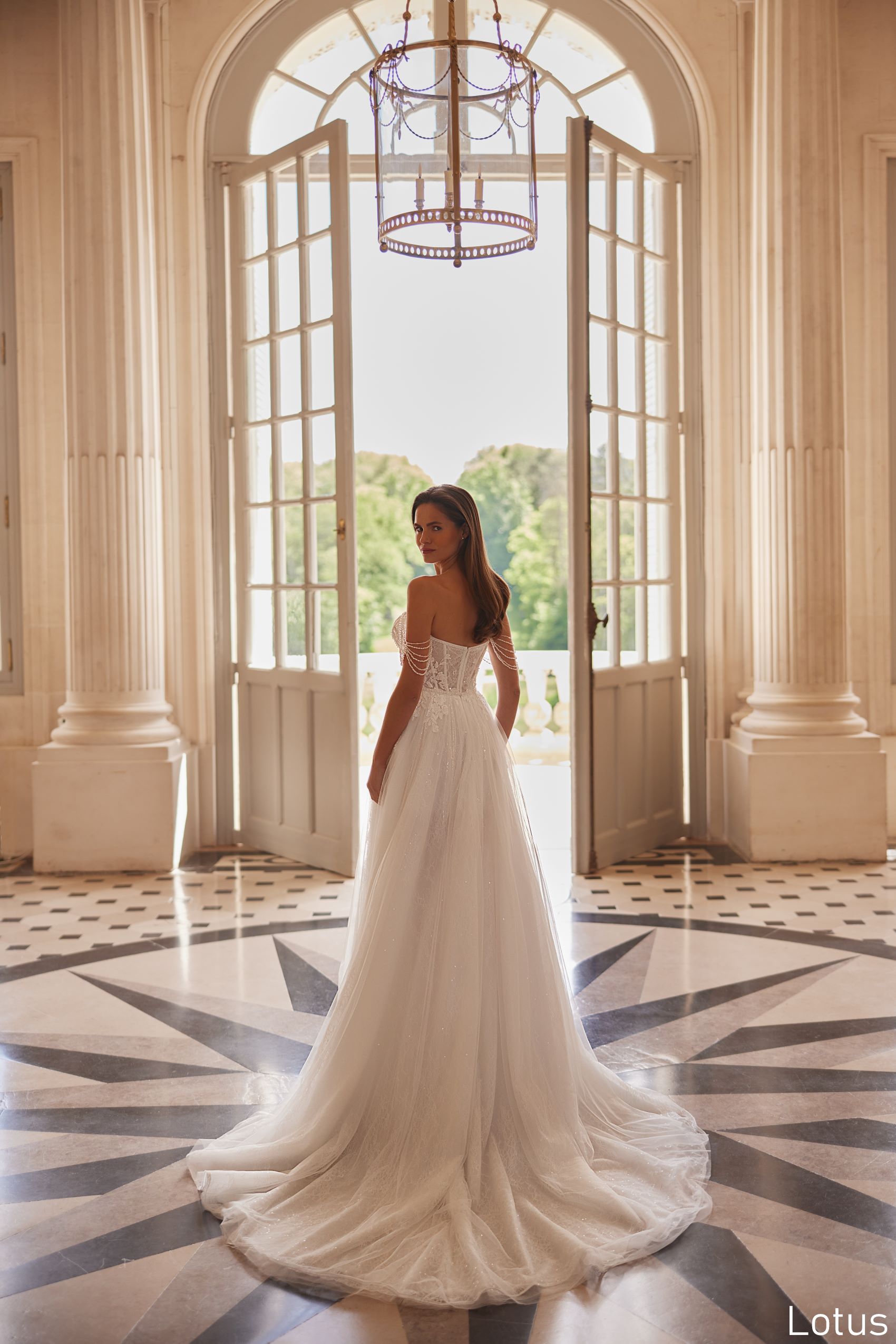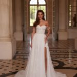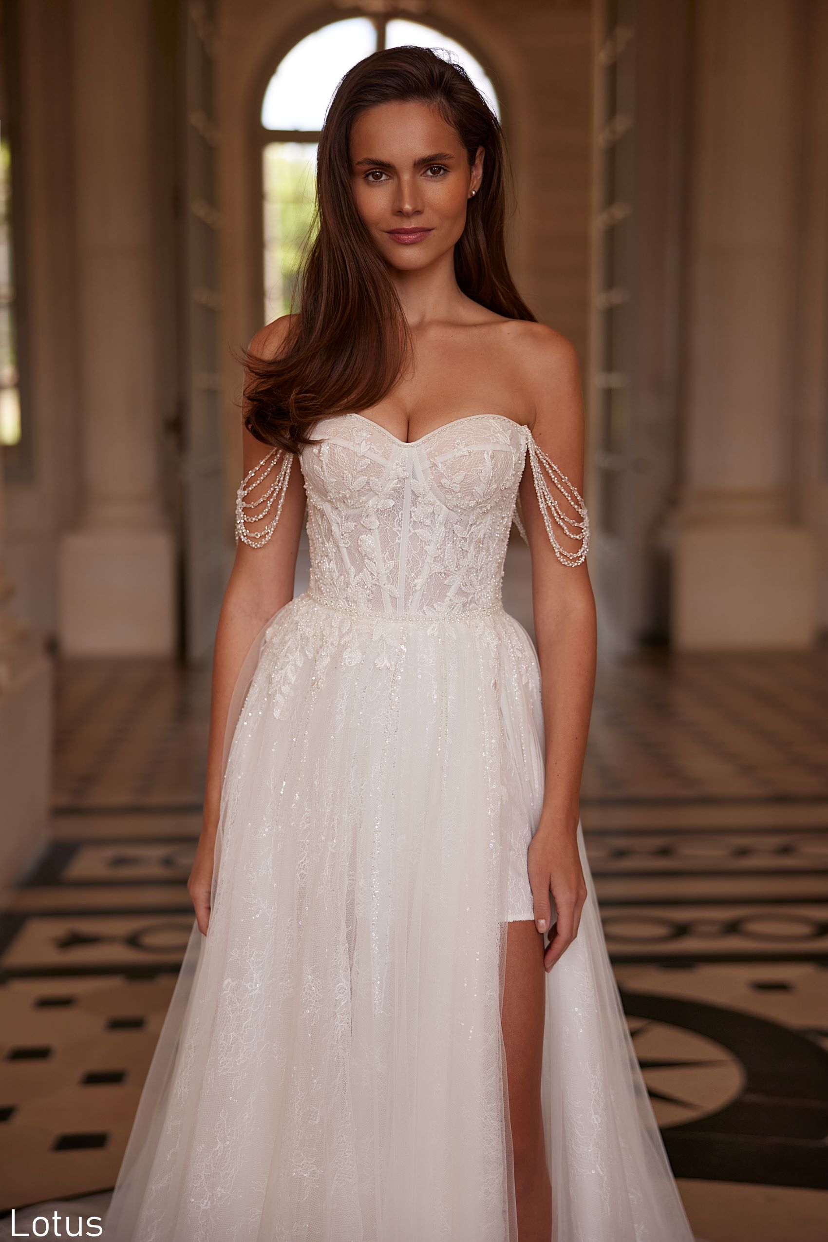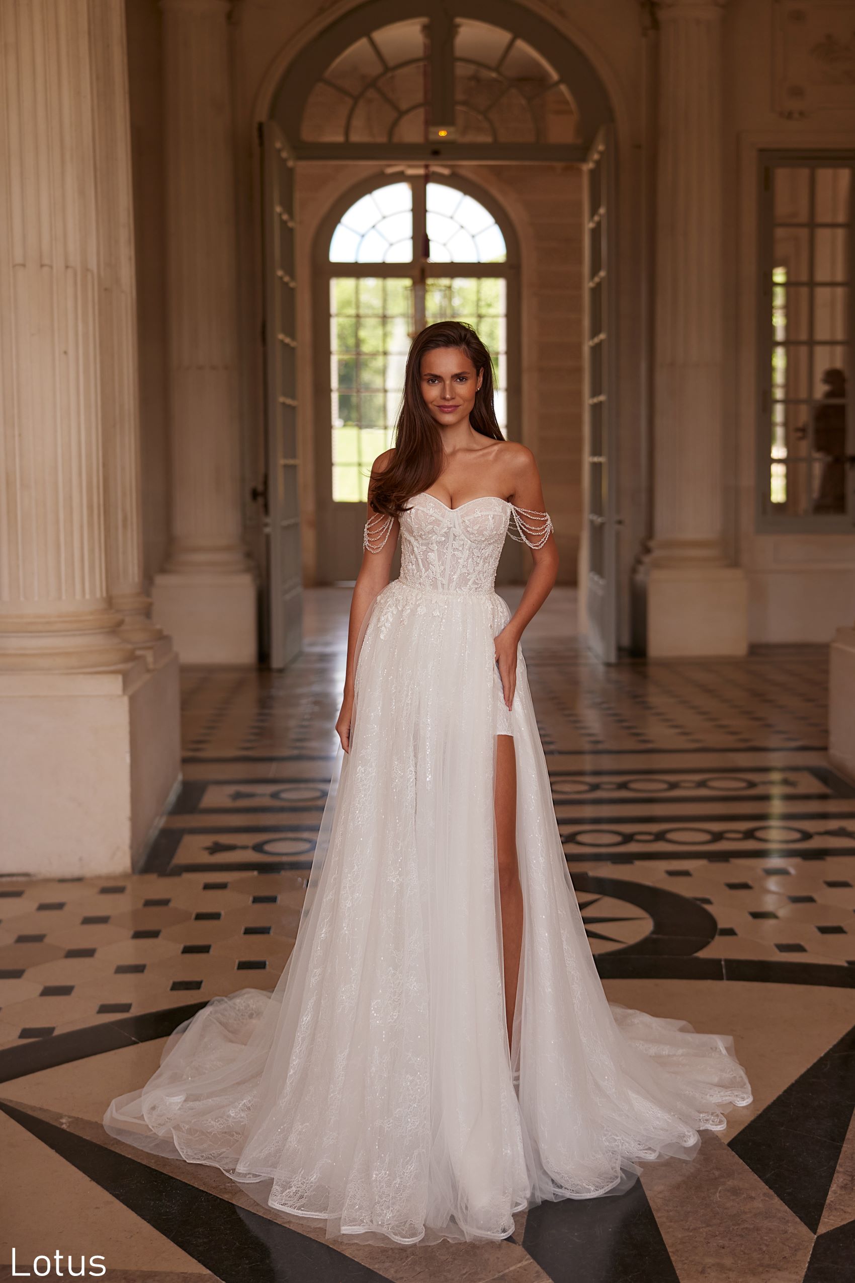 Lotus dress stands out with its elegant and romantic style. The dress has a corset top that emphasizes the figure with a delicate neckline that adds even more tenderness and femininity to the model.This combination is perfectly complemented by a light skirt that sparkles with its sequins. These details give the effect of radiance and beauty.