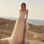 Fusta amplă din tulle fin cade fluid și creează o mișcare naturală, completată de o deschidere discretă ce adaugă un accent contemporan și ușor senzual. Rochia LUMEN este alegerea ideală pentru miresele care își doresc un look aerat, luminos și rafinat, potrivit pentru ceremonii în aer liber, locații naturale sau nunți cu un concept modern și elegant.