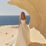 Fusta amplă cade fluid și creează un efect vizual elegant și armonios, completat de o trenă discretă care adaugă rafinament fără a încărca designul. Rochia MALTA este alegerea ideală pentru miresele care își doresc un stil curat, sofisticat și sigur, potrivit pentru ceremonii elegante, locații naturale sau cadre spectaculoase.