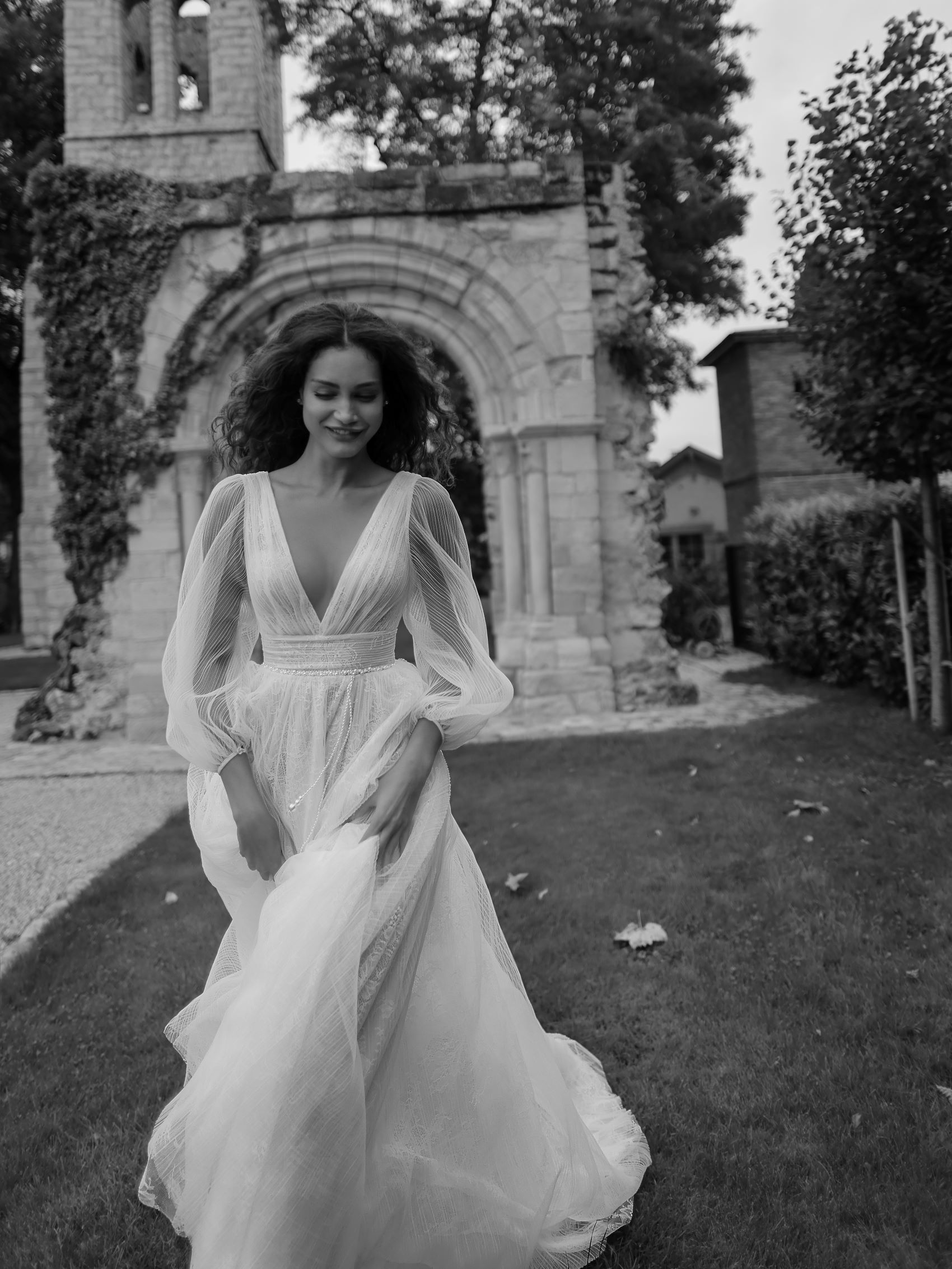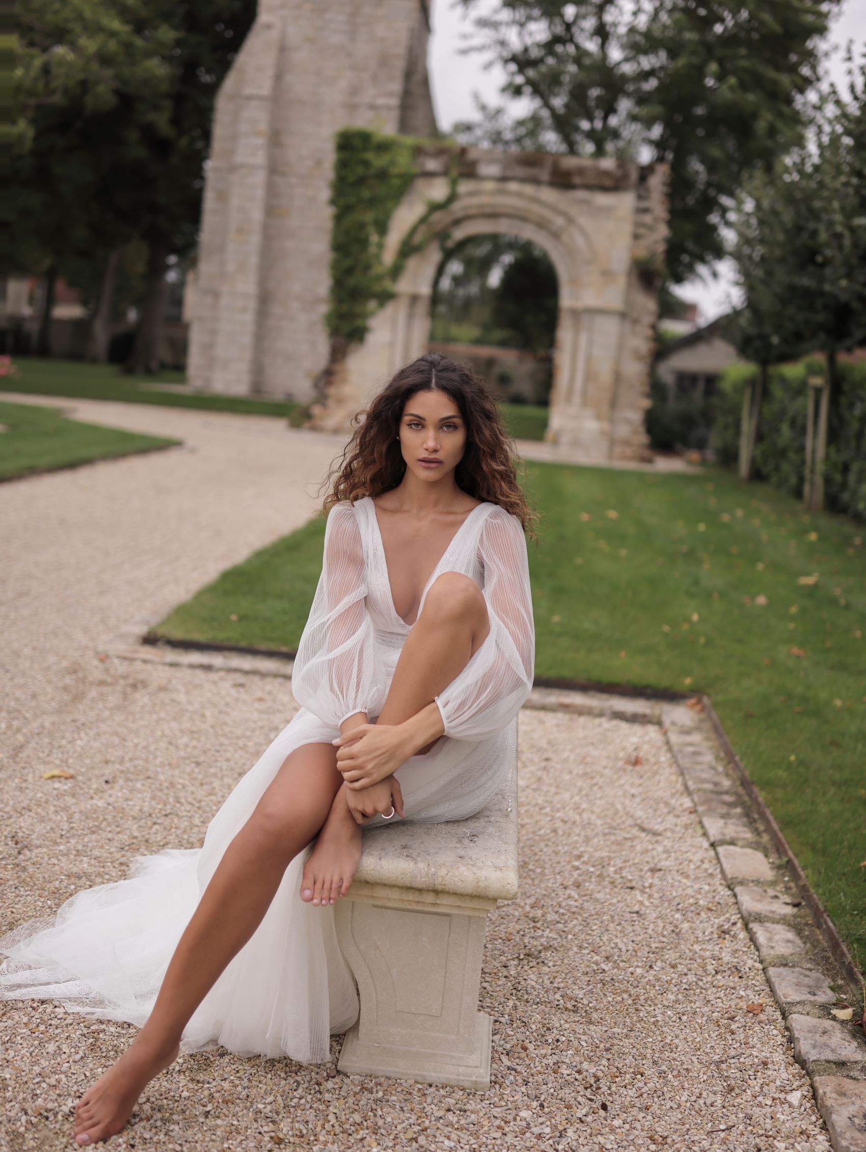 Exquisite gown with a plunging neckline and defined waist. The lightweight bouffant sleeves balance the volume of the semi-sheer skirt also featuring a full-length slit on the left side.