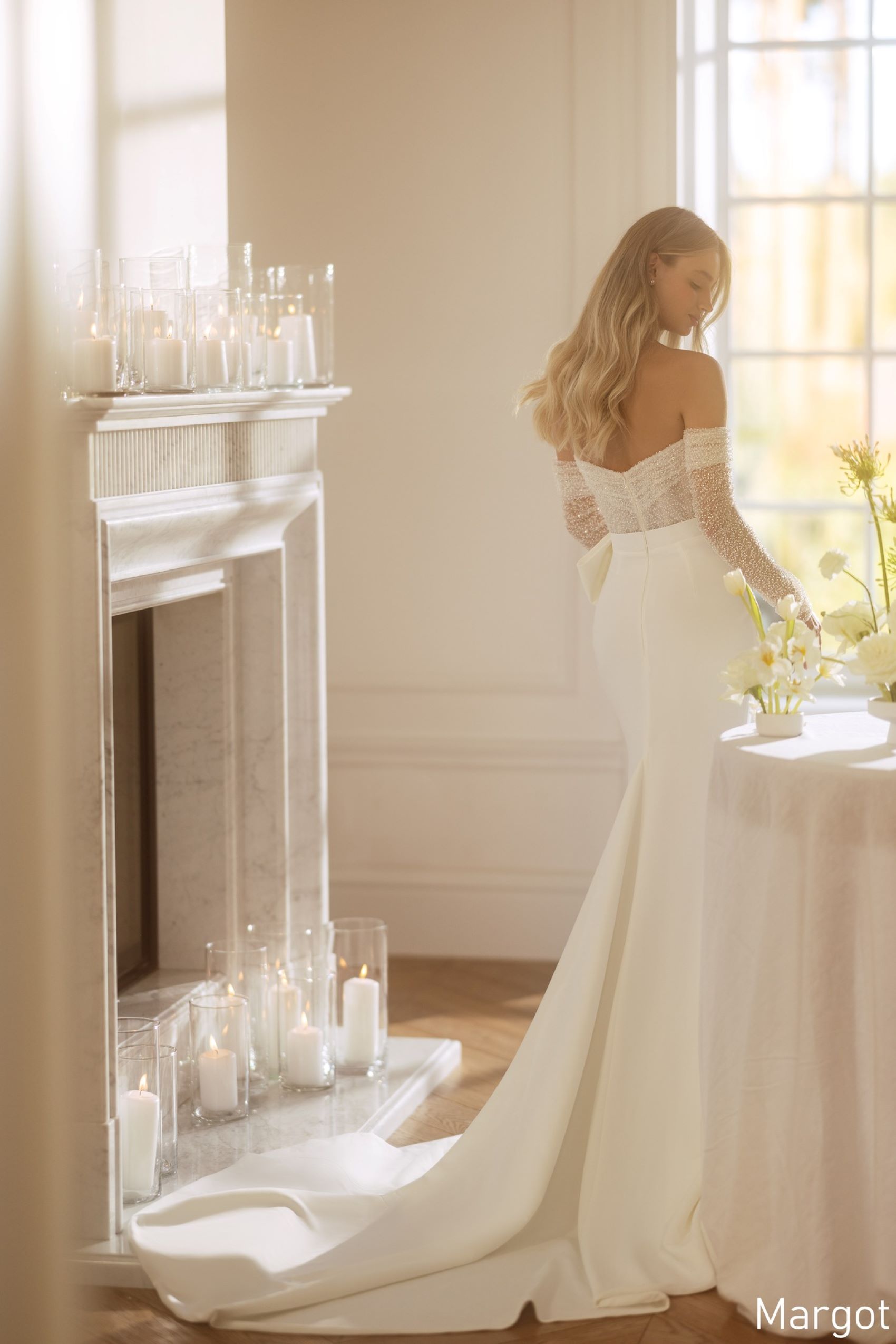 Margot wedding dress – true embodiment of grace and elegance. Mesmerising cut, which delicately hugs the figure, makes this dress distinctive and feminine. The use of refined and light fabrics adds to the feeling of airiness and comfort.