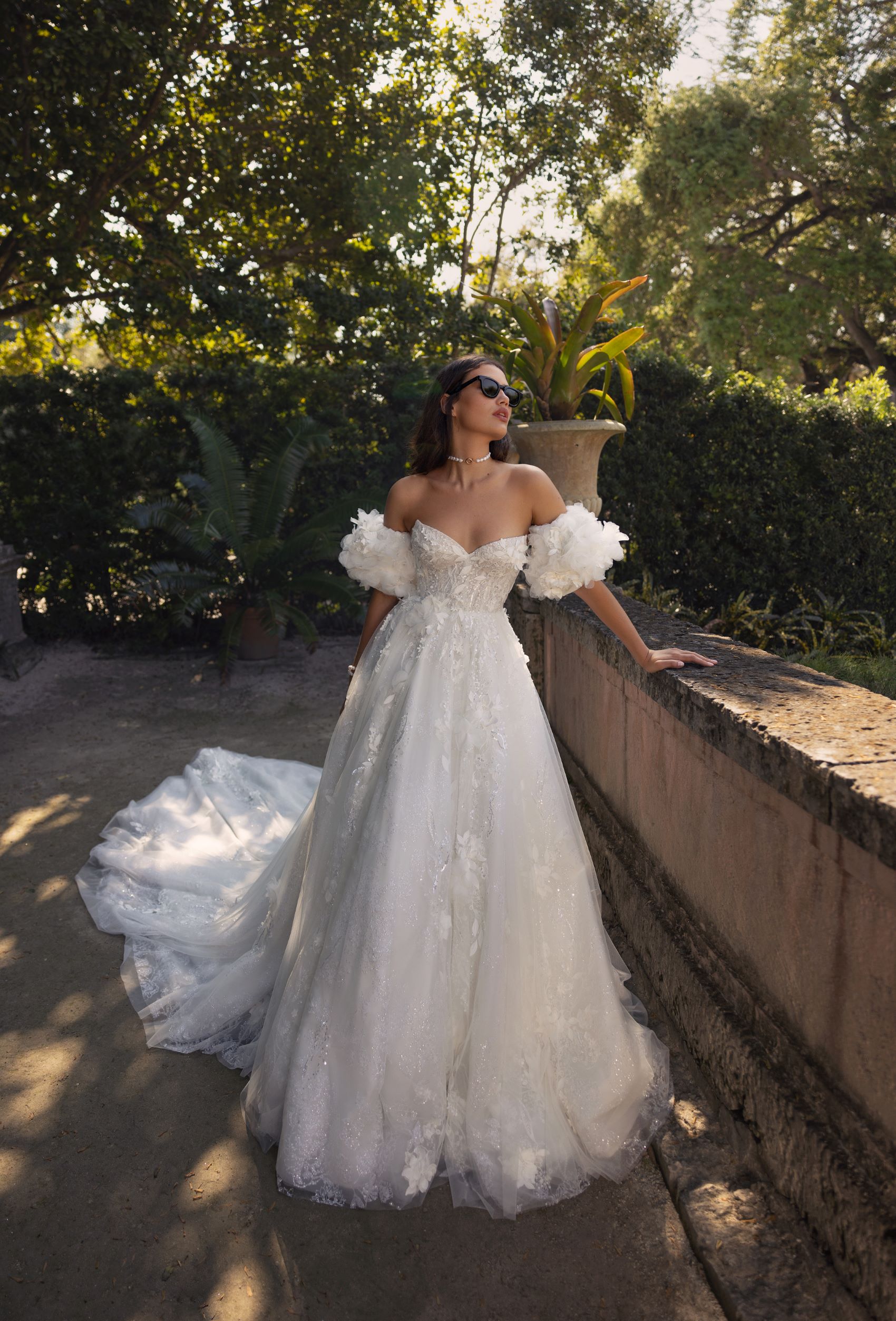Make your wedding day dreams a reality with this enchanting A-line wedding dress. The intricate floral lace fabric creates a romantic and feminine feel, while the corseted bodice with a sweetheart neckline accentuates your curves and exudes elegance. The detachable puffy sleeves add a playful touch and allow you go for a customizable look. The A-line silhouette flows effortlessly, ensuring both comfort and grace as you walk down the aisle. This dress is perfect for the bride who wants to feel both whimsical and sophisticated while walking down the aisle.