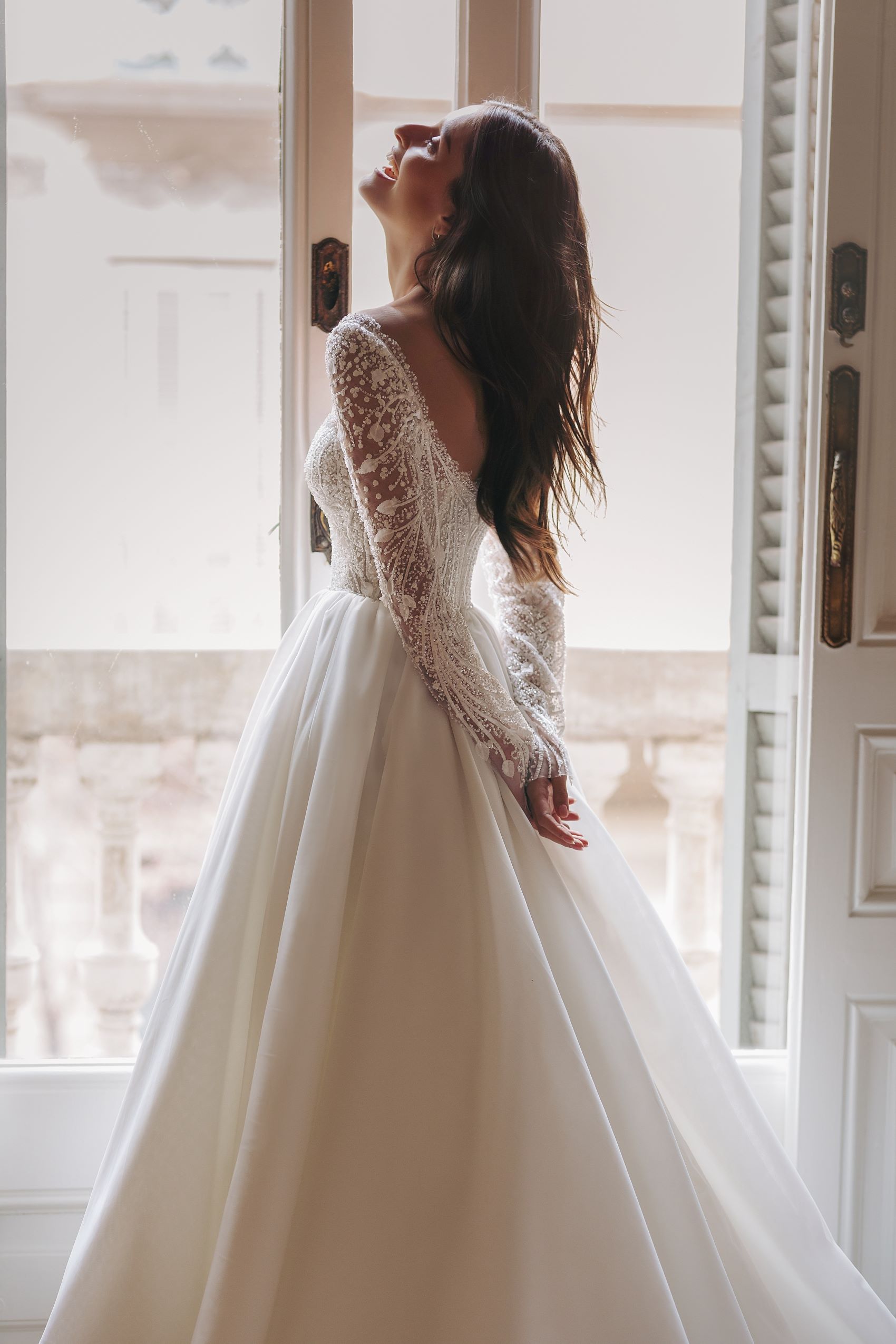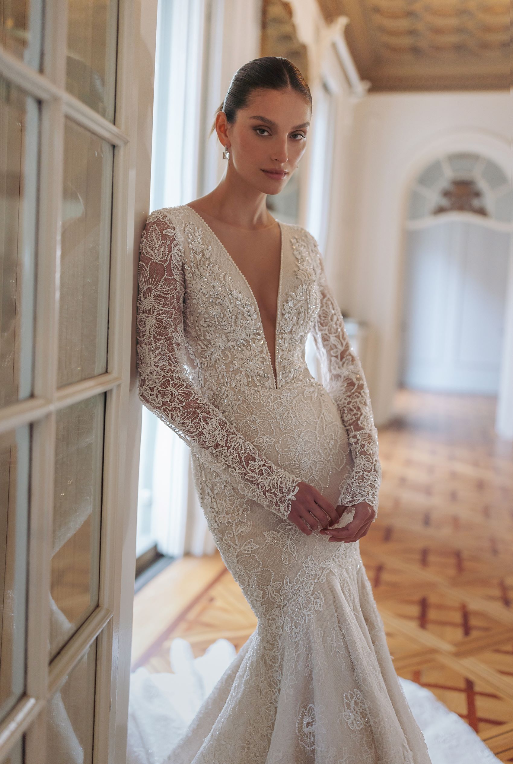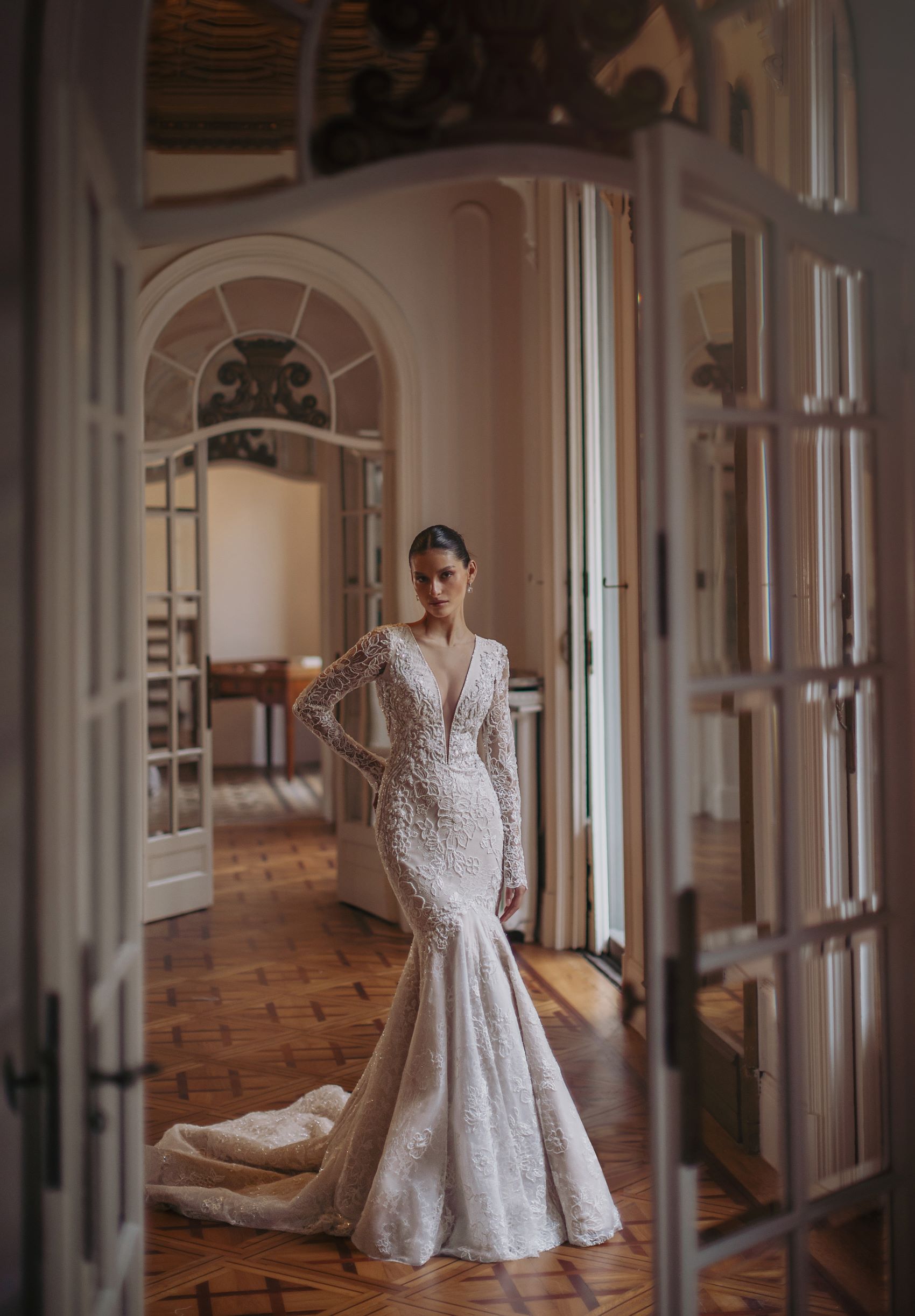 Mendosa — mermaid tail silhouette made of guipure beaded by hand lace with deep V-neck, long sleeves and elongated trail.