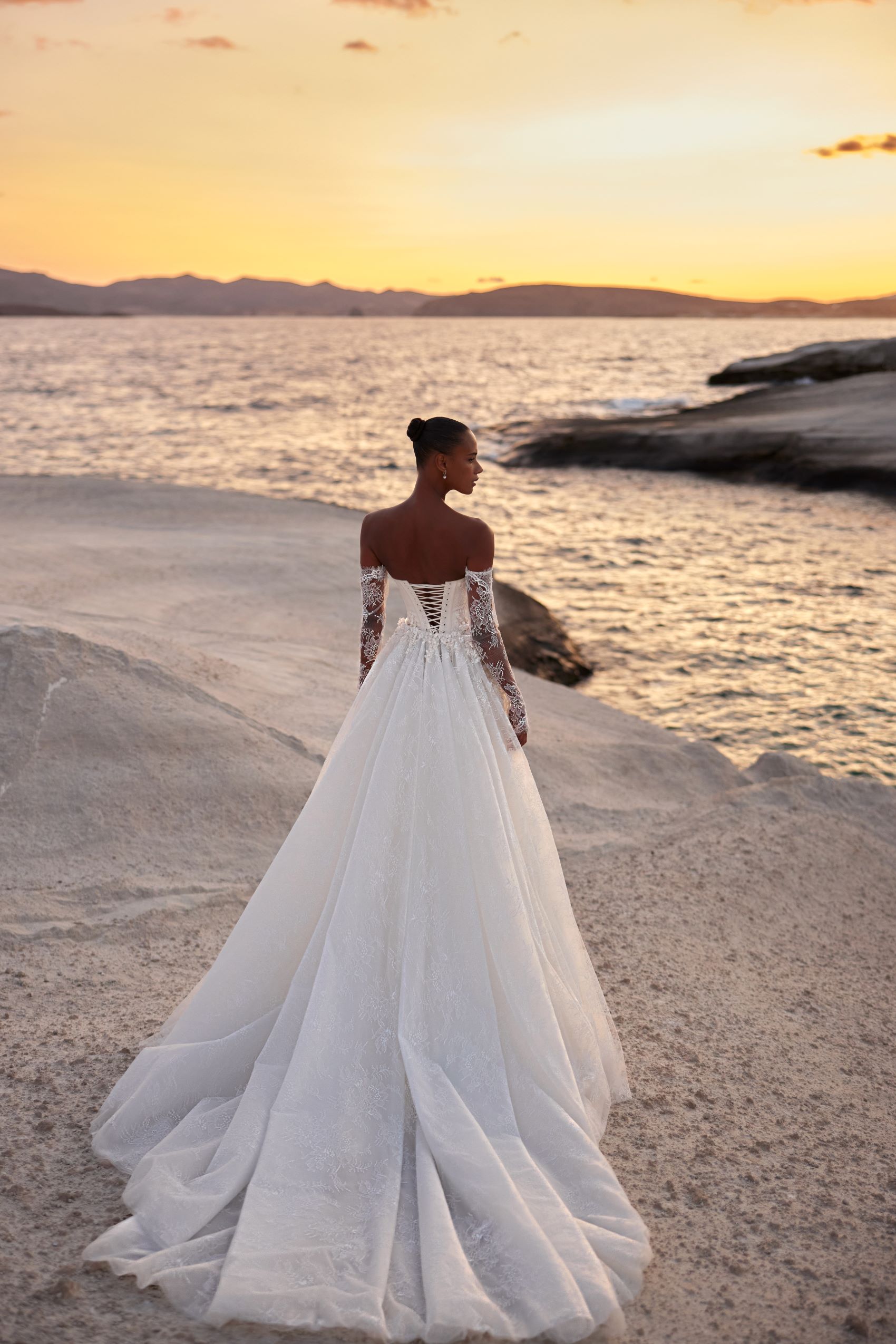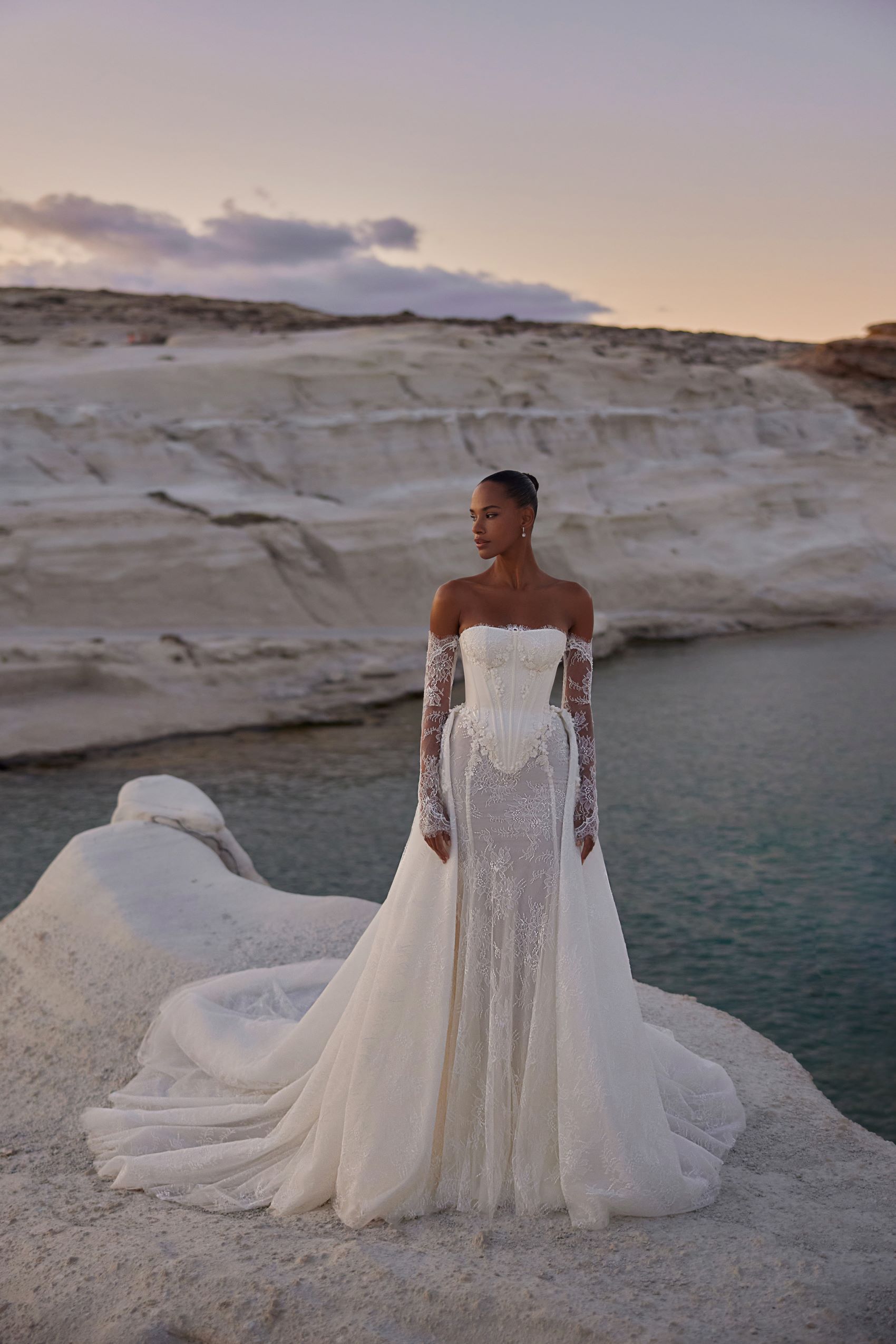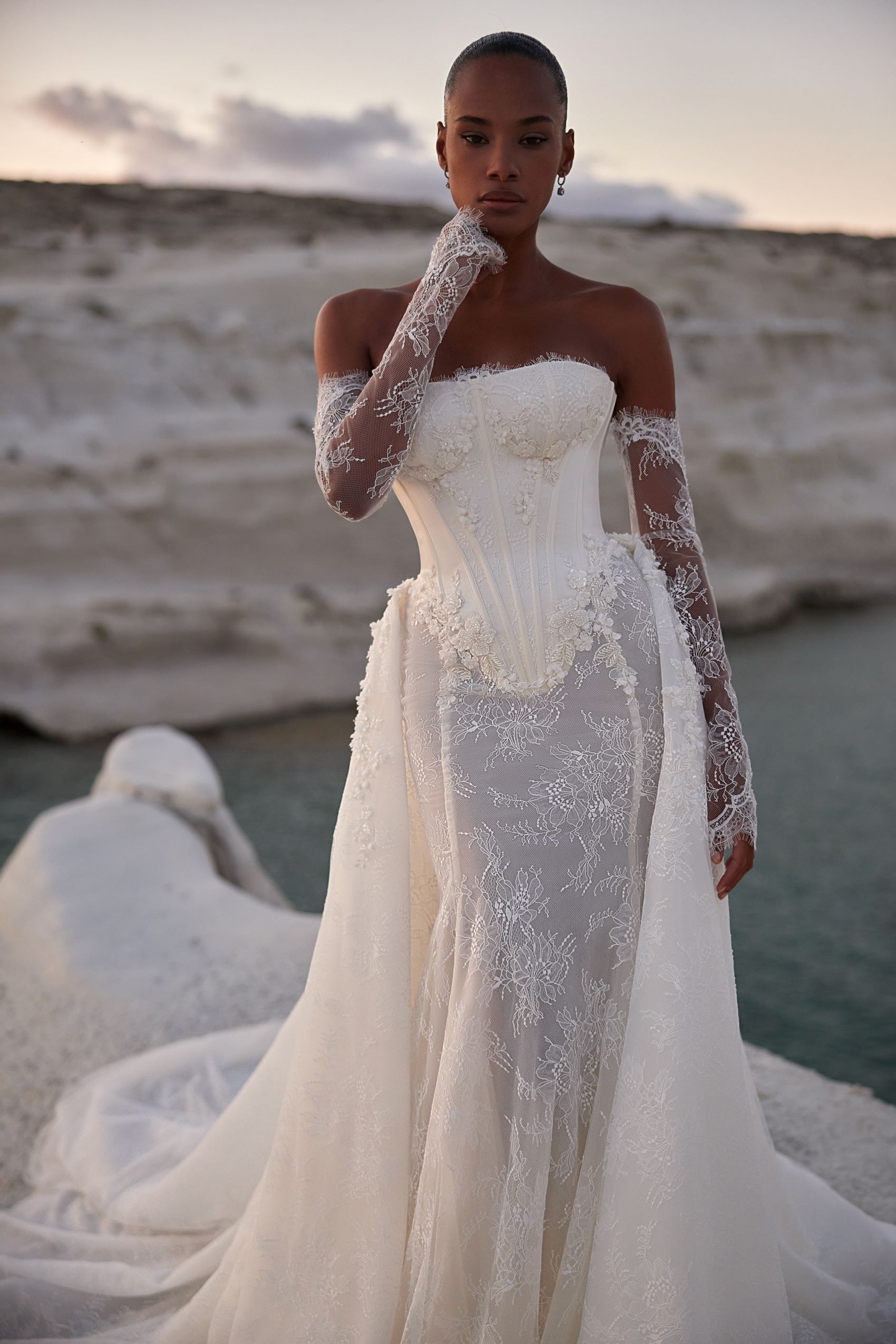 Delicate trumpet dress with a firm corset and a straight rounded neckline. The corset is richly decorated with floral embroideries and shiny beads, with the most emphasis on the waistline, adorned with sophisticated flower applications. The train is voluminous and soft, while detachable lace sleeves complement the outfit, adding even more softness.