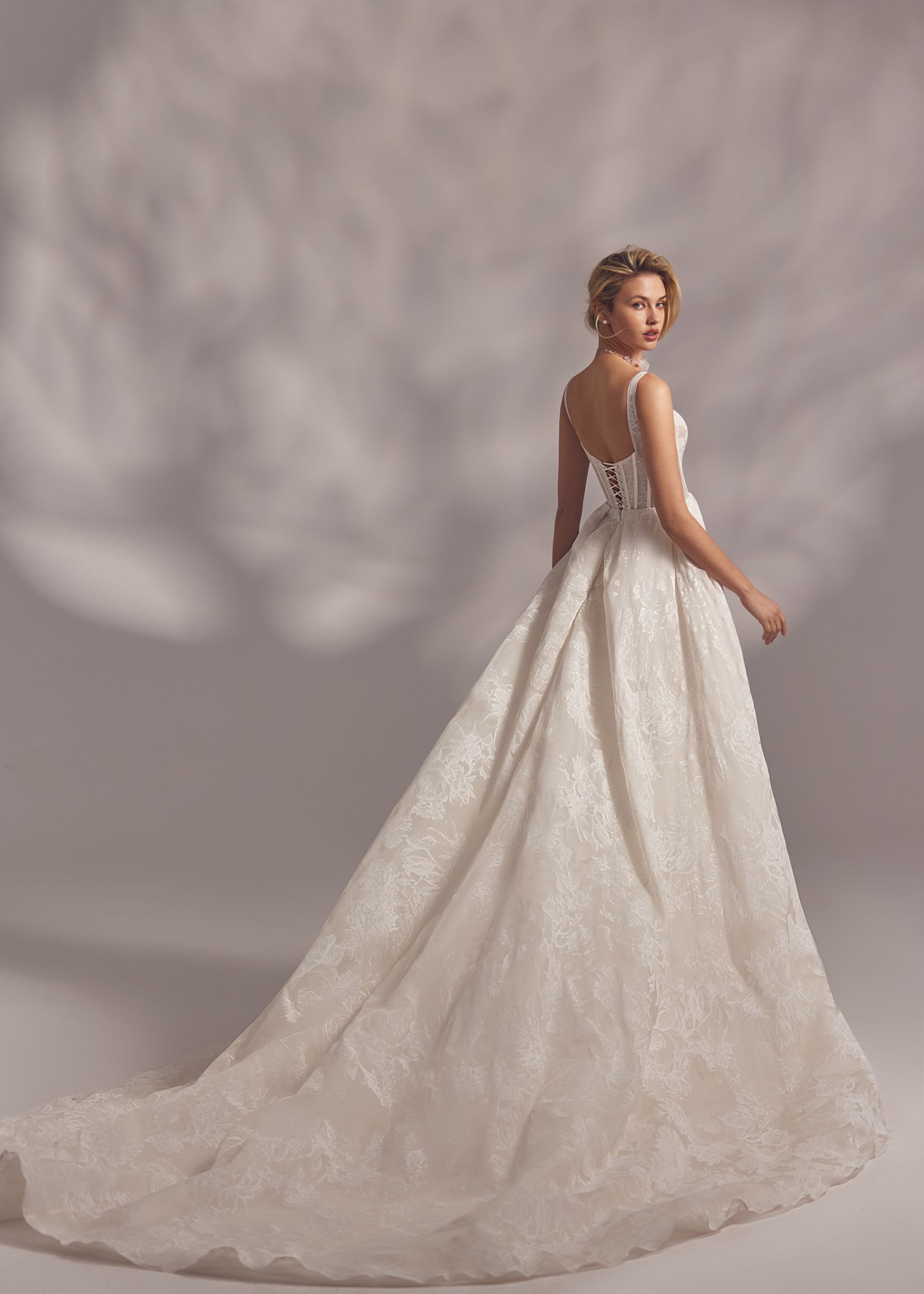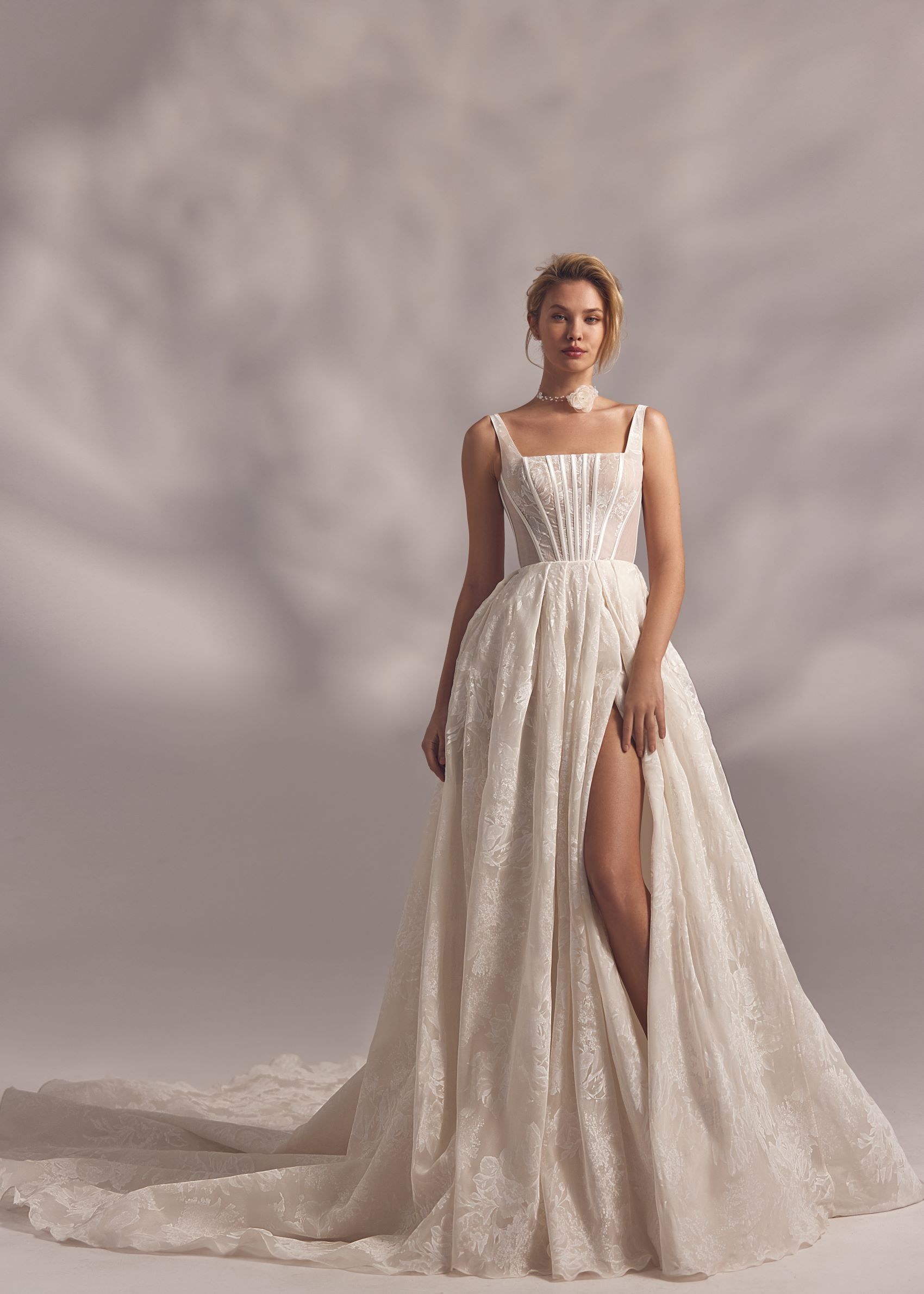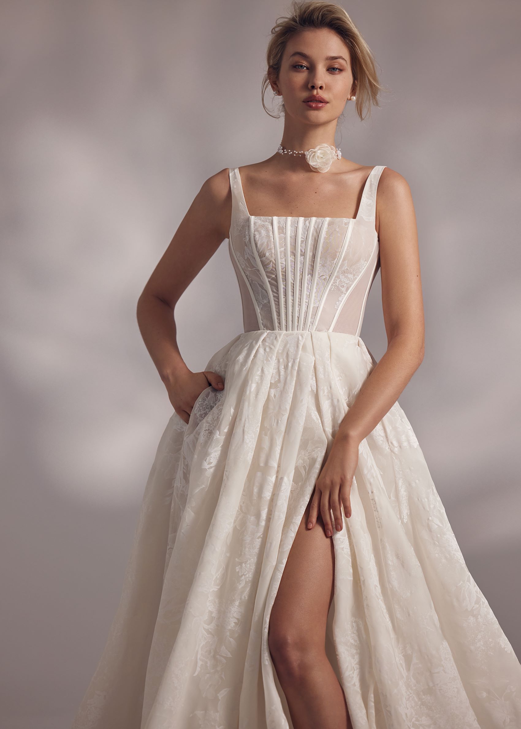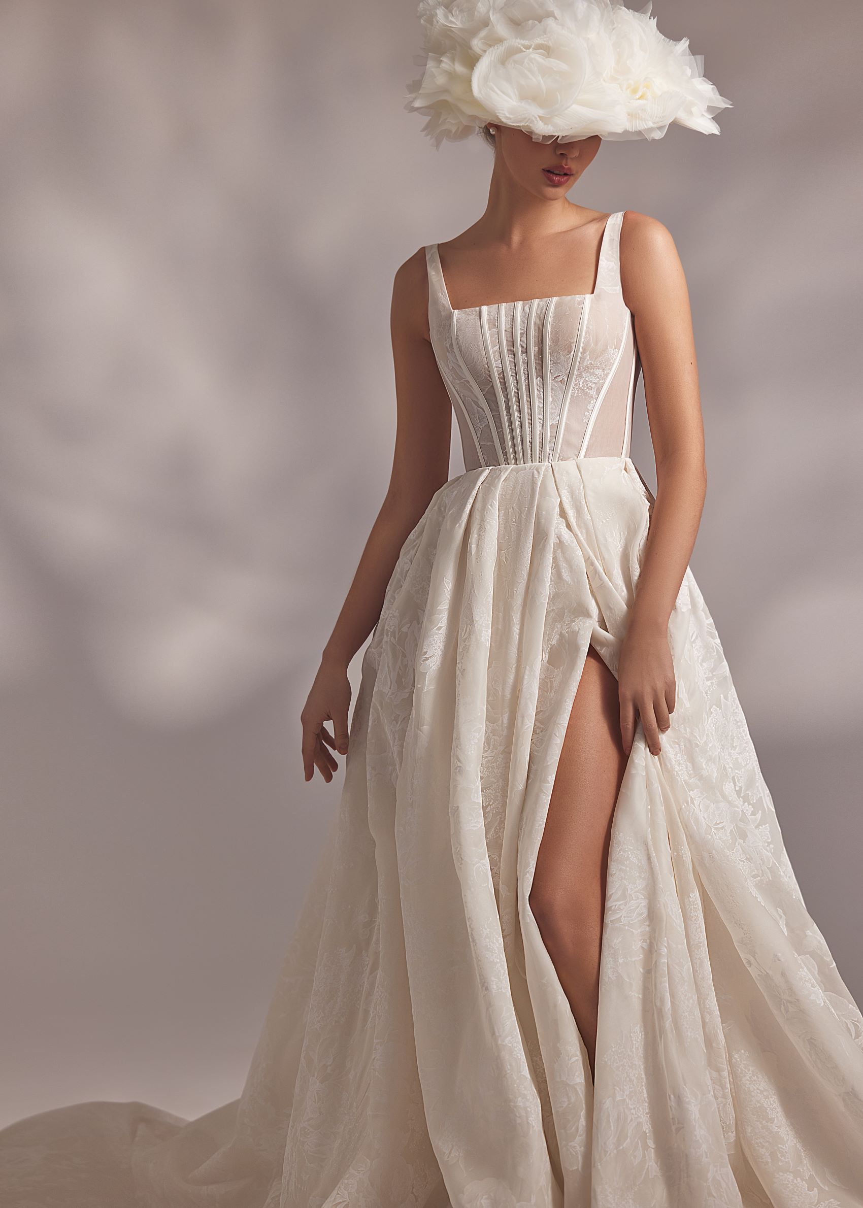 Moraya – camisole detailed corset dress with lightweight floral lace ornaments and split skirt covered with tuille lace embroidered overlay.