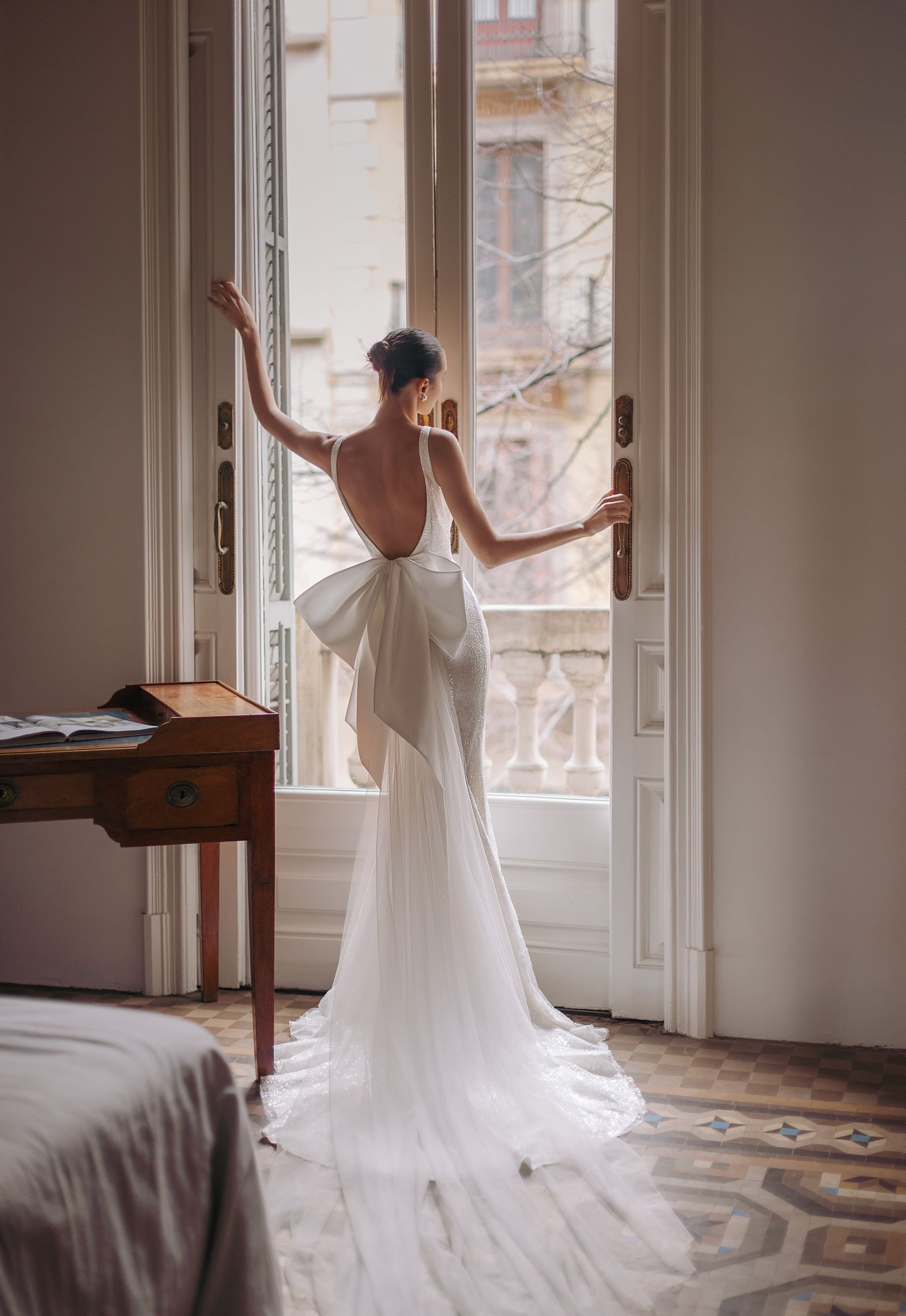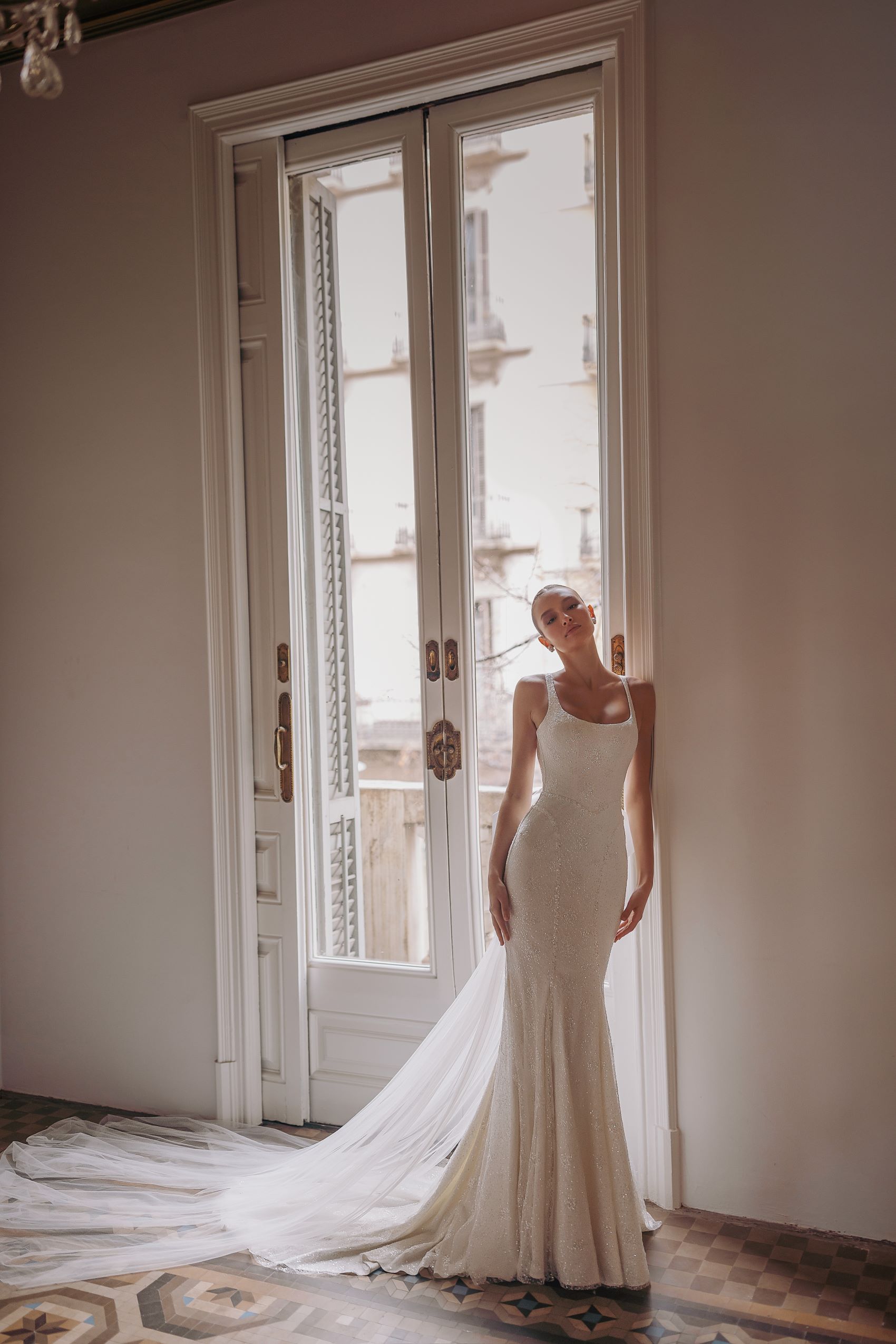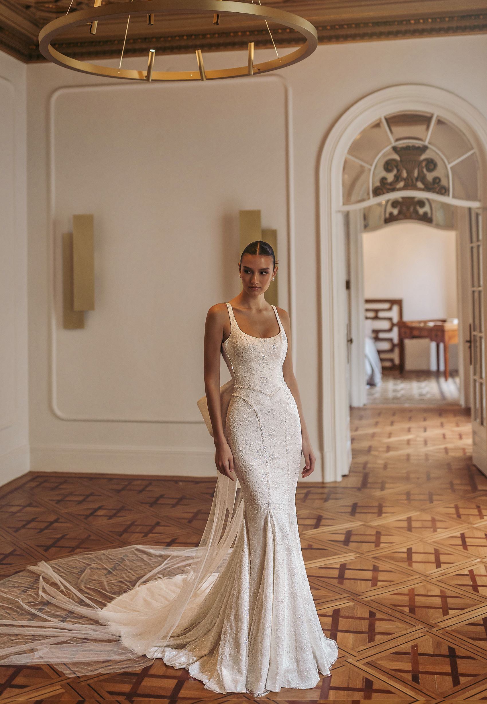Nicoline — round-neck wide strapped dress with detailed upper part of the mermaid tail skirt and sparkling beads meticulously embroidering the dress all over. Complemented with big detachable bow in the lower part of open back.