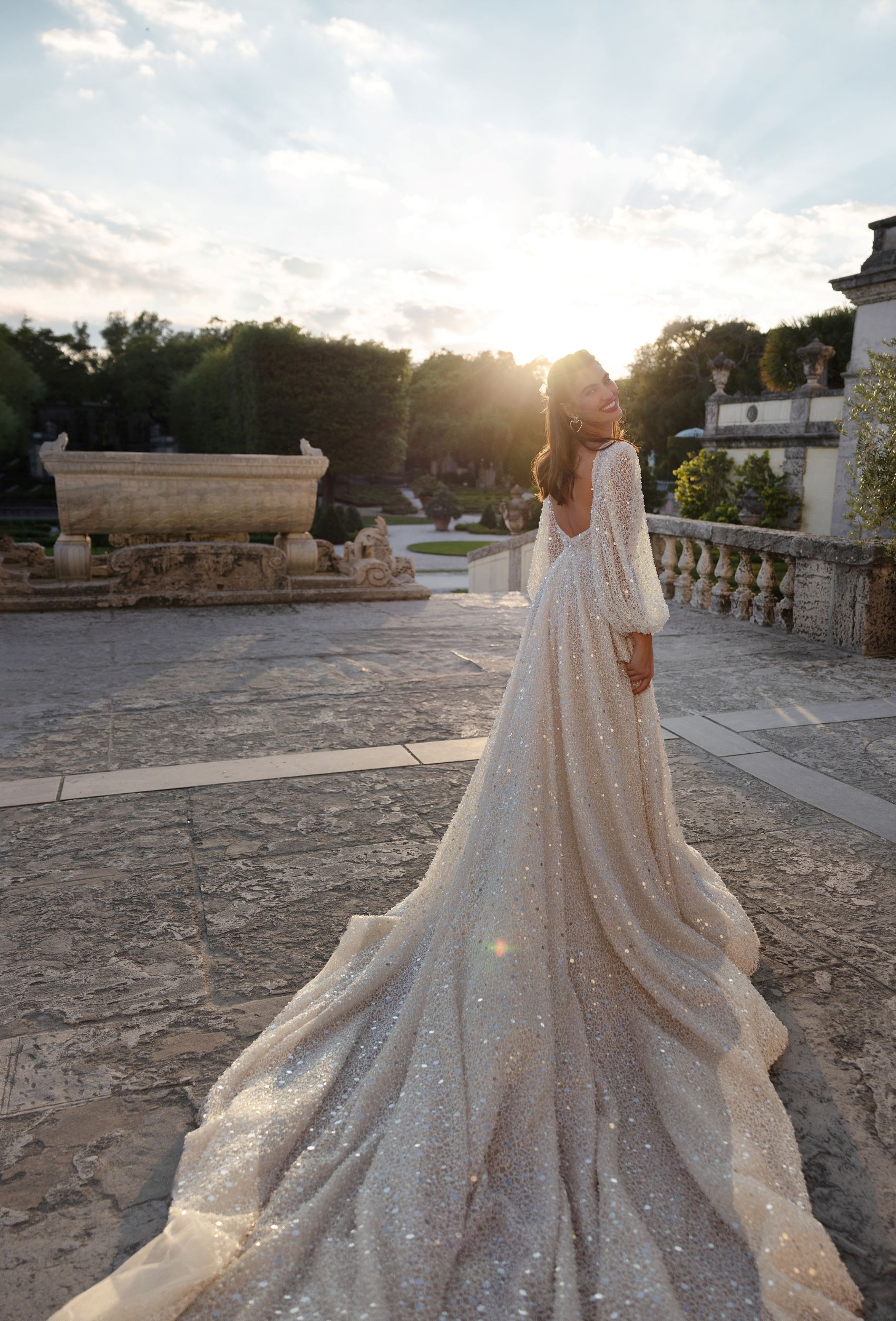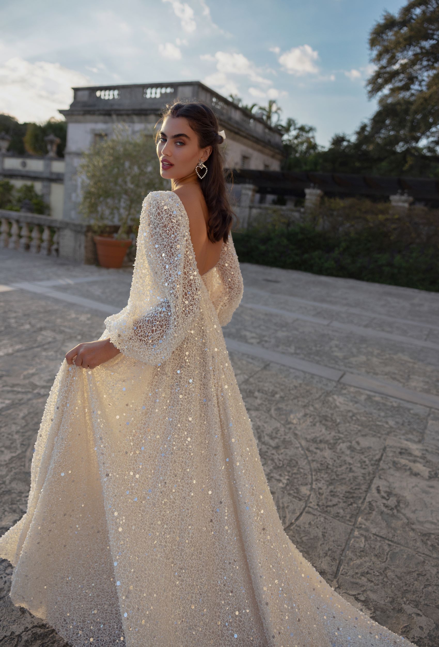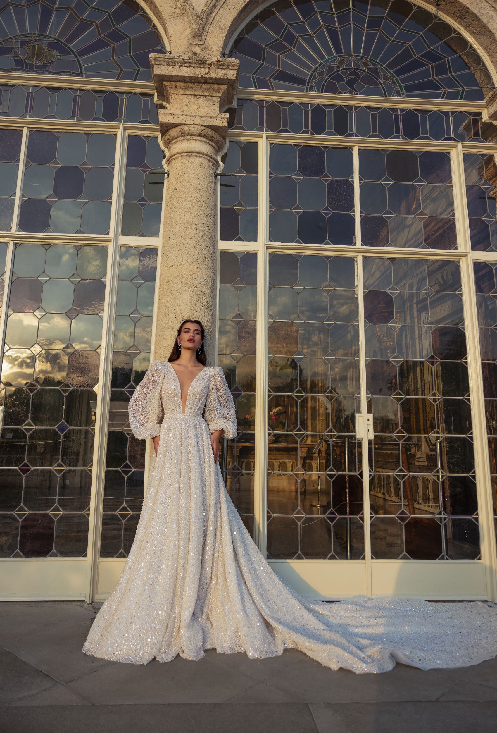 Be the epitome of elegance on your wedding day with this shimmering A-silhouette wedding dress. The V-neckline and long voluminous sleeves add a touch of sophistication to the dress, while the shimmering fabric adds a dash of glamour. The dress hugs your curves in all the right places and flows into a long, voluminous skirt that cascades elegantly with every step you take. It’s the perfect dress for the bride who wants to feel both regal and glamorous on her special day. Get ready to turn heads with this enchanting wedding dress.