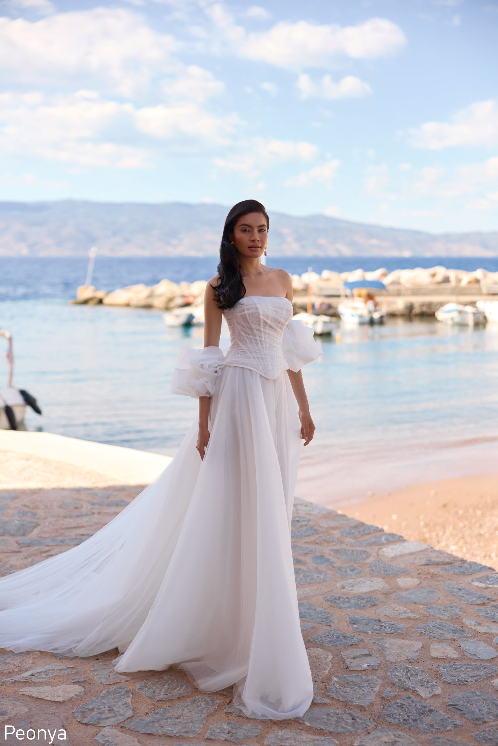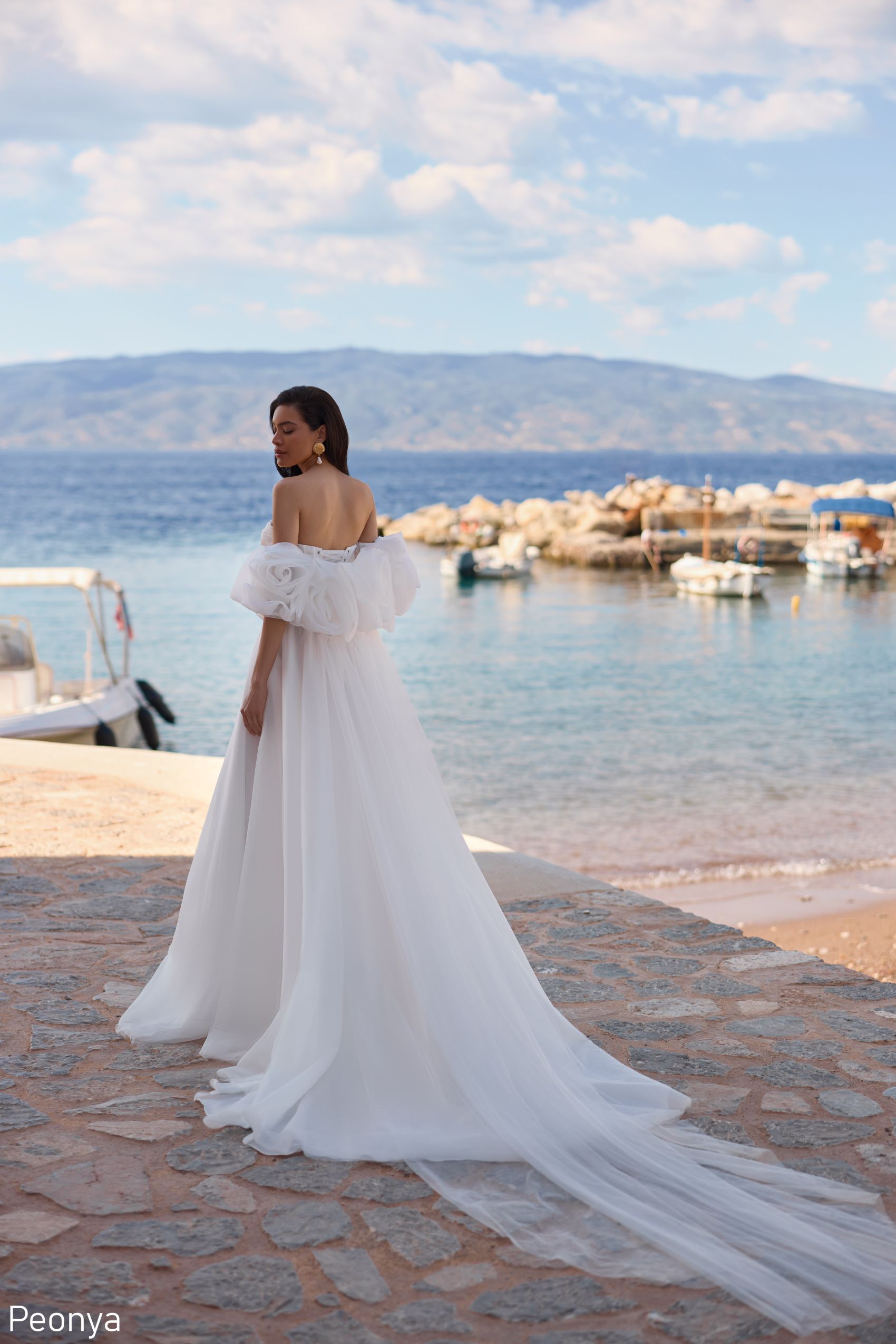 Fusta lejeră, confecționată din straturi fluide de tulle fin, se mișcă cu grație la fiecare pas, conturând o siluetă vaporosă și extrem de feminină. Rochia Peonya este ideală pentru o nuntă pe plajă, într-o grădină sau un decor minimalist, unde fiecare detaliu contează.