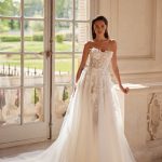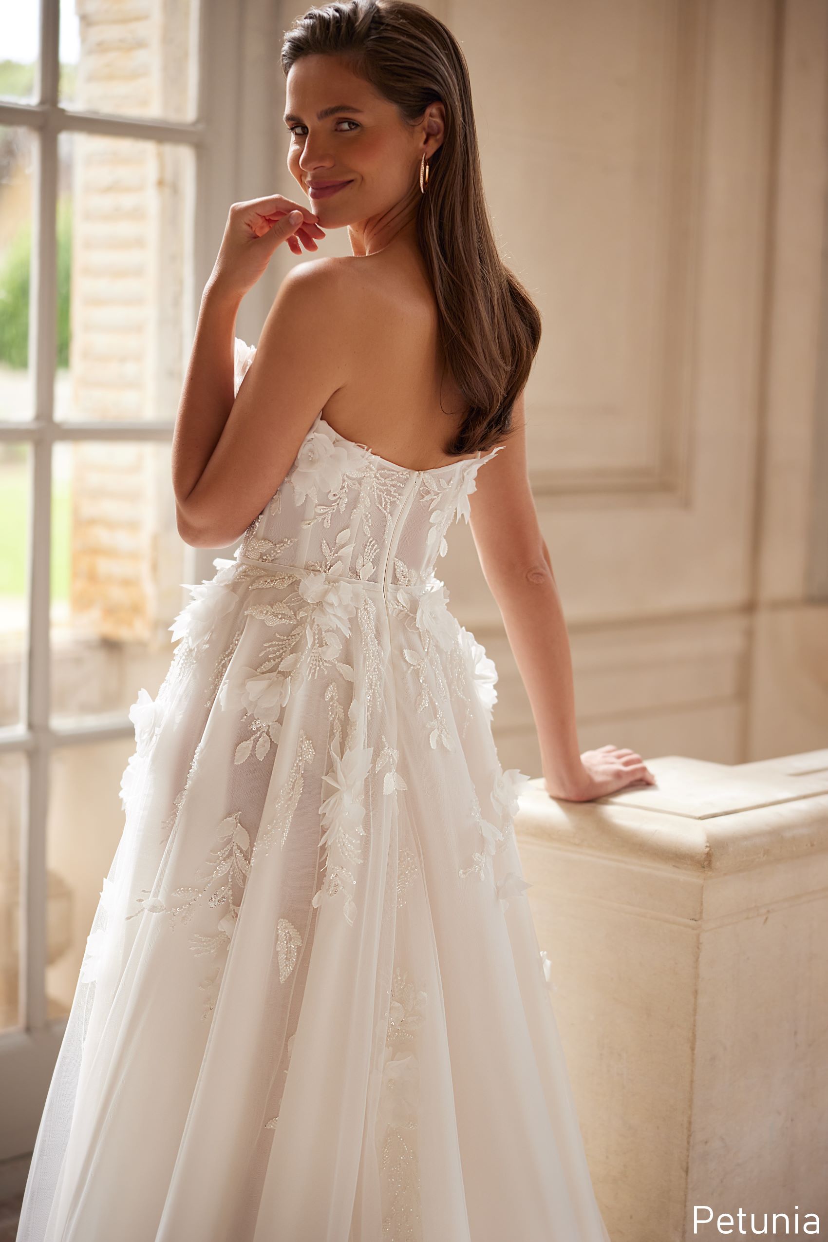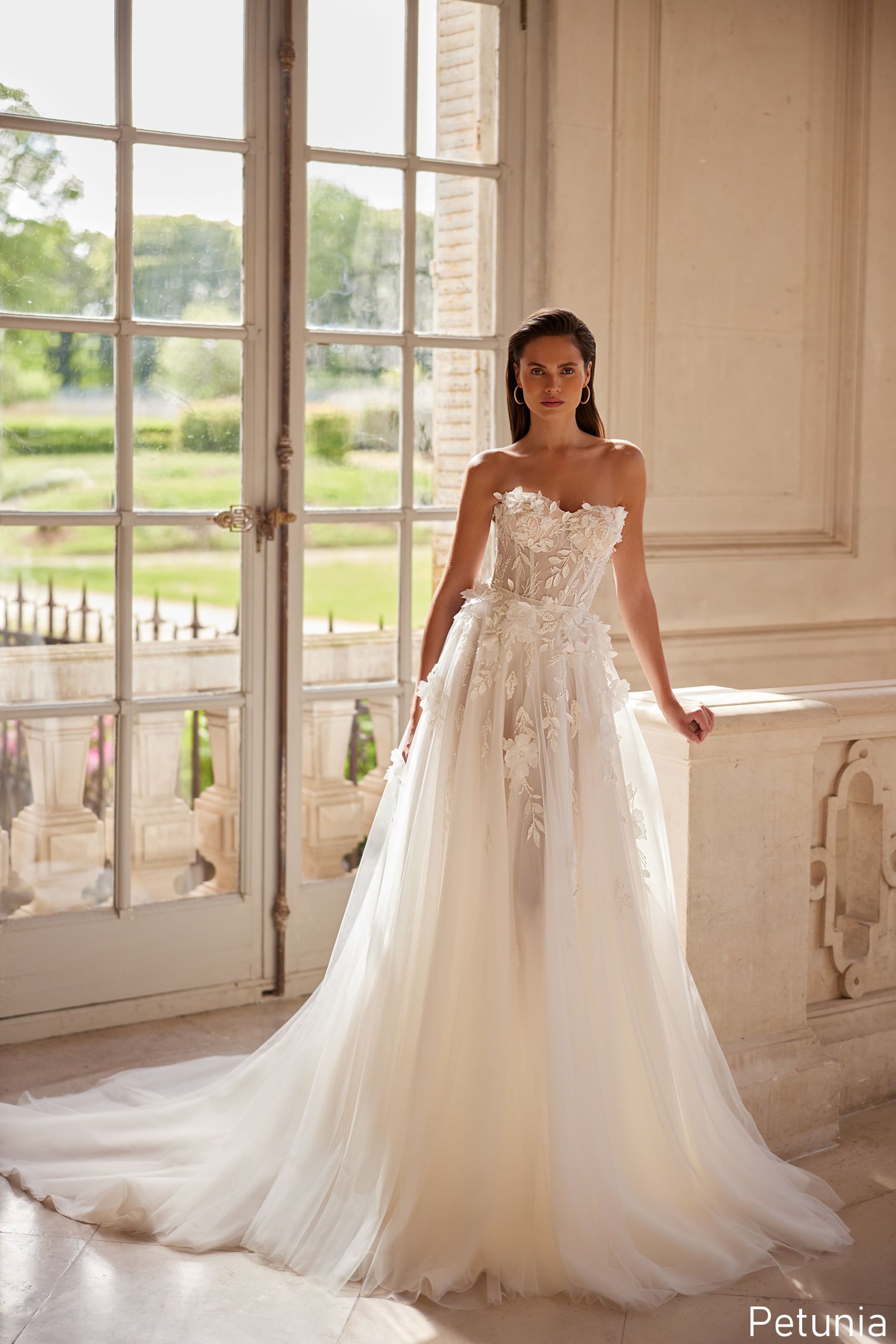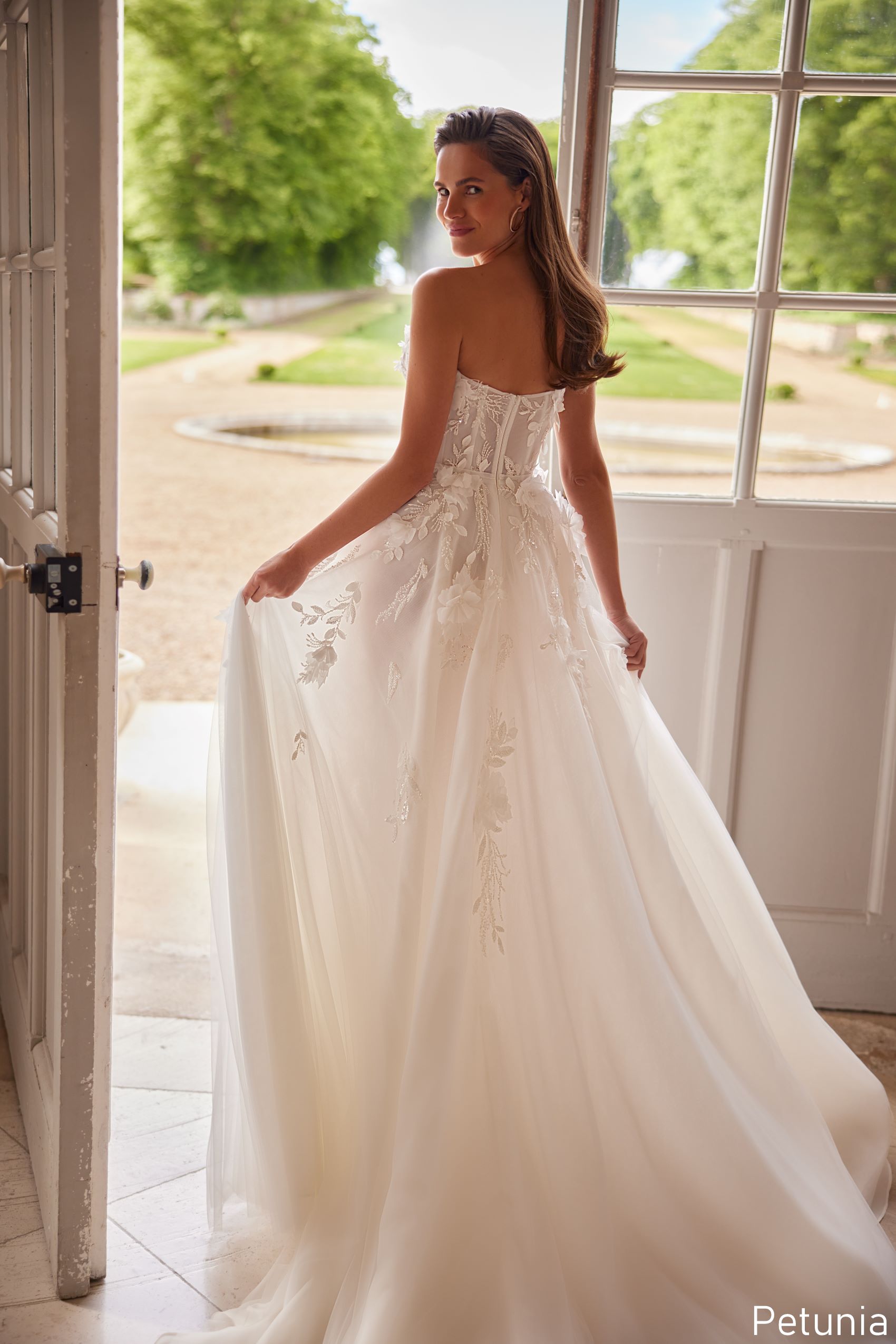 Petunia is an elegant wedding dress with a voluminous skirt made of light tulle, which creates a delicate and romantic image. The corset is decorated in embroidery with floral motifs that add charm and sophistication. Open shoulders and an exquisite silhouette make this dress perfect for the bride who wants to look charming and feminine.