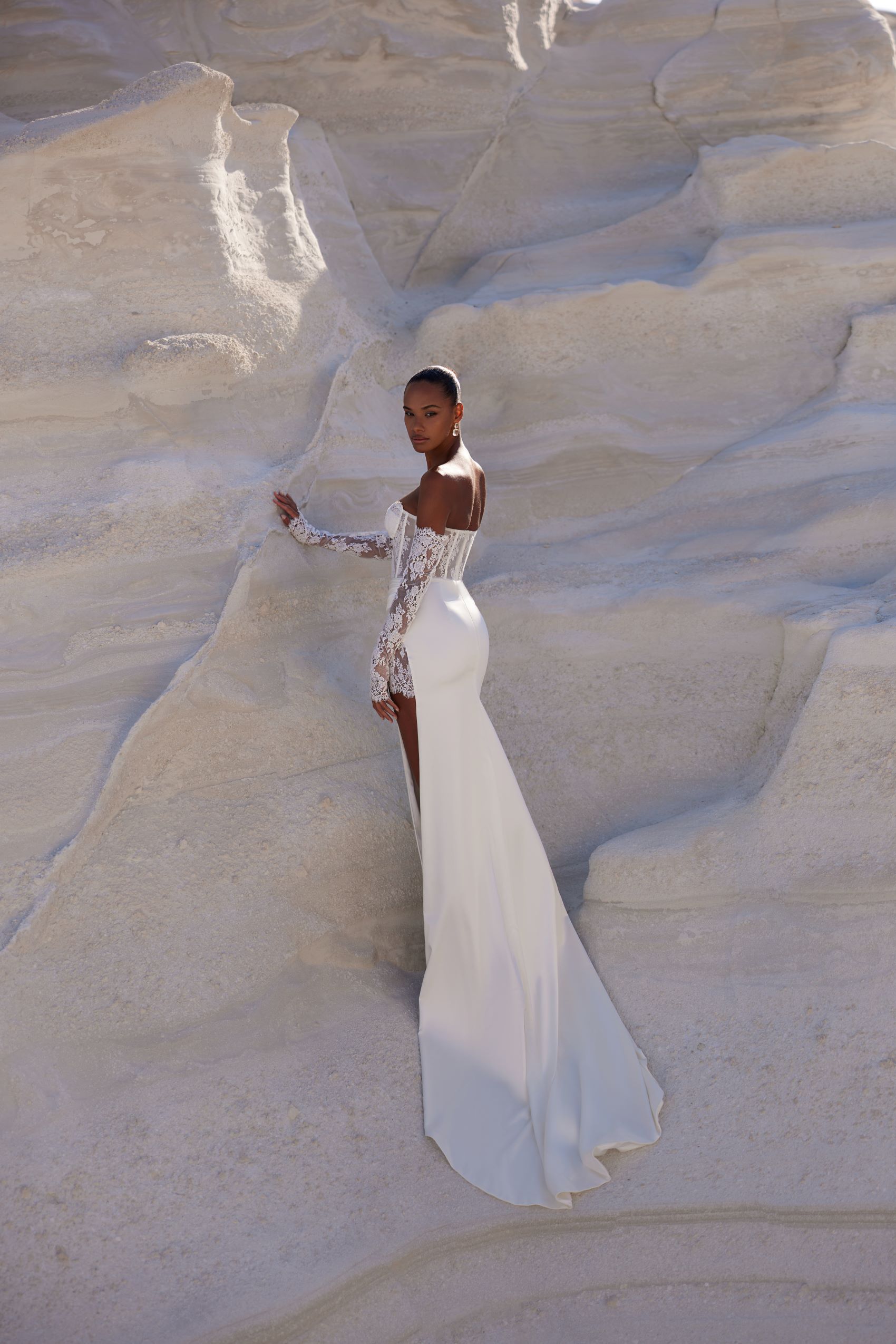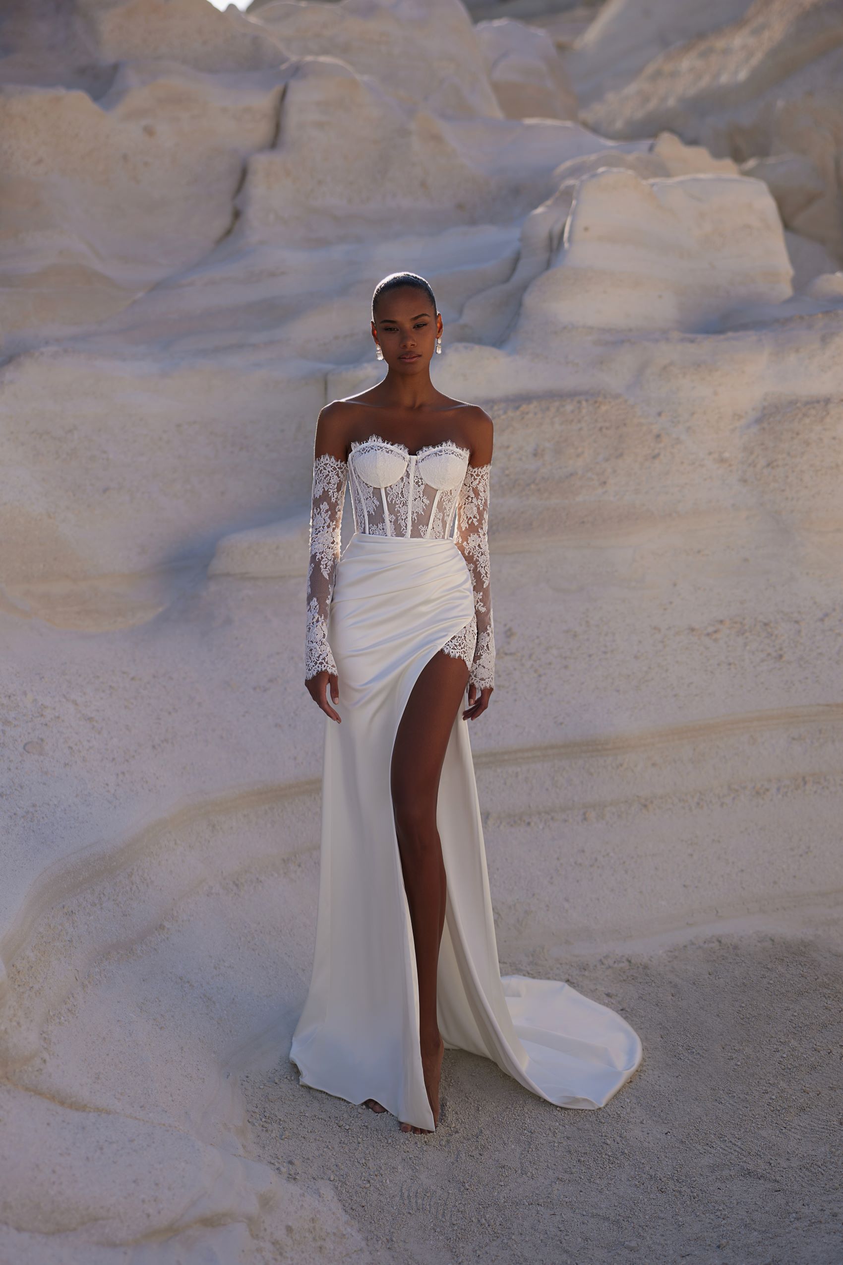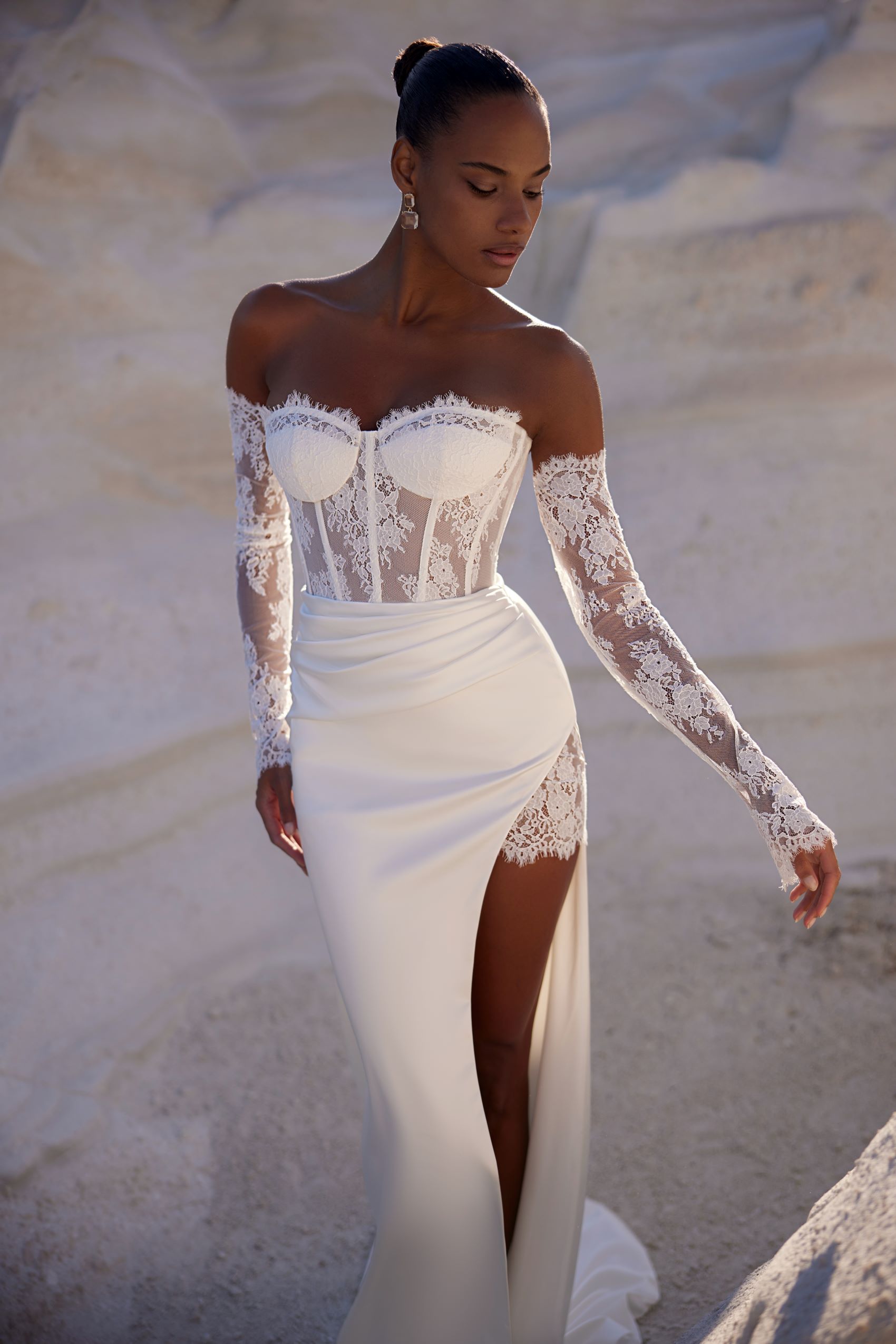 Exquisite dress, featuring a firm corset with a heart-shaped neckline, meticulously refined with floral lace. The satin fabric skirt features a slit on the left, revealing a delicate lace underskirt. Detachable lace sleeves adorn the arms, giving the look a polished touch.