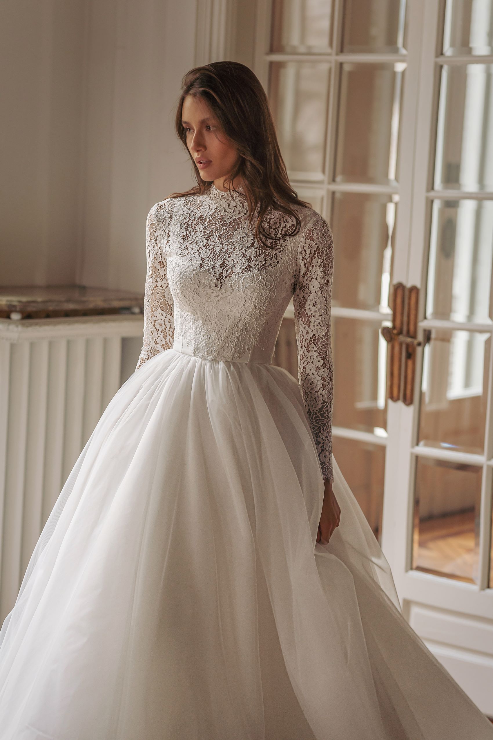 Promise — corset based gown with round cutout neckline and tulle voluminous skirt. Complemented with detachable guipure lace long sleeve turtle neck.