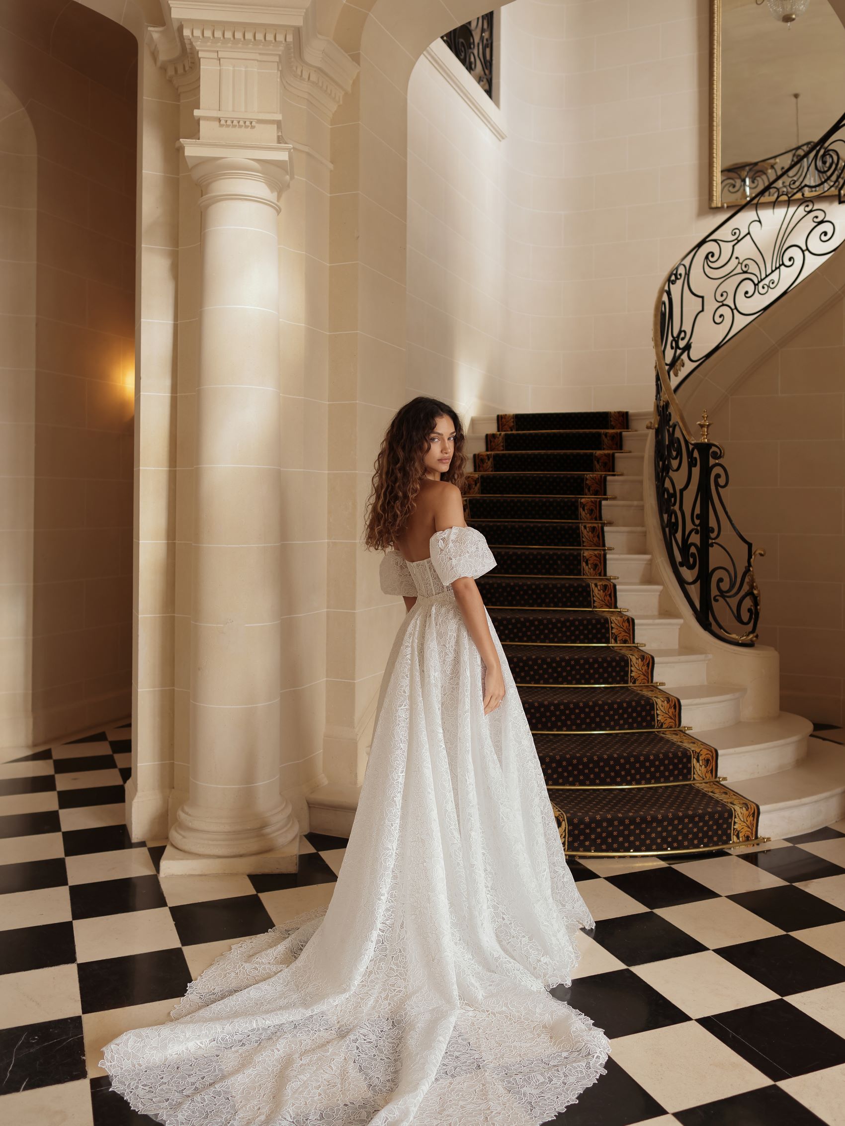 Stylish guipure gown with detachable lantern sleeves and sweetheart neckline, featuring a long train. The fitted bodice perfectly shapes the silhouette, highlighting the waistline with a matte band and emphasizing the lightness of the slightly pleated skirt with a full-length slit on the left side.