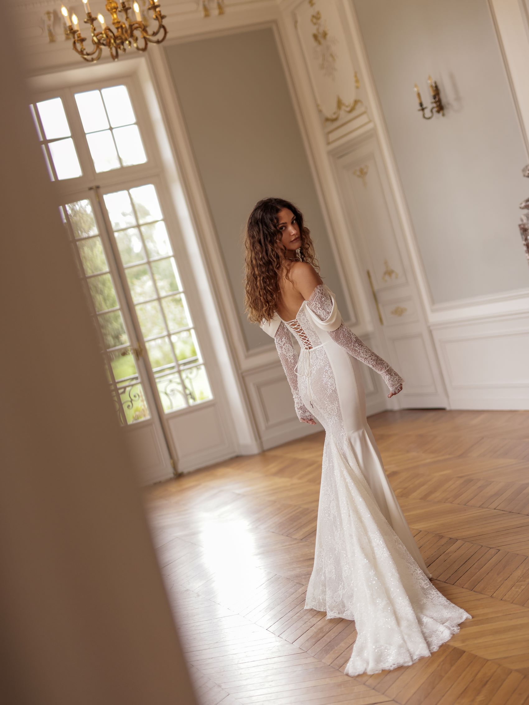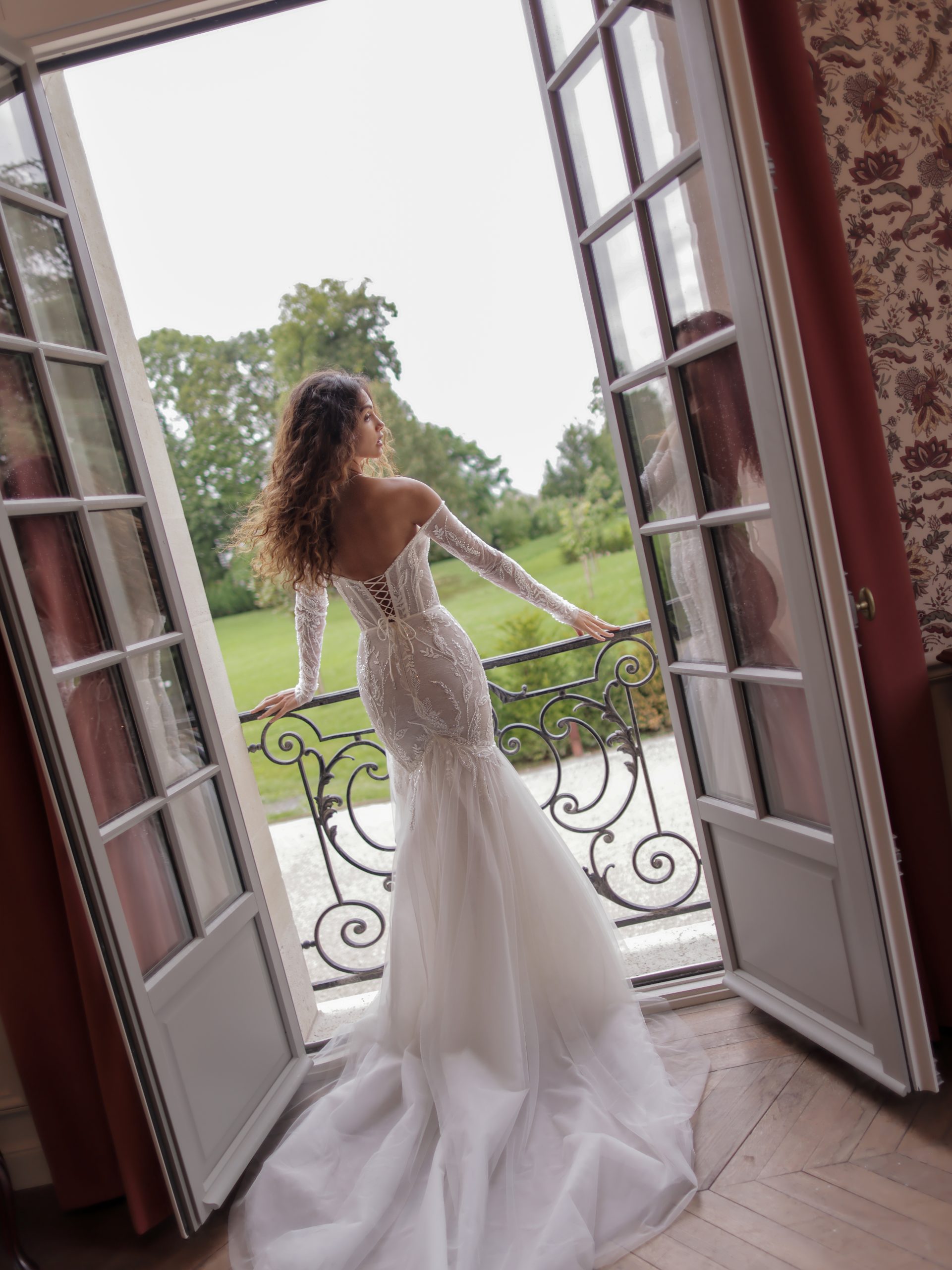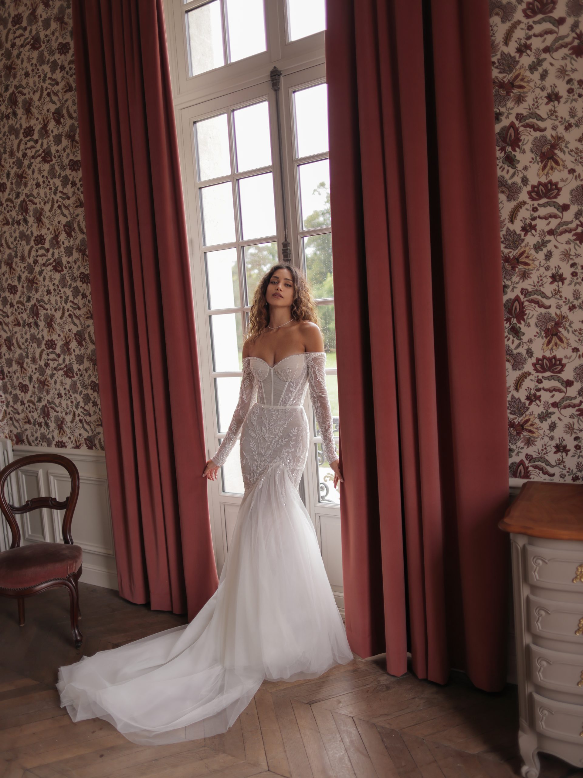 Cold-shoulders mermaid gown crafted from semi-sheer fabric and decorated with floral embroideries and sparkling beads. The bodice features an outlined waist, while the hem of the skirt is a voluminous semi-sheer train descending from the hip level to the floor.
