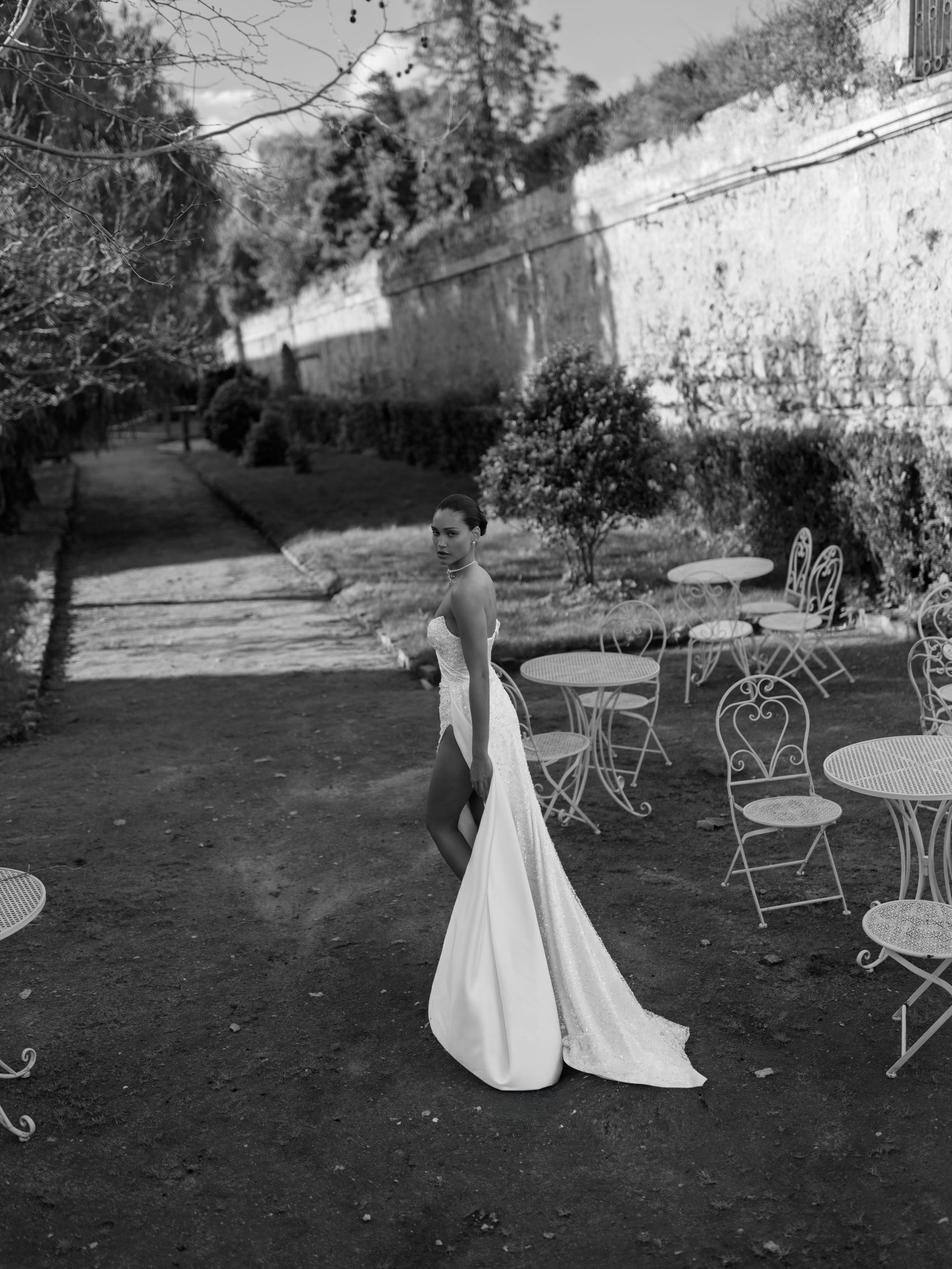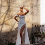 Un model spectaculos, creat pentru mireasa care îndrăznește să fie diferită. Rochia Saturn impresionează prin croiala sa tip sirenă, acoperită cu detalii strălucitoare, care conturează silueta într-un mod rafinat. Decolteul asimetric și fanta adâncă pe picior adaugă un aer de feminitate irezistibilă și putere interioară.