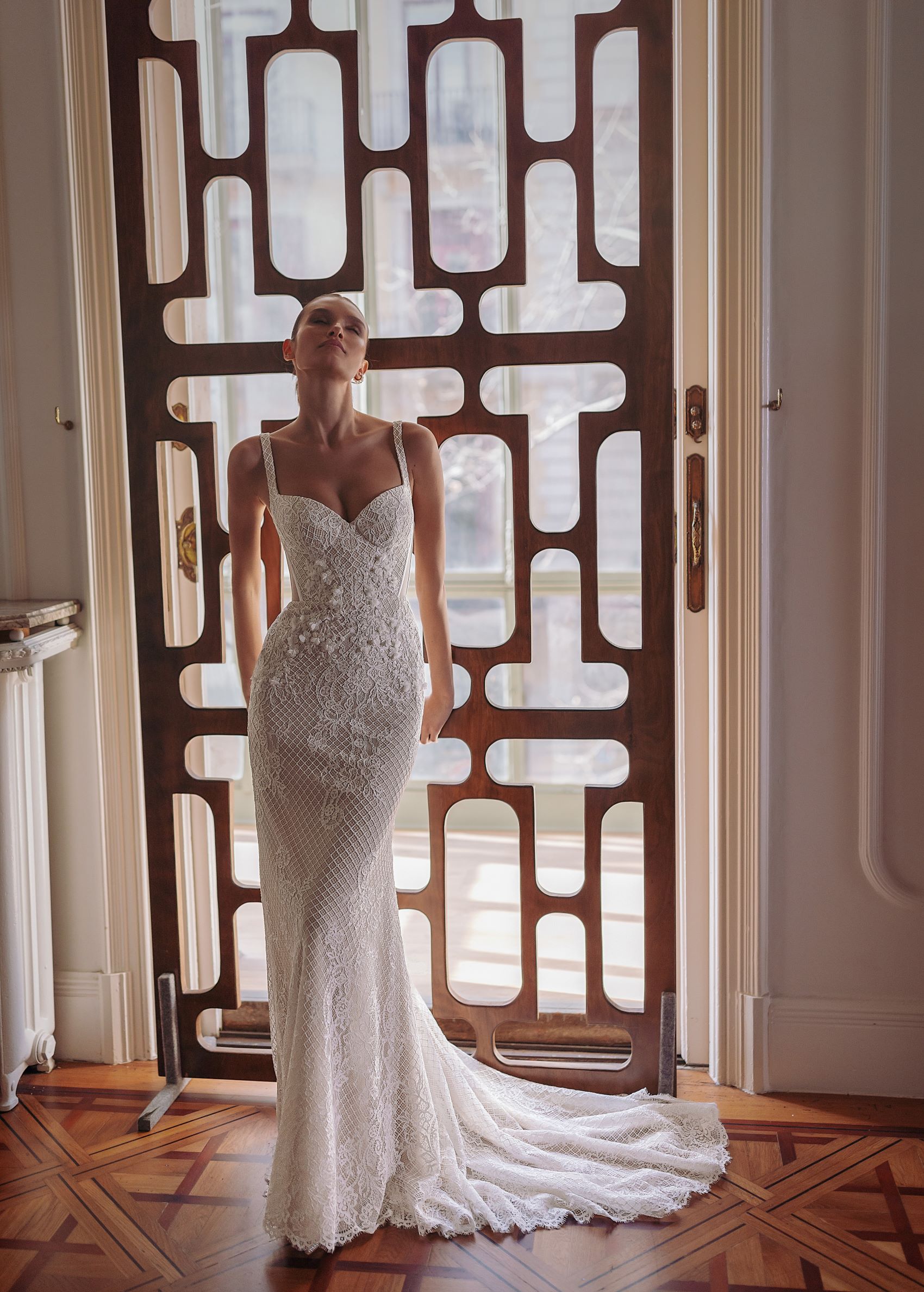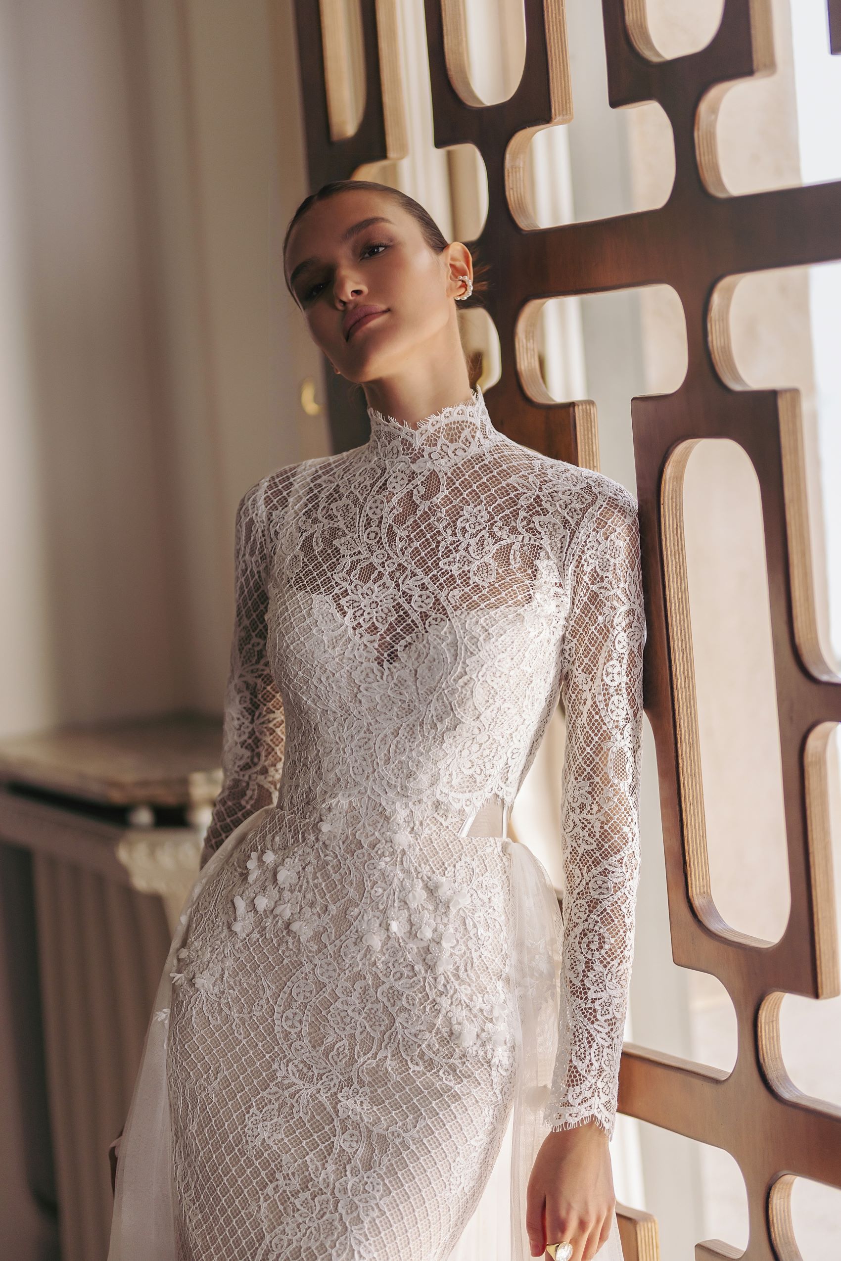 Sequoia — strapped heart-shaped neckline mermaid silhouette dress with handicraft embroideries featuring small outlined flowers and guipure lace overlay. Complemented with detachable turtle neck bolero made of guipure lace.