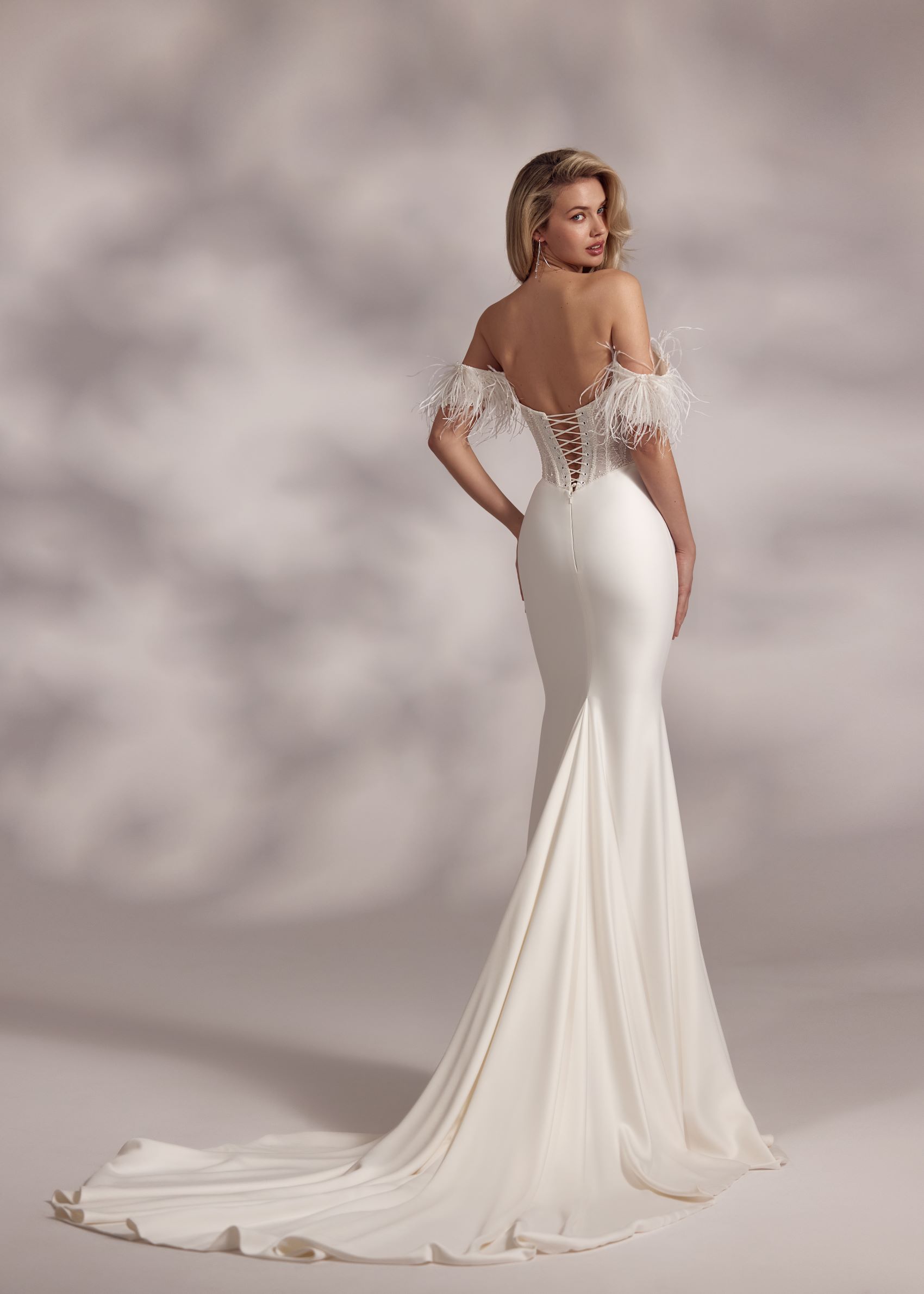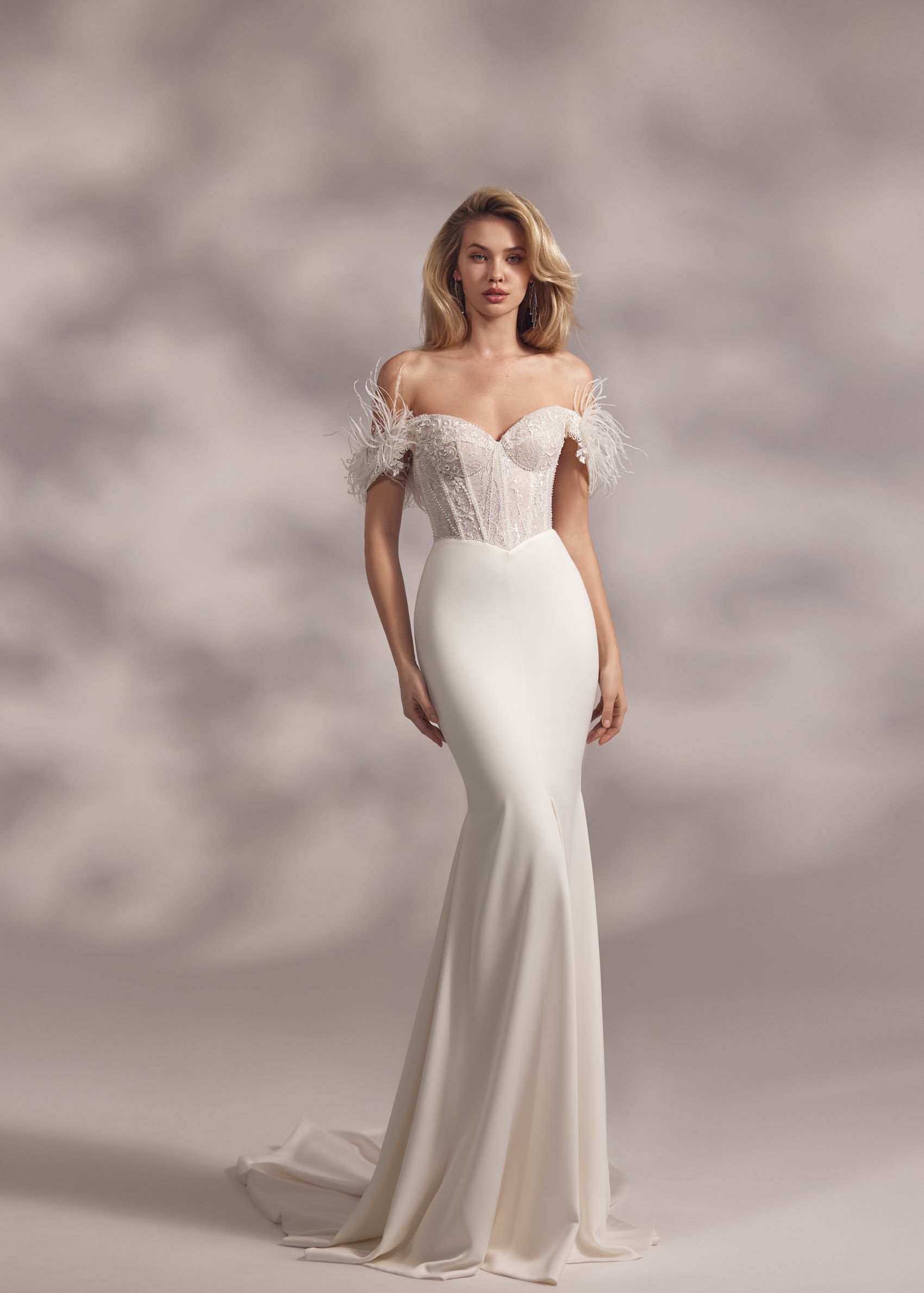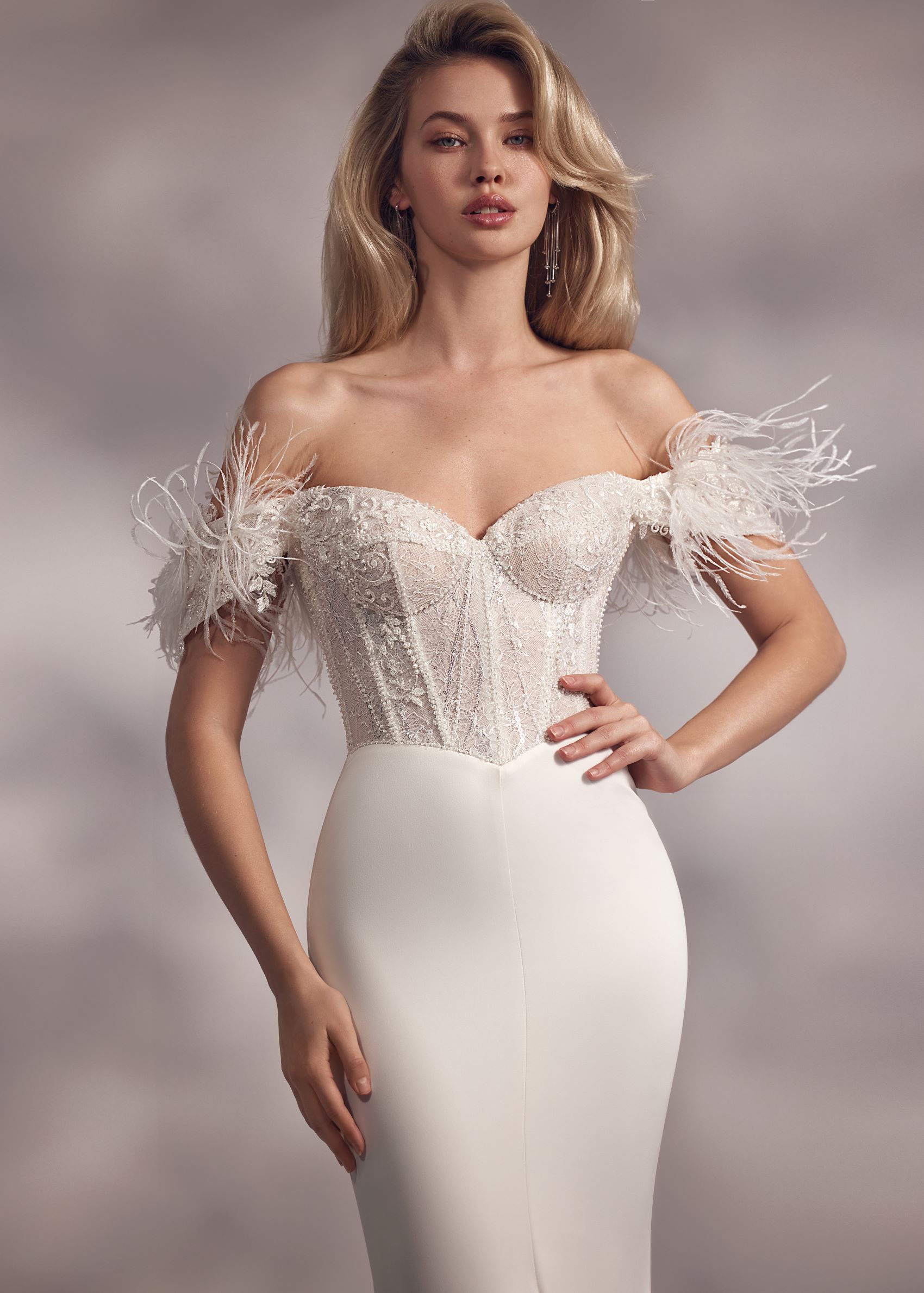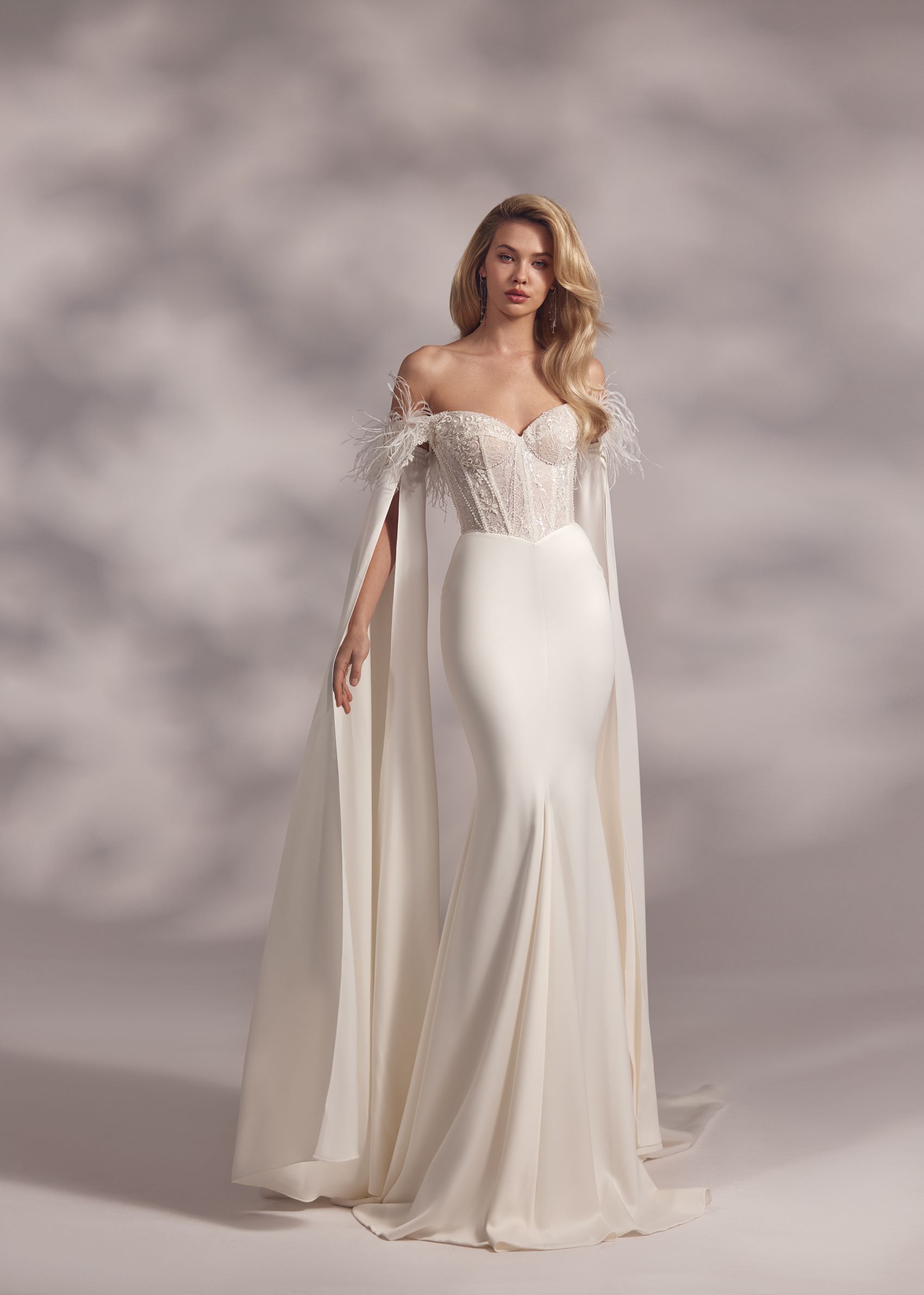 Seychelle – heart-shaped embroidered and beaded corset dress with basque waistline, mermaid tail smooth skirt and feathered cold-shoulder sleeves. The dress is complemented with detachable hanging sleeves.